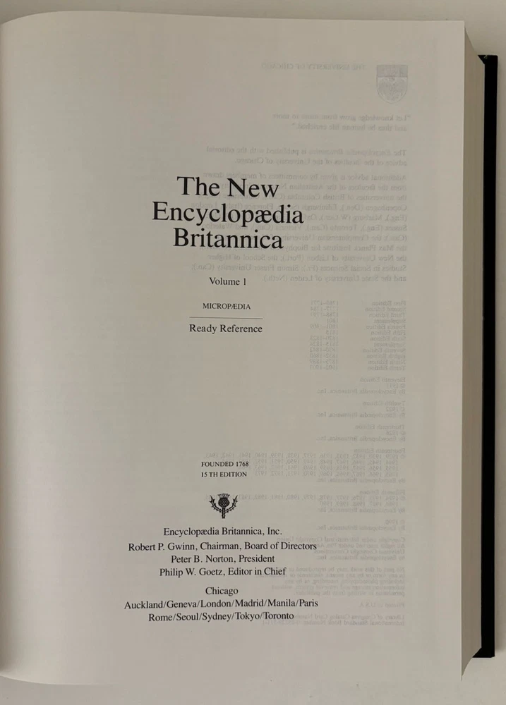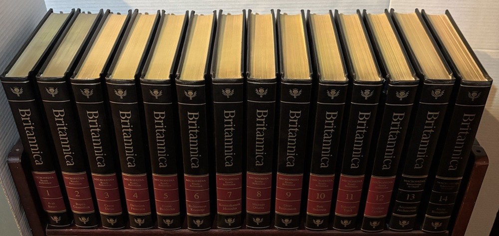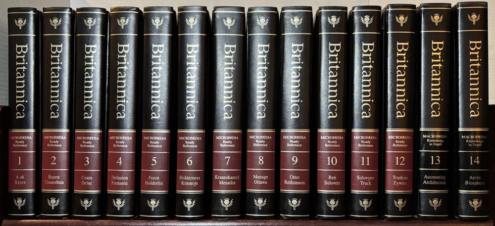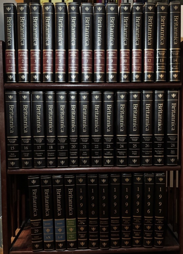 Encyclopedia Britannica Complete Set, 32 Volumes 15th Edition Padded Leather with 8 Annuals/Yearbooks in very good condition Annuals- 1990-91, 1993-1998 See photos...