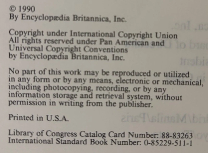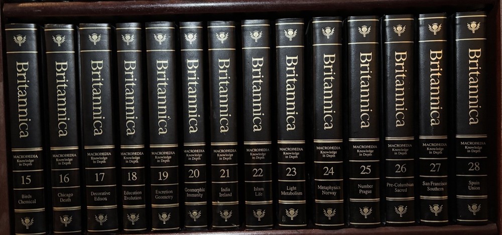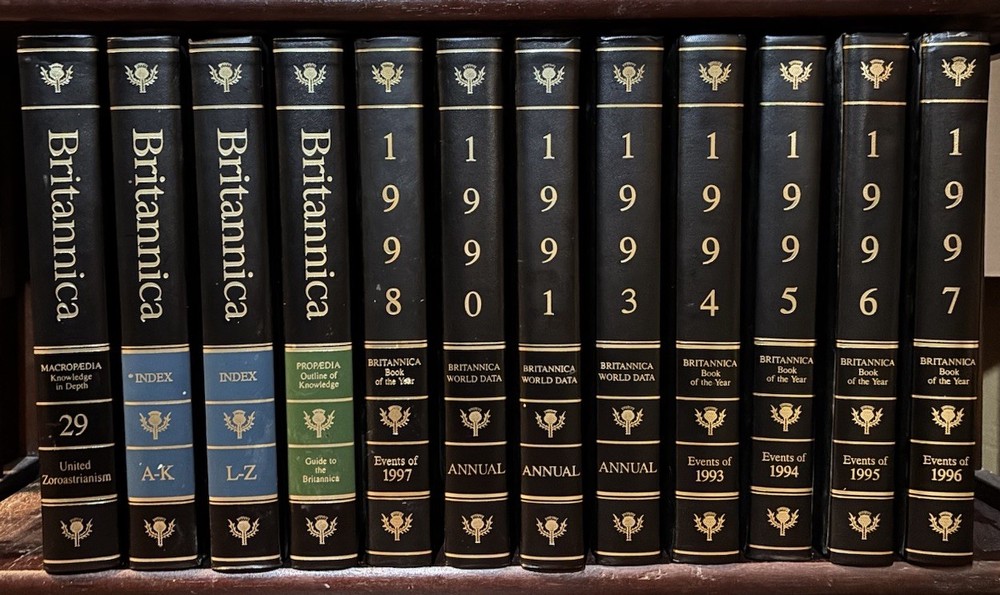 Encyclopedia Britannica Complete Set, 32 Volumes 15th Edition Padded Leather with 8 Annuals/Yearbooks in very good condition Annuals- 1990-91, 1993-1998 See photos