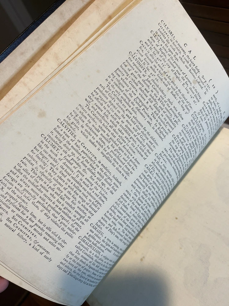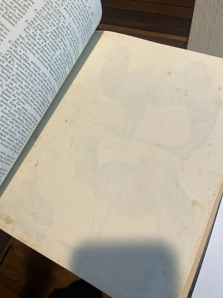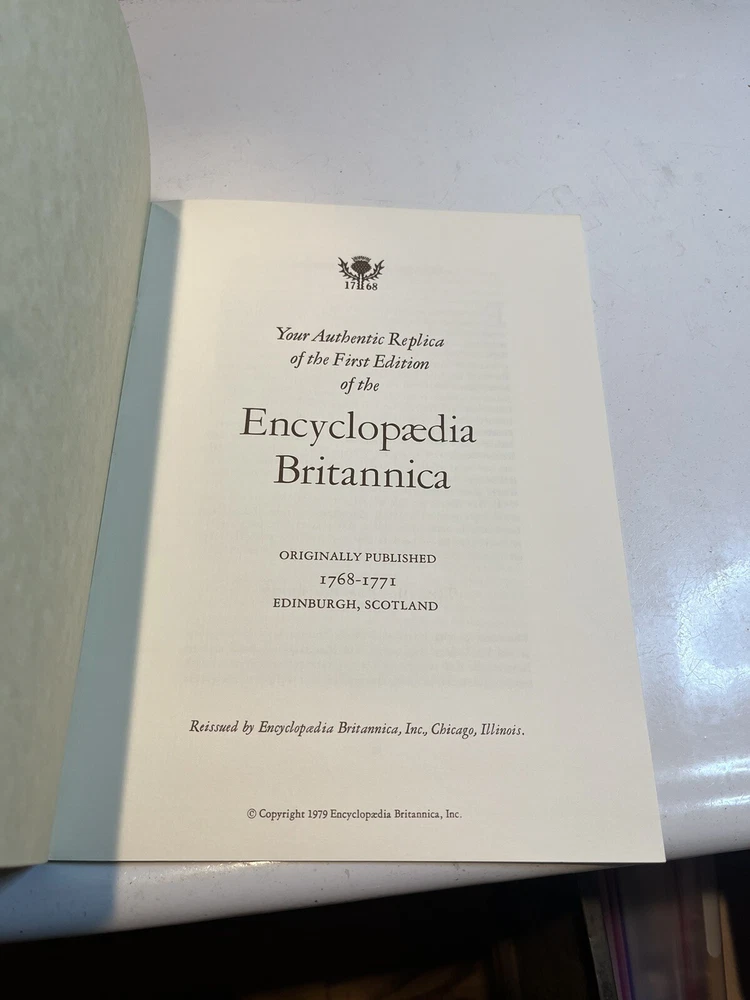 in very good used shape, these are the 1979 replica set. there are a few light scratches and the corners have light wear. Comes with original pamphlet. See photos for full condition. 3 volumes - complete set. Fine hardcovers bound in dark brown leatherette with gilt spinal lettering. Almost An exact facsimile of the First Edition, originally published in Edinburgh in 1771. Reproduces all of the original 160 copper plates and foldout tables and also reproduces the slight page foxing of the original copy. Although no date or place of publication is given other than the original date and place of publication (1771, Edinburgh), this is a 3-volume facsimile edition published in 1971 to commemorate the 200th anniversary of the publication of the original edition. Subtitled "A Dictionary of Arts and Sciences Compiled Upon a New Plan in which the different Sciences and Arts are Digeted into Distinct Treaties or Systems; And the Various Technical Terms, etc., are explained as they occur in the order of the Alphabet.". Antique book box 3: 12 Set of 1.2.3