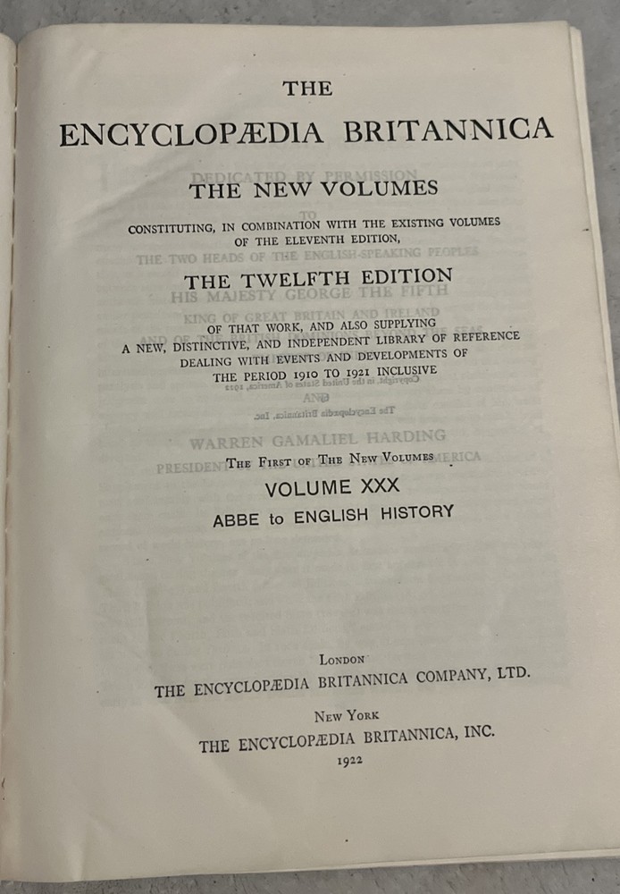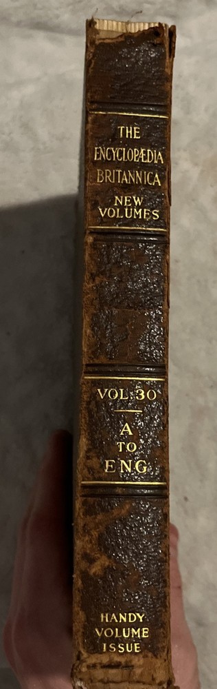 This antique set of Encyclopedia Britannica is the 15th Edition from 1922, featuring leather covers and a total of 30 volumes. Published by Encyclopædia Britannica, Inc in North America, this handy volume edition is illustrated and contains a wealth of information on various topics in English. It serves as a valuable reference tool showcasing the knowledge and insights of different authors from that era. Great shape for the age. No rips on pages. Does have some binding wear as seen in pictures.