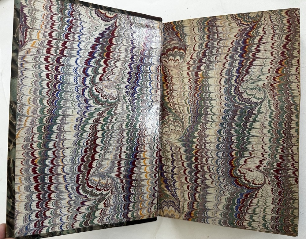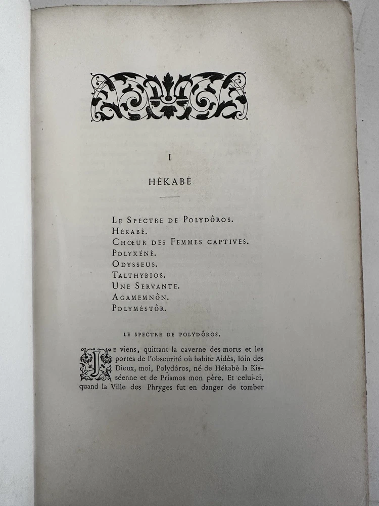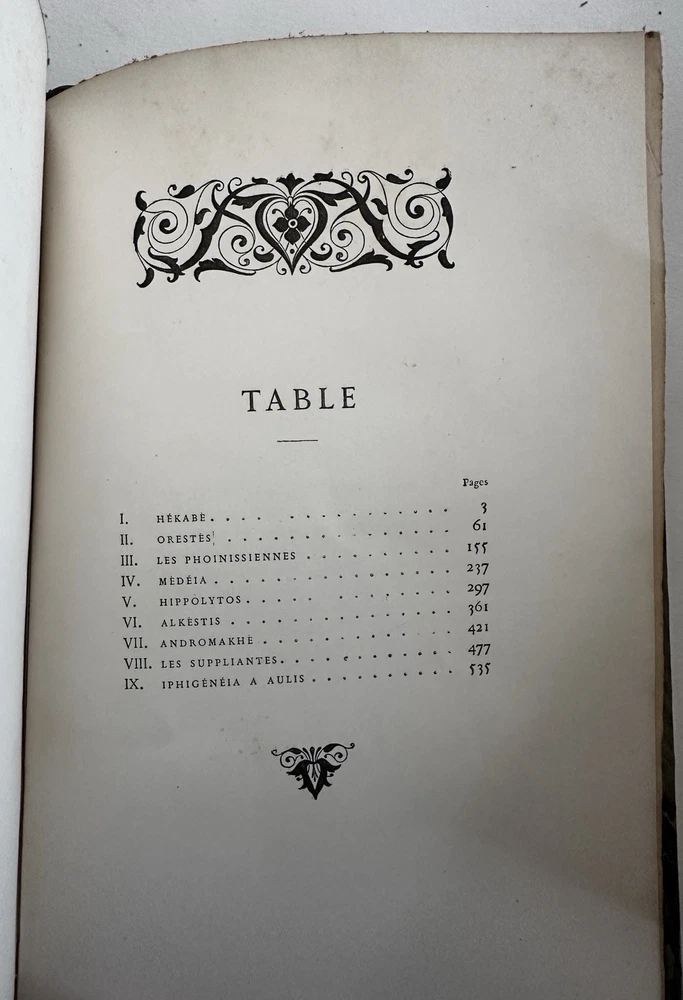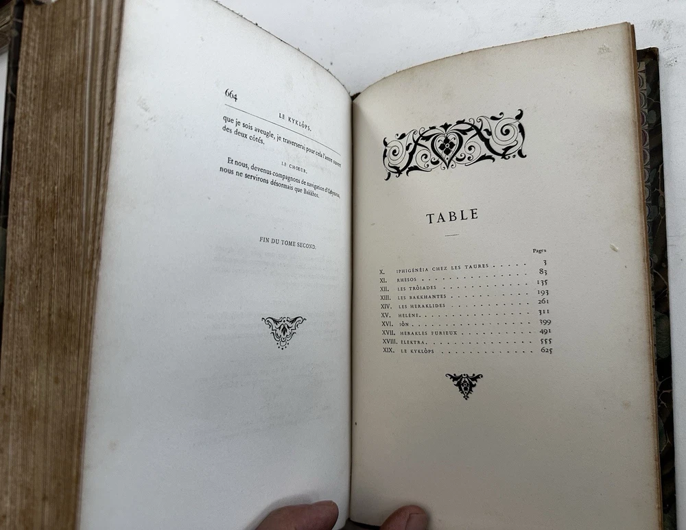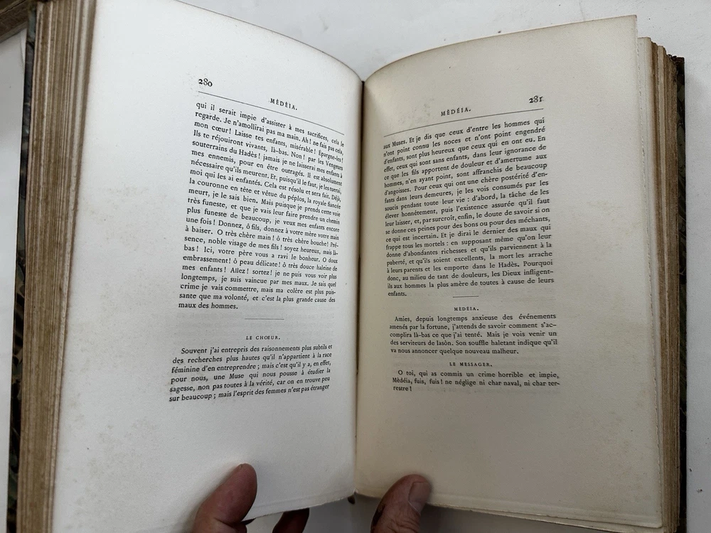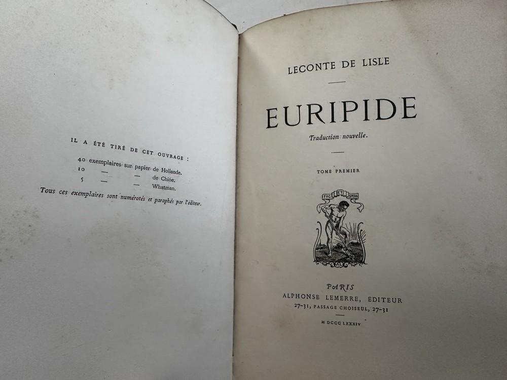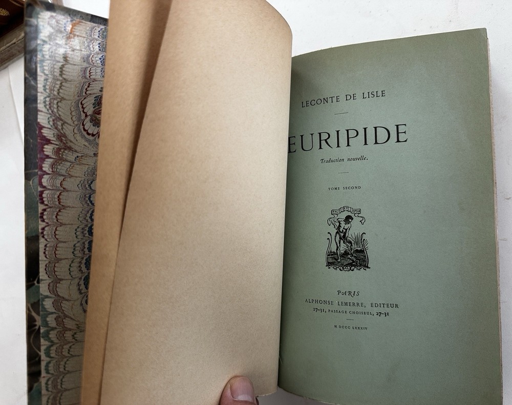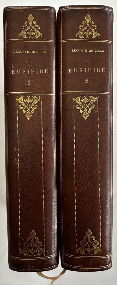 Euripides complete Works 1884 de Lisle beautiful French 2 vol leather set books Euripides complete Works 1884 de Lisle beautiful French 2 vol leather set books Euripide -[Euripides}- Traduction nouvelle- Issued Paris, 1884 by Alphonse Lemerre. Translated by Leconte de Lisle. Beautiful mid-19th century publisher’s 1/4 leather bindings, marbled boards and endpapers, t.e.g. Spines lightly uniformly age toned, minor surface scuffing or tiny scratches, leather remains supple, gilt bright, handsome set. Complete 2 volume set. Large thick heavy set. Measures c. 9 1/2" H x 6 1/4" W. B15371