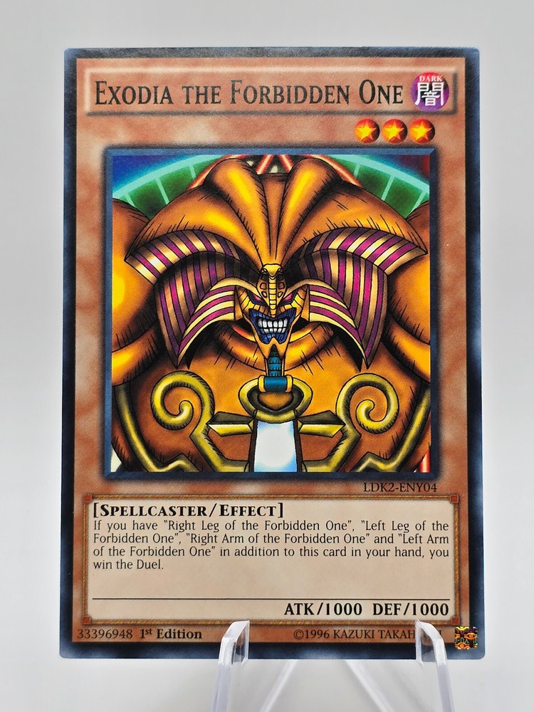 Yu-Gi-Oh - Exodia the Forbidden One, LDK2-ENY04, 1st Edition, Common, Near Mint Each set contains: A 40-card Deck based on Yugi's "Exodia the Forbidden One" and "Dark Magician", plus 3 Ultra Rare promotional cards (the tournament-legal versions of the Egyptian God cards) and an Ultra Rare Yugi Token card A 43-card Deck based on Kaiba's "Blue-Eyes White Dragon", plus an Ultra Rare Kaiba Token card A 43-card Deck based on Joey's "Red-Eyes Black Dragon" and Gemini monsters, plus an Ultra Rare Joey Token card 3 Secret Rare promotional cards: "Eternal Soul", "Dark Burning Attack", and "Dark Burning Magic". The Kaiba and Joey Decks each include the following: 3 Ultra Rare cards 40 Common cards 1 Token The Yugi Deck includes the following: 6 Ultra Rare cards 37 Common cards 1 Token The card will be shipped in a card sleeve, top loader and a team bag. All of these will be placed inside a semi sturdy card then envelope then shipped.