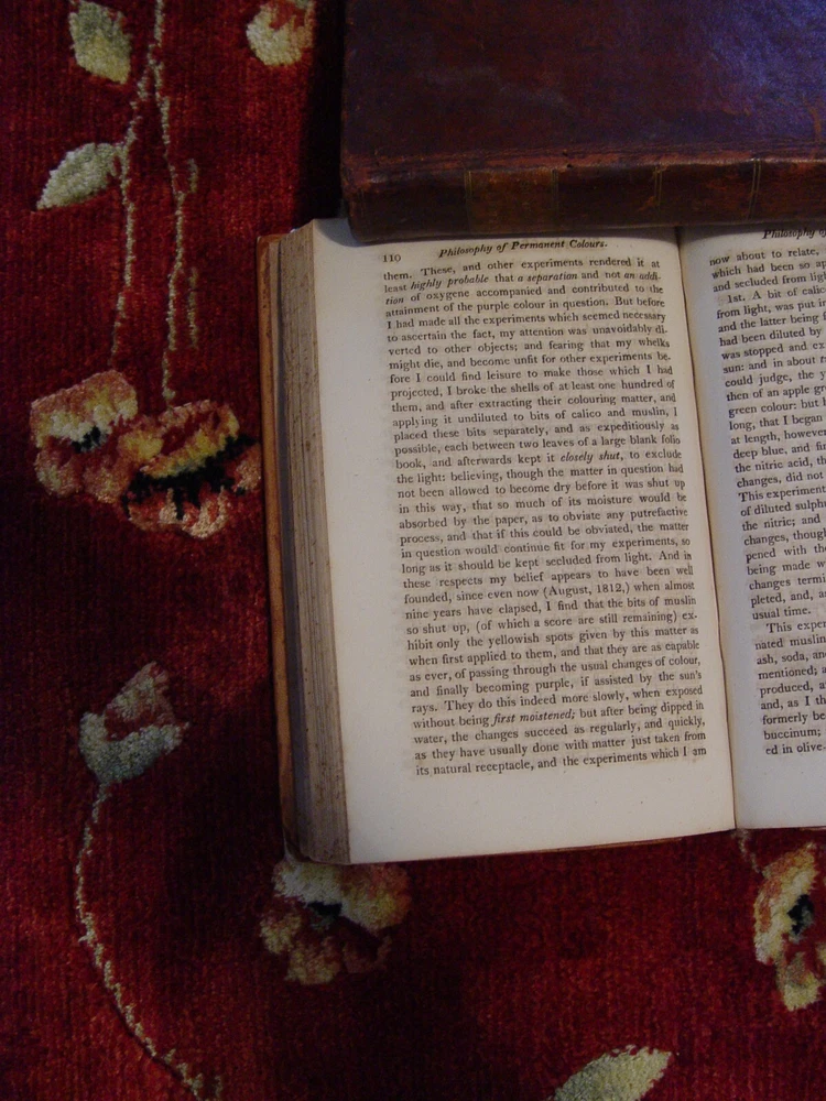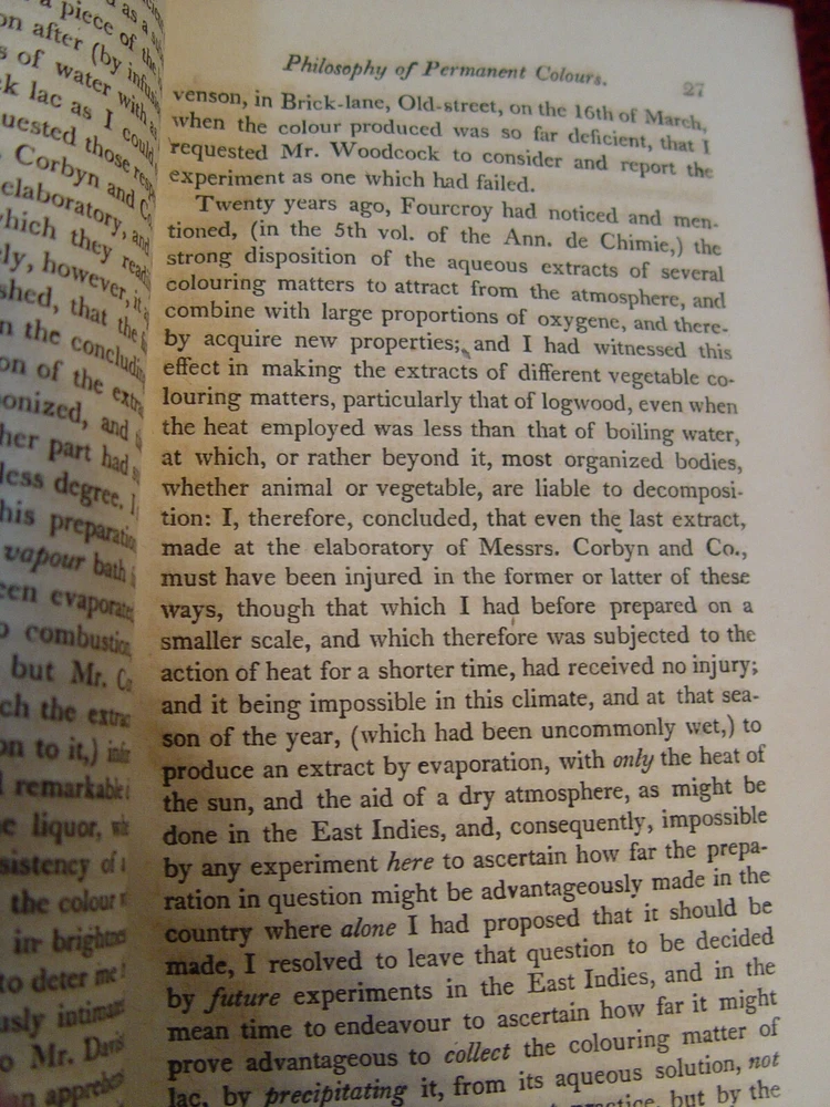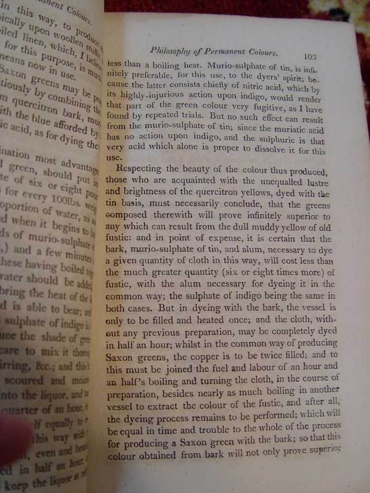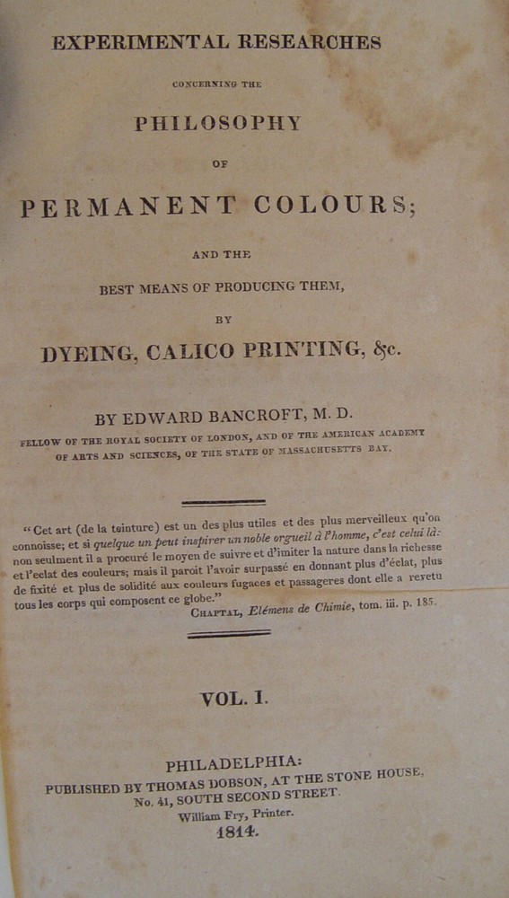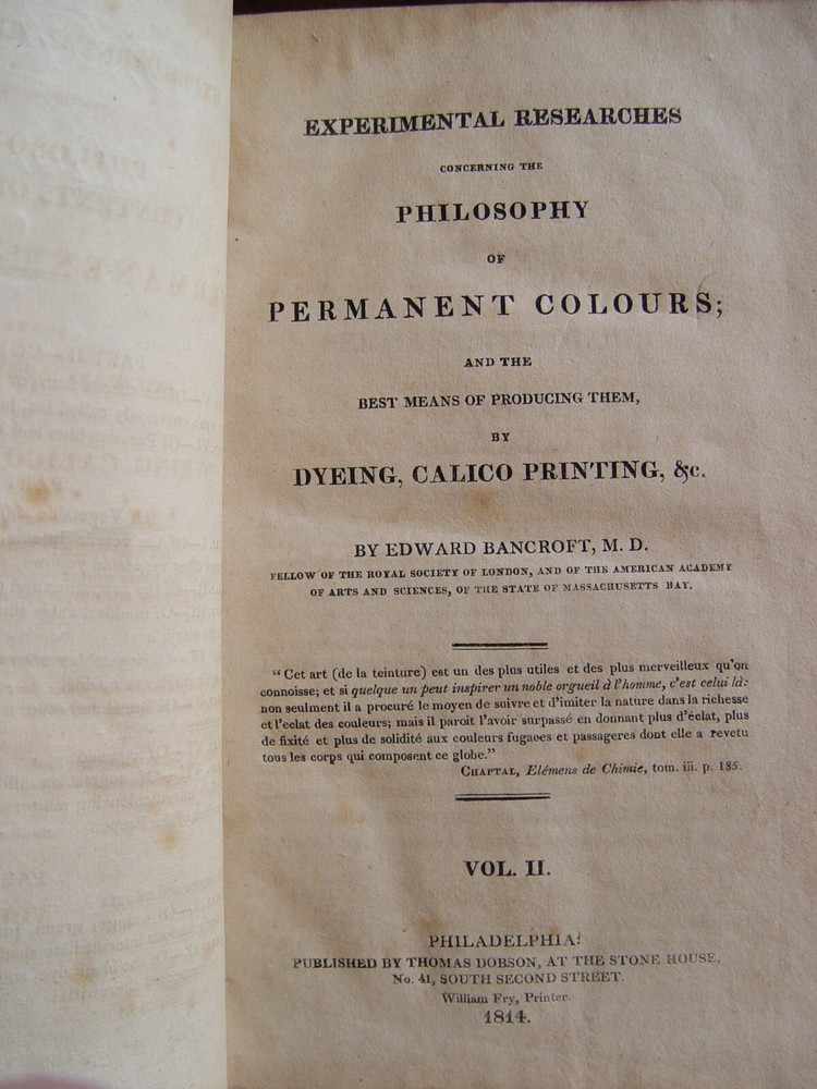 Fascinating set of antiquarian books on the history of color researches. They even contain the chemistry behind Tyrian purple, which was once punishable by death if anyone other than royalty dared wear it. 2 Volume Set complete 1814 Edward Bancroft, author Thomas Dobson of Philadelphia, Publisher Vol I: 399 pages Vol II: 393 pages
