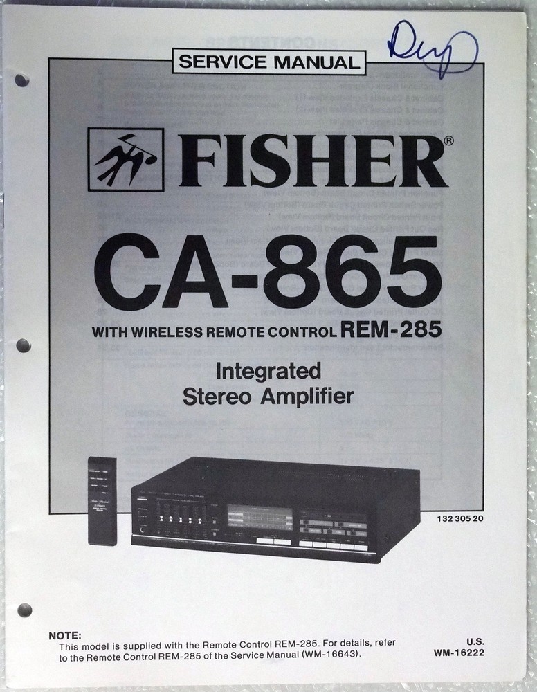 Fisher CA-865 Integrated Stereo Amplifier | Original Service Manual Complete Service Manual & Parts List | Also Covers the REM-285 Remote Control Publication No. WM-16222 | 1985 Fisher Corporation Official Service Manual of the Repair Shops! This is the Official Service Manual that the shop technicians use. This is the real thing - not a copy or cheap knock-off. This manual was written by the manufacturer for their service technicians specifically for the component(s) listed. This ensures you get the job done right the first time. This manual covers operating instructions, specifications, disassembly, re-assembly, adjustments, repair, schematics, wiring diagramss and complete parts list. It is very detailed with good diagrams, photos and exploded views. A must for anyone who insists on Genuine OEM quality parts. Condition Good condition (as pictured). Cover has been written on. All pages are in place and straight. Page surfaces are clean. Shipping Usually Ships within 24 hours. Excluding weekends and holidays. United States: U.S. customers will be provided with the following two shipping options: 1) USPS First Class Mail. For envelopes under 13 ounces only. This provides for an inexpensive shipping option if you are not in a big hurry. Delivery times vary. 2) USPS 2 to 3 day Priority Shipping anywhere in the United States for a flat fee. Rest of the World: We will ship anywhere in the world. Customers outside of the U.S. will be provided with one or both of these two shipping options - depending on size and weight: 1) USPS First Class International postage may be offered if the item weighs under 4 pounds and is of regular size. USPS First Class International may take up to 2 to 3 weeks for delivery. 2) USPS Priority Mail International. Canada and Mexico quotes 4 to 10 day arrival. The rest of the world quotes a 7 to 15 day arrival. We will be happy to combine shipping charges on multiple items purchased. Payment We accept Paypal and all Major Credit/Debit Cards. Please follow the checkout procedure. We will usually ship within 24 hours of your cleared payment (unless otherwise noted). Thank you. Returns Returns are gladly excepted if item is not as portrayed in the description. Let us know of your return before sending. Please include the original packing slip. Service you can expect You can expect timely, courteous and professional service from us; as well as lightening fast shipping. Here are some examples of what people are saying: "Thank you so much! Your timely response and professionalism are very much appreciated. I wish you the best!" "Thanks for the quick responses and fantastic delivery. The manual arrived today....WOW!" "Exactly as ordered. Got here almost as fast as if it were teleported!" Order Now Before Stock Runs Out!