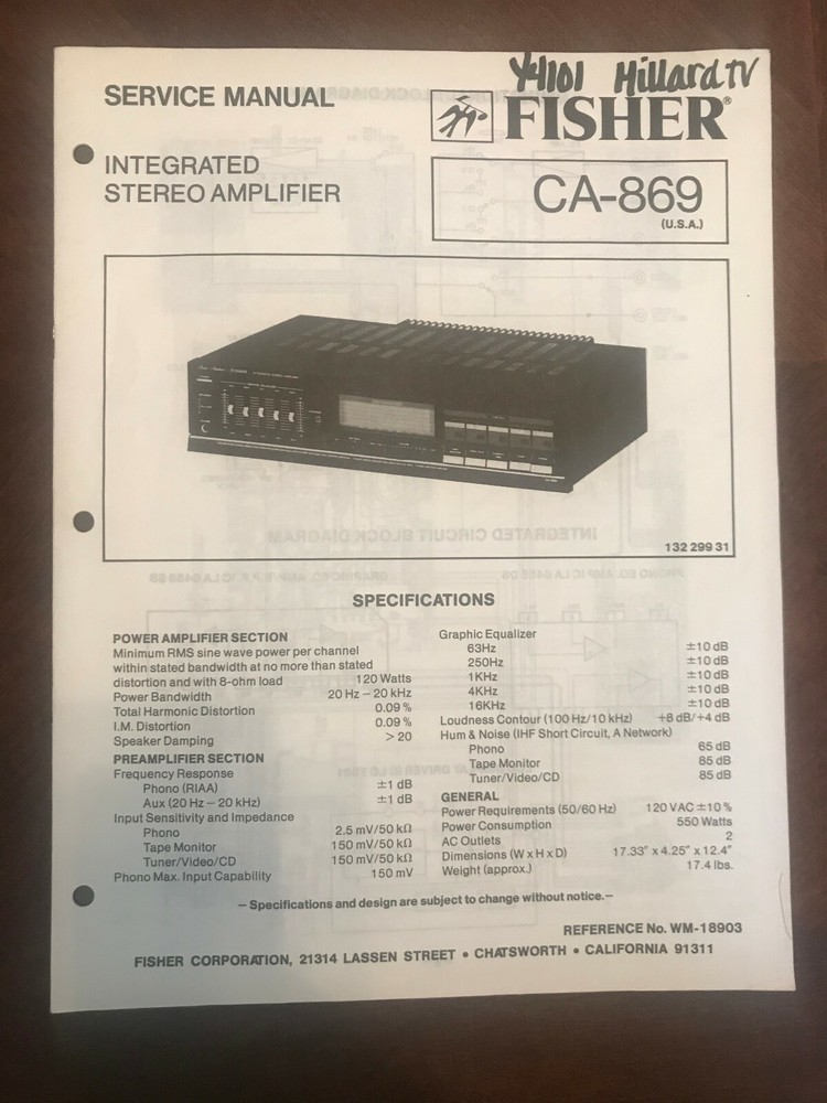This is for an original FISHER service MANUAL, includes REPAIR INFO, part numbers and SCHEMATIC DIAGRAMS MODEL - CA-869 STEREO AMPLIFIER Manual is in VERY GOOD CONDITION, Doesn't look like it was ever used. WE HAVE NO STEREO UNITS, OR AMPLIFIERS LEFT!!! THESE ARE ALL THE FISHER MANUALS WE HAVE LEFT. IF YOU DON'T SEE IT i DON'T HAVE IT. We closed out our electronic Service Shop a few years ago and are selling off the manuals we have left, some of which are manuals we acquired from other service centers that have closed.. Please check our other auctions for other closeout clearance items. I will be listing them as quick as I can but will probably take several months to list everything we have left. Item will be shipped in an envelope. Shipping is FREE in the 48 States only. $14.02 I nternational shipping. PLEASE check our other auctions. We Give free shipping in the U.S. for each additional manual purchased. Item will be shipped USPS economic shipping and may take 1-9 days. If you want faster shipping please let me know. ITEM IS SOLD "AS IS"! Thank You for the bid, and GOD BLESS THE U.S.A .