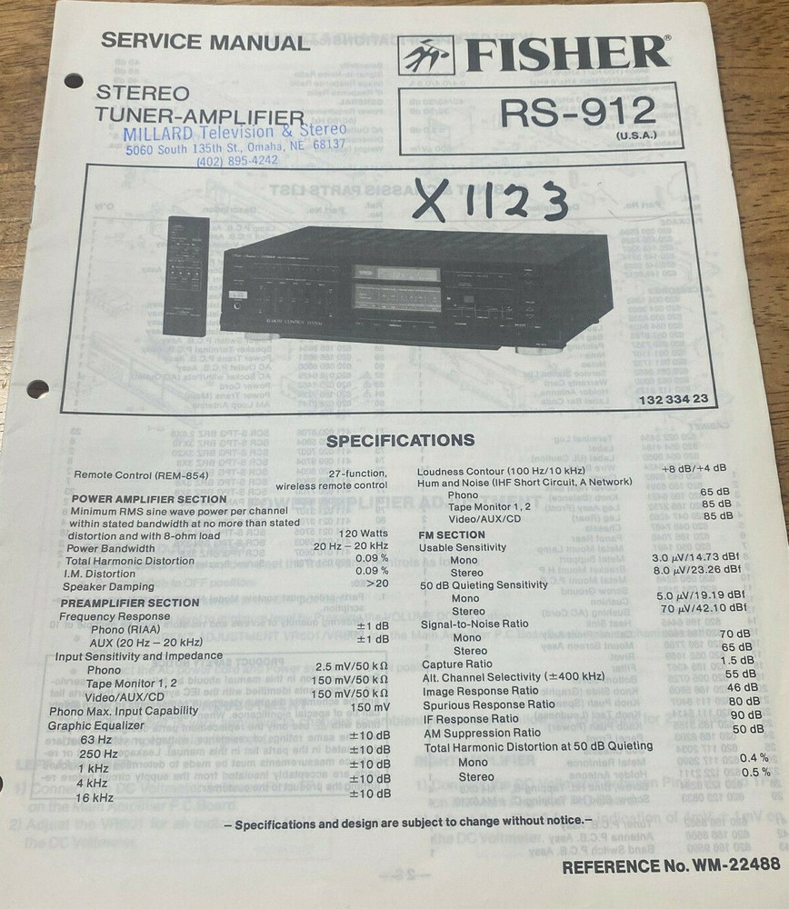 This is for an original FISHER service MANUAL, includes REPAIR INFO, part numbers and SCHEMATIC DIAGRAMS MODEL - RS-912 STEREO TUNER - AMPLIFIER VERY GOOD CONDITION, Doesn't look like it was ever used. WE HAVE NO STEREO UNITS, OR AMPLIFIERS LEFT!!! THESE ARE ALL THE FISHER MANUALS WE HAVE LEFT. IF YOU DON'T SEE IT i DON'T HAVE IT. We closed out our electronic Service Shop a few years ago and are selling off the manuals we have left, some of which are manuals we acquired from other service centers that have closed.. Please check our other auctions for other closeout clearance items. I will be listing them as quick as I can but will probably take several months to list everything we have left. Item will be shipped in an envelope. Shipping is FREE in the 48 States only. $14.02 I nternational shipping. PLEASE check our other auctions. We Give free shipping in the U.S. for each additional manual purchased. Item will be shipped USPS economic shipping and may take 1-9 days. If you want faster shipping please let me know. ITEM IS SOLD "AS IS"! Thank You for the bid, and GOD BLESS THE U.S.A .
