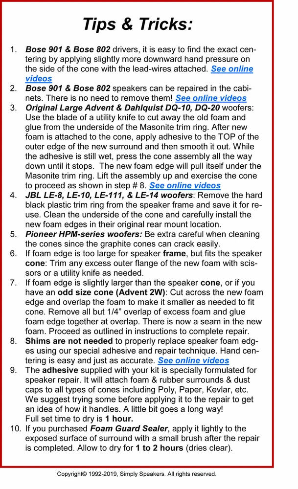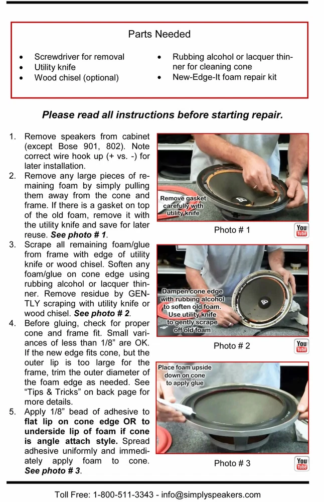 Home About Us Store Policy Contact us Repair Videos FAQs New-Edge-It Foam Kits by Brand New-Edge-It Foam Kits by Size Diaphragms Speaker Reconing Kits Speaker Grills & Grill Cloth Passive Radiators Repair Kits For Bose 901 & 802 Speaker Accessories Pro Grade Adhesives Rubber Edge Kits Speaker Dust Caps Speaker Gaskets Send Speakers To Us For Repair Spiders & Misc. Parts Tweeters Midranges Woofers Specials Ferrofluid Kits Factory Parts Leadwire Repair Kits Fuses and Bulbs New-Edge-It Speaker Repair Kit Store Newsletter Add Simply Speakers to your Favorites to receive our email newsletters about new items and special promotions Sign Up FISHER Speaker 12" ST-440,450,456A,661,920 Woofer Foam Edge Repair Kit # FSK-12F Item Description The most common problem with speakers are rotted, torn or damaged surrounds. The surround is the outer suspension part of the cone. Constant vibration, time and the environment cause foam and rubber surrounds to degrade. Cloth and paper surrounds can become brittle. This causes distortion and poor performance. Luckily, our easy to install repair kits will make your old speakers sound just like new! New-Edge-It® speaker repair kits. America's # 1 brand since 1992. See Product Description, Title or the "Fits Models" tab to see speakers listed for this repair kit. Repair kit includes: 2 x made in USA foam surrounds: Outer diameter: 11.625" (295mm), Roll outer diameter: 10.625" (270mm), Cone diameter: 9.375" (238mm), Inner diameter: 8.9375" (227mm) Flat attach Exact dimensions can also be viewed in the photo gallery 1 x MI-3035 rubber based repair adhesive 1 x applicator brush Easy to follow color illustrated instructions FREE technical support and online videos Product Overview: Brand new formula made in USA surrounds last much longer than the originals. We ship the same high quality parts used in the pro audio repair market. We do NOT use generic glues or low quality imported surrounds like others sell. Our exclusive clear drying rubber based repair adhesive is designed for paper, poly, and composite cones. Dries flexible, strong and clear. Kits can be installed without removing the dust caps. Dust caps, shims and gaskets are available for most models if needed. Access to our complete library of how-to speaker repair videos. Fast and FREE shipping to any USA address and worldwide shipping. Economical and environmentally friendly. Save money AND save your speakers. Simply Speakers® - Quality Speaker Parts since 1992! Shipping Info Shipping Info Terms & Conditions About Us Testimonials FAQ Shipping Info We ship all orders within 24 hours of receipt of payment. Most orders ship same day. Weekends & holidays excluded. The address provided by eBay or PayPal will be used for shipment. We are not responsible for wrong or un-deliverable addresses. BE SURE YOU HAVE CORRECT ADDRESS ON FILE! We cannot change the address once your order has been processed through eBay. Please note: Saturday, Sunday and all major holidays do NOT count as shipping days. We ship worldwide (with the exception of a few countries listed on our eBay excluded list) Import taxes, duties, fees, or other charges are NOT included in the item price or shipping charges and are the sole responsibility of the buyer. We will not mark down invoices or claim items as "gifts" or otherwise assist in deceptive international shipping practices. SS Audio speaker foam edge repair kits, diaphragms and other qualified items shown in our listings ship to the USA for free. Free shipping method will be US Mail First Class or Priority service depending on weight and zone. Some items may not quality for free shipping. Shipping charges will appear for those items. Simply Speakers, SS Audio and the US Mail do not guarantee shipping transit times unless special arrangements are made and paid for prior to shipment. If you need overnight or other expedited service please contact us prior to placing your order or choose those options when you checkout. Terms & Conditions Terms & Conditions Please take special care to order carefully and completely. We have thousands of speaker repair parts in stock and not all models are listed for every part we sell. In some cases, you will need to verify the correct parts by removing the defective component from your system first and prior to ordering to determine which model you have. You may need to measure a part of your speaker to determine if the replacement part is compatible. We can help you in determining which parts you need. Please contact us. See our FAQ page for other frequently asked questions. We may ask you to email a photo of your speaker to us for verification. Ask all questions before placing an order. When buying one of our products please note that the item is sold only for the described purpose. We will replace, or exchange only those products which are deemed to be incomplete or defective by a company representative. We gladly accept the return of products that are defective due to defects in manufacturing and/or workmanship for 30 days from the date of purchase. Items that have been mis-ordered or are no longer wanted may be returned for refund or exchange within 30 days from the date of purchase at customer expense. Please note: FREE SHIPPING ITEMS may have our shipping cost deducted from any refunds due to orders made in error, or that are no longer wanted. Returned items must be in new saleable condition with all packaging and contents. Units showing signs of use, ie. solder or screw marks or scratches cannot be returned. A restocking fee may apply. In most cases, no RMA is required, simply include a copy of the sales receipt with your return along with a brief description of the issue. Special order items are NOT returnable. Speakers and parts showing signs of mis-use, overpowering, underpowering (distorted), malfunctioning amplifiers, or improper crossovers will not be covered under warranty. Speakers or parts with burnt voice coils, blistered voice coils, torn con