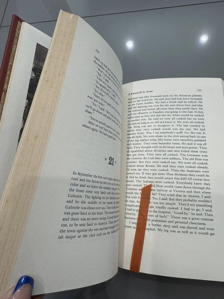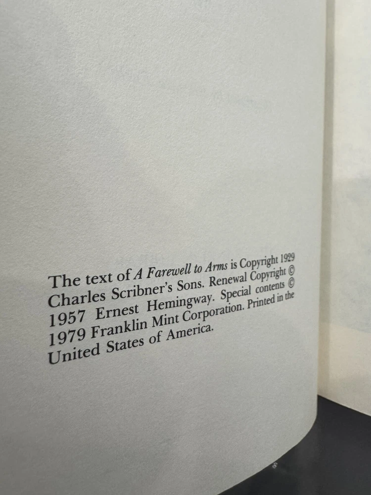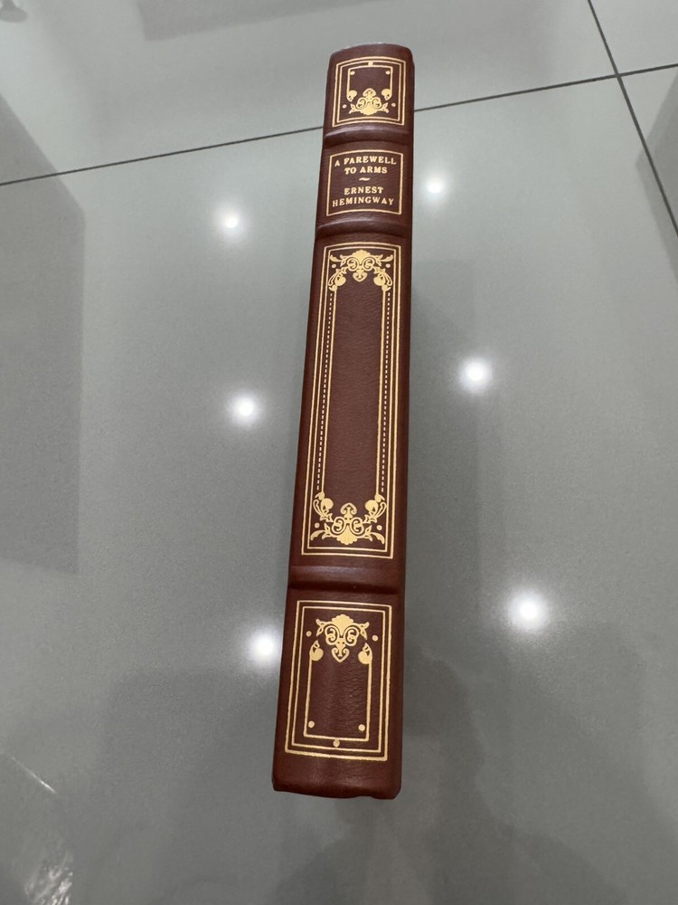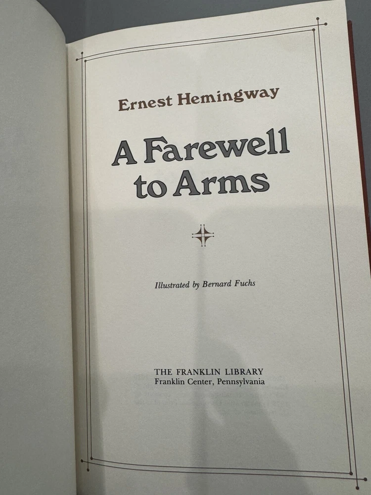 Good condition The product is a luxury collector's edition of Ernest Hemingway's "A Farewell to Arms" published by The Franklin Library in 1979. It is a limited edition 1st edition book with illustrations by Bernard Fuchs. The binding is 1/4 leather and the book is in English. It is part of the Character Family of Ernest Hemingway and is a unique and valuable addition to any literature enthusiast's collection.