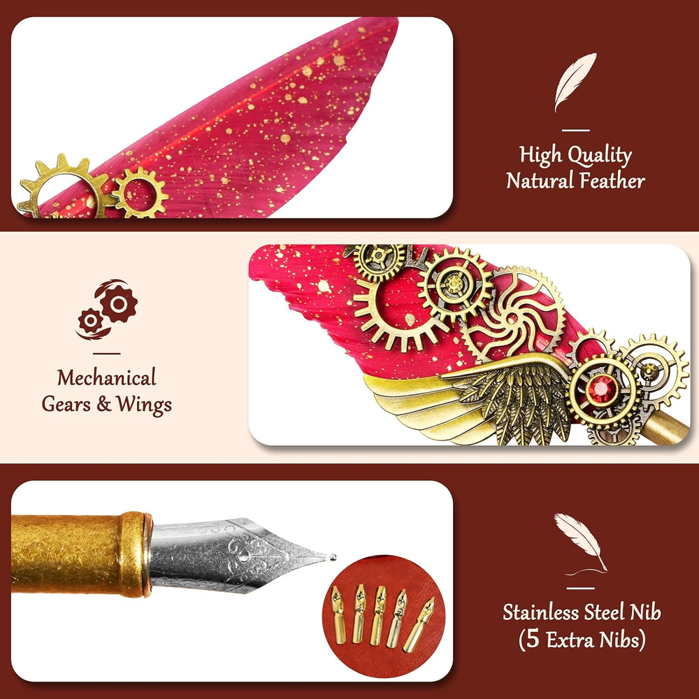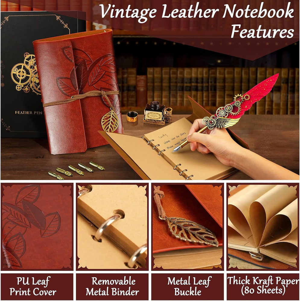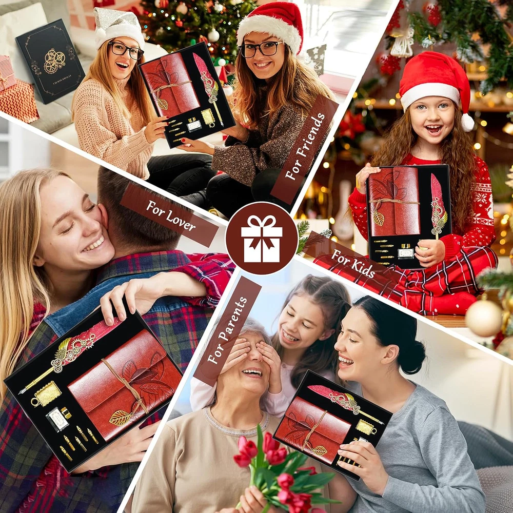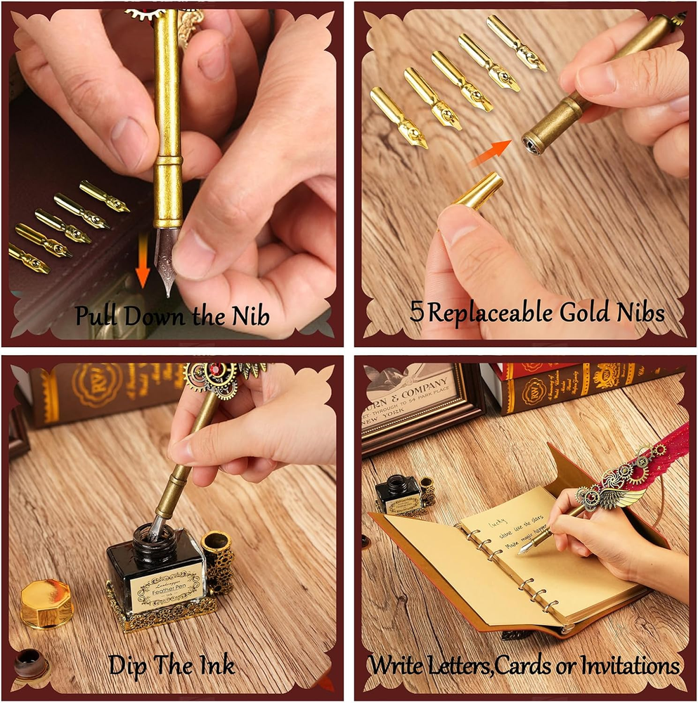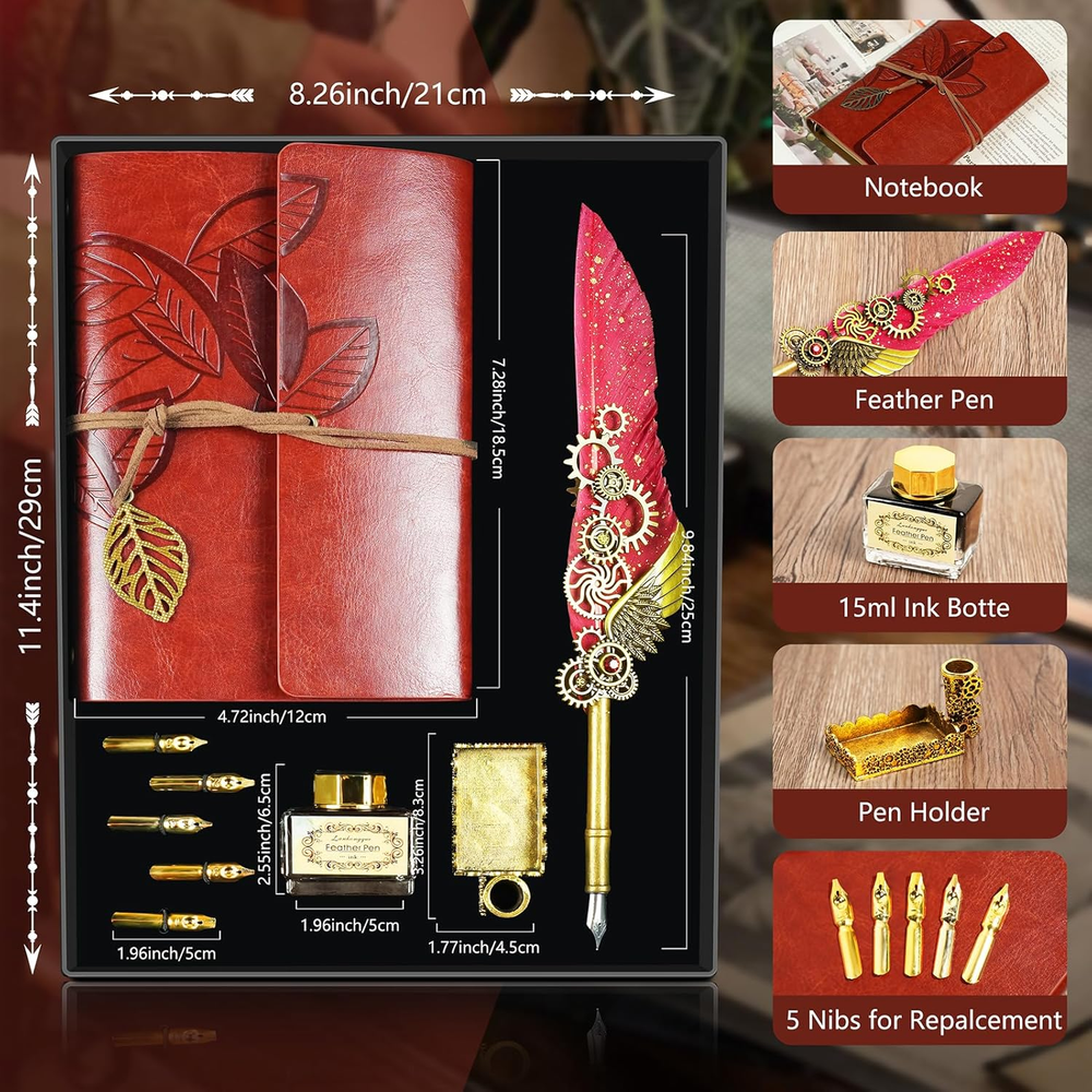 Store New Arrivals Add to Favorite View Feedback Contact Feather Quill Pen and Ink Set,Antique Calligraphy Set with Leather Journal Notebook,Feather Pen,5 Gold Nibs,Pen Holder,Ink,Calligraphy Kits for Beginners Christmas Gift Description Item model number CP-DB Item Weight 1.41 pounds Writing Instrument Form Dip Pen Pencil Lead Degree (Hardness) B Color Black Material Type Wood Brand GrnVibe Line Size 0.3mm Grip Type Smooth Manufacturer Part Number CP-DB Ink Color Black Manufacturer GrnVibe Age Range (Description) Adult Size 1 Count (Pack of 1) Point Type Fine Package Dimensions 11.42 x 8.46 x 1.46 inches Number of Items 1 Quill Pen and Ink Set:Includes 1*feather pen,1*leather notebook,1*bottle of black Ink,1*pen holder,5*stainless steel replaceable nibs,the vintage calligraphy pen set has everything you need. High Quality Feather Pen:Our feather dip pen ensure smooth writing and control,featuring unique,naturally feathers.Perfect for writing journal,diary,letters,greeting cards and calligraphy. PU Leather Notebook:The calligraphy pen gift set includes a leather journal with leather cover and metal leaf buckle,with 80 thick kraft blank sheets.Perfect calligraphy kits for beginners for writing. Vintage Decor & Writing:The fountain pen set is ideal for calligraphy practice and pairs with a 2-in-1 function pen holder as the vintage decor for your study. Multi-function Quill and Ink Set:The feather pen calligraphy set is perfect for signing documents,drawing,or writing on our vintage leather journals,as well as writing letters and cards. Perfect Gift:This vintage feather dip pen set is a meaningful gift for beginners or calligraphy enthusiast,perfect for birthdays,Christmas or Thanksgiving—for friends,family,students or lovers. Product Description Vintage Feather Quill Pen and Ink Set This notebook feather pen set is ideal for beginners and as home vintage decor.It's perfect for writing or practicing calligraphy on our leather bound journal,signing documents,making it a unique gift for birthdays,Christmas,Thanksgiving,Valentine's Day and more. Quill Pen and Ink Set The calligraphy pen set includes:1*feather pen,1*leather notebook,1*bottle of black Ink,1*pen holder,5*stainless steel replaceable nibs Smooth & Comfort Writing The feather calligraphy pens include five stainless steel gold nibs for smooth writing and even ink flow,offering excellent control and durability. Vintage Leather Nothbook The leather notebook journal features nice leaf pattern and metal leaf buckle,with removable metal binder and 80 thick kraft blank sheets,easy fpr replacement and reuse. Personal Writing & Vintage Decor This dip pen set is perfect for as calligraphy kits for beginners,handwritten wedding or birthday invitations,leather journal for men/women,and serving as indoor vintage decor. Calligraphy Pen Gift Set The feather quill pen and ink set is the best gift choice for kids,friends,parents,lovers on Christmas,Thanksgiving,Birthday.Perfect pen gift set for your loved ones. ABOUT US We offer the best prices around on high quality products. Our E-store includes media such as books, movies, music and games while offering electronics, toys, sporting apparel, clothing, tools, general home, garden items and more. SHIPPING We are always working hard to ensure your package arrives as soon as possible. Please understand that some factors like weather, high postal traffic, and the performance of shipping companies are outside of our control. We offer free shipping to the lower 48 states and ship within 2 business days of payment, usually sooner. We do not accept P.O. Boxes. Please provide a physical address. RETURNS We offer a 30-Day Return Policy on items which you are not completely satisfied with. You have the option for a full-refund or an exchange of the item. No returns are available on items shipped outside of the USA. PAYMENT We accept PayPal. CONTACT US This page content is yet to come Please ad us to your favorite seller and visit again later Thank You CUSTOMER SATISFACTION We try our very best to make sure every customer is completely satisfied. If there's a problem, message us! We're happy to help.