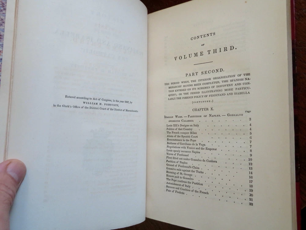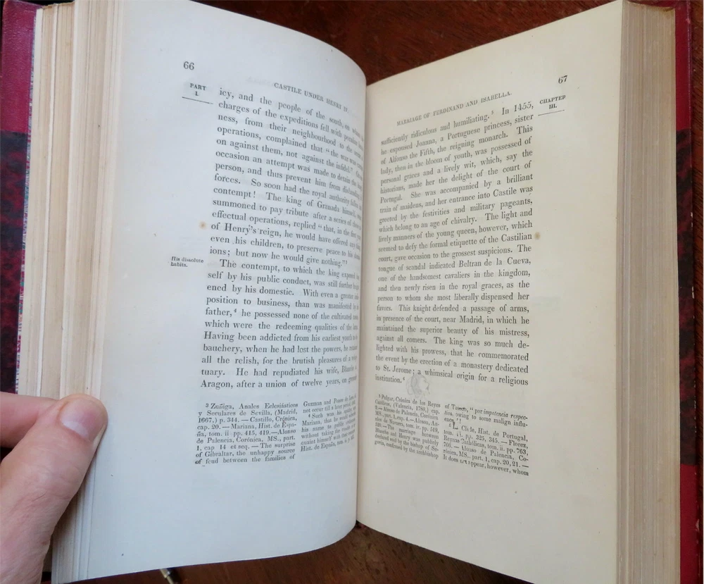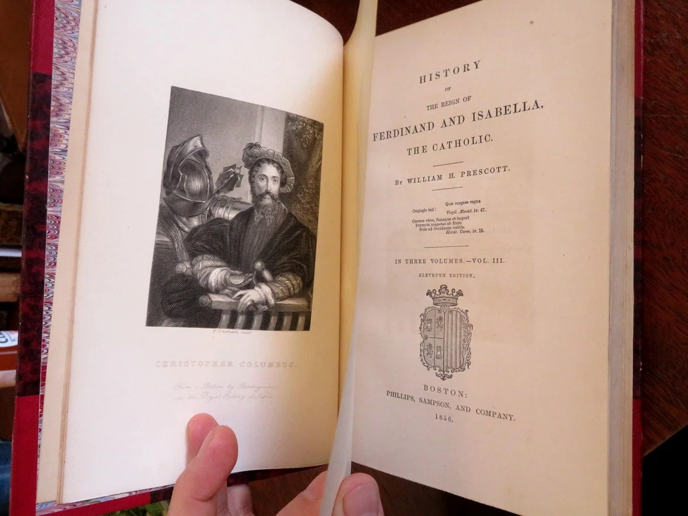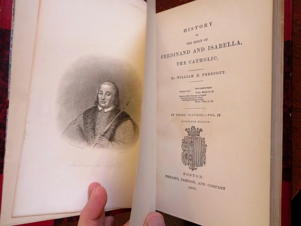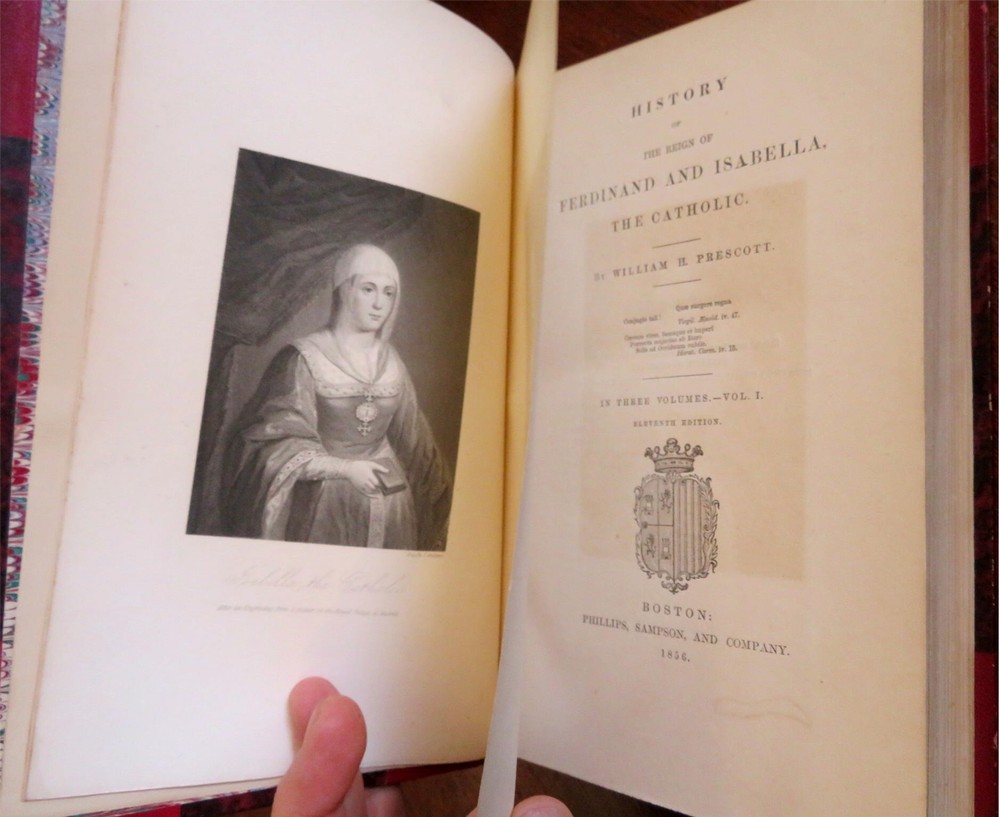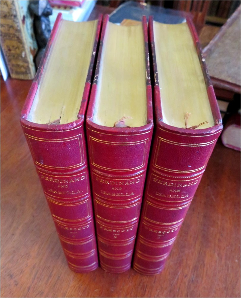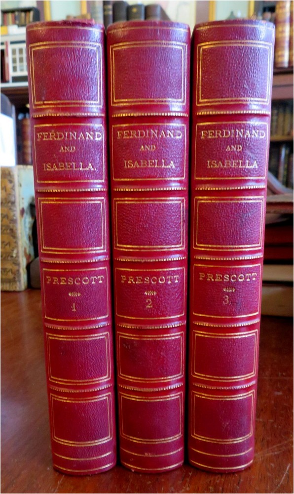 Ferdinand & Isabella Spanish Monarchs 1856 Prescott leather 3 volume set Ferdinand & Isabella Spanish Monarchs 1856 Prescott leather 3 volume set (Old Books, 19th Century Books, Leather Books, European History, Spain, Ferdinand & Isabella, Leather Sets). History of the Reign of Ferdinand and Isabella the Catholic, by William H. Prescott. Published 1856, Boston by Phillips, Sampson and Company. 3 volumes, each c. 400-500 pages. Text in English. Attractive antiquarian 1/2 leather bindings, slightly raised & gilt bands, gilt title lettering, gilt ruled compartment decorations, marbled covers & end papers. Set is physically old and shows some signs of handling and time. Bindings gently age worn but still appealing, leather and joints slightly rubbed but still supple, set remains overall very attractive as an object. Text block paper is gently age toned as typical, internally set remains mostly clean, tight and sound. A set which has been taken care of but may/ does not look like new. Still attractive on the shelf. Set displays a pleasing and unique age patina and is in rather nice antiquarian condition, any age flaws seem easy to overlook or forgive. Please review photos for more detailed attempt to present this set as it survives. We often over-describe any flaws that many sellers would not even bother to mention since most people would overlook them as minor and unworthy of comment. Many people tell us the books they receive from us are nicer in person than they appears on the screen. We want you to be clear about what you are buying, so we take numerous photos and try to describe it openly and honestly. Books Measure c. 9 1/2" H x 6" W. [B8967].