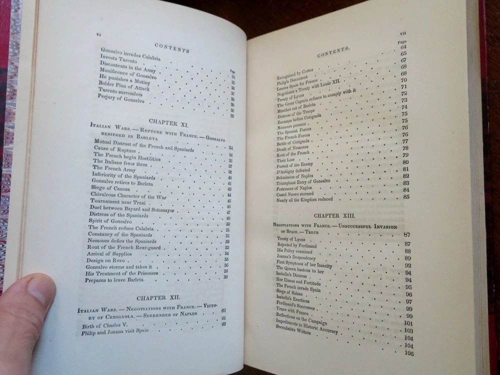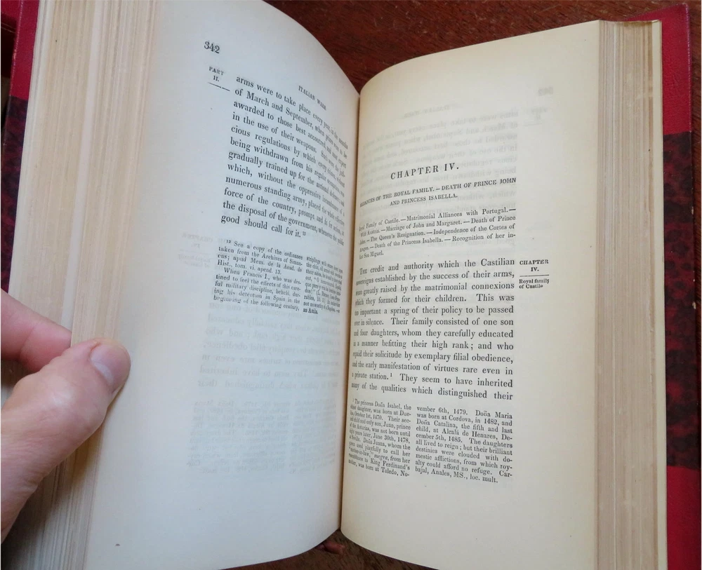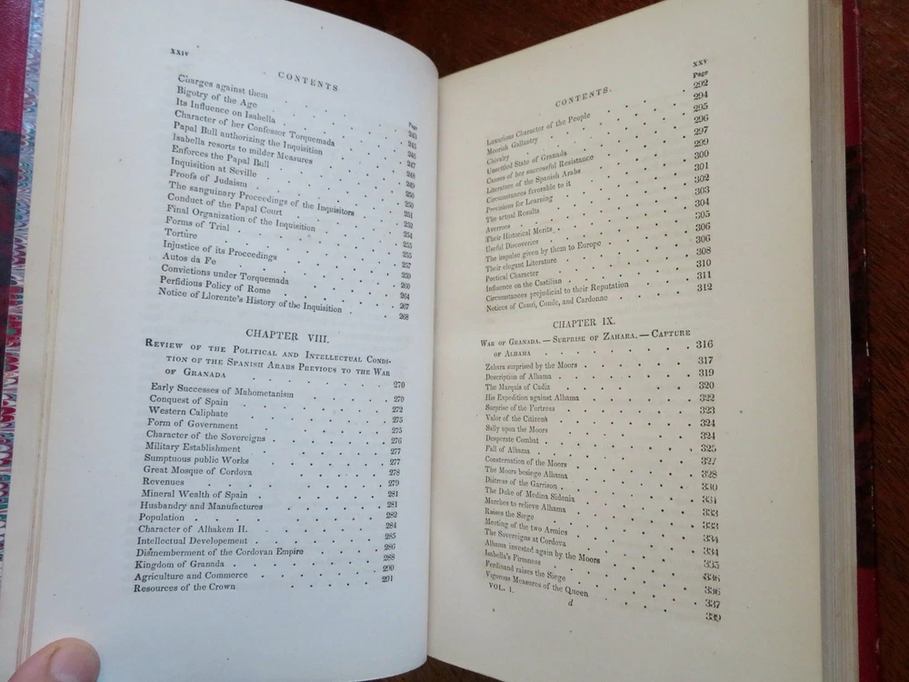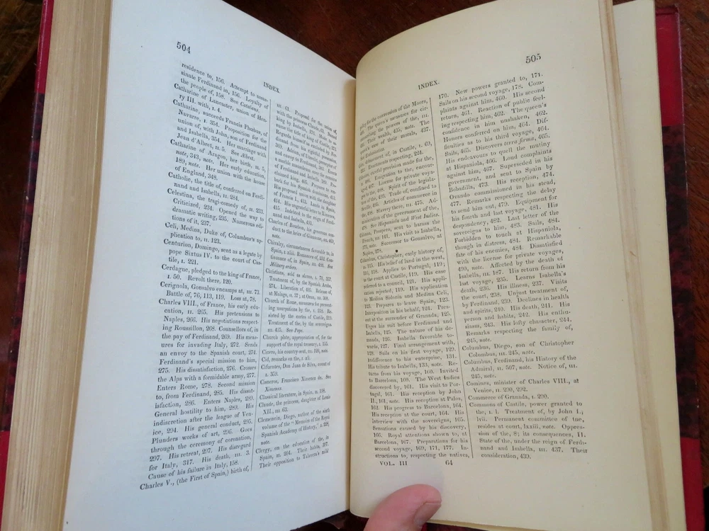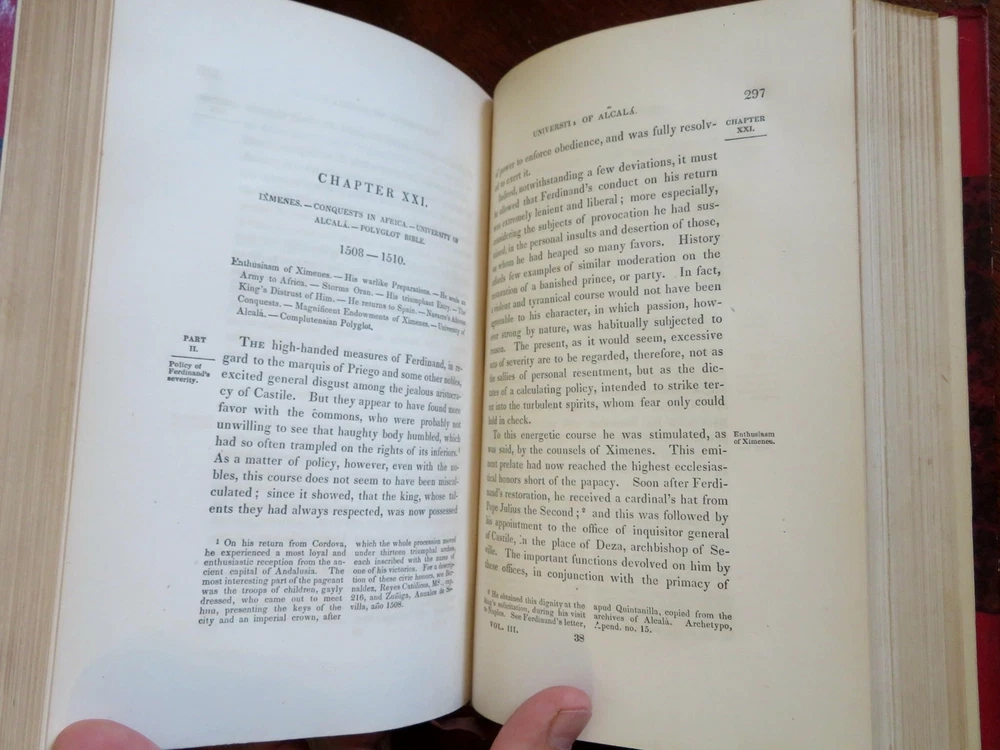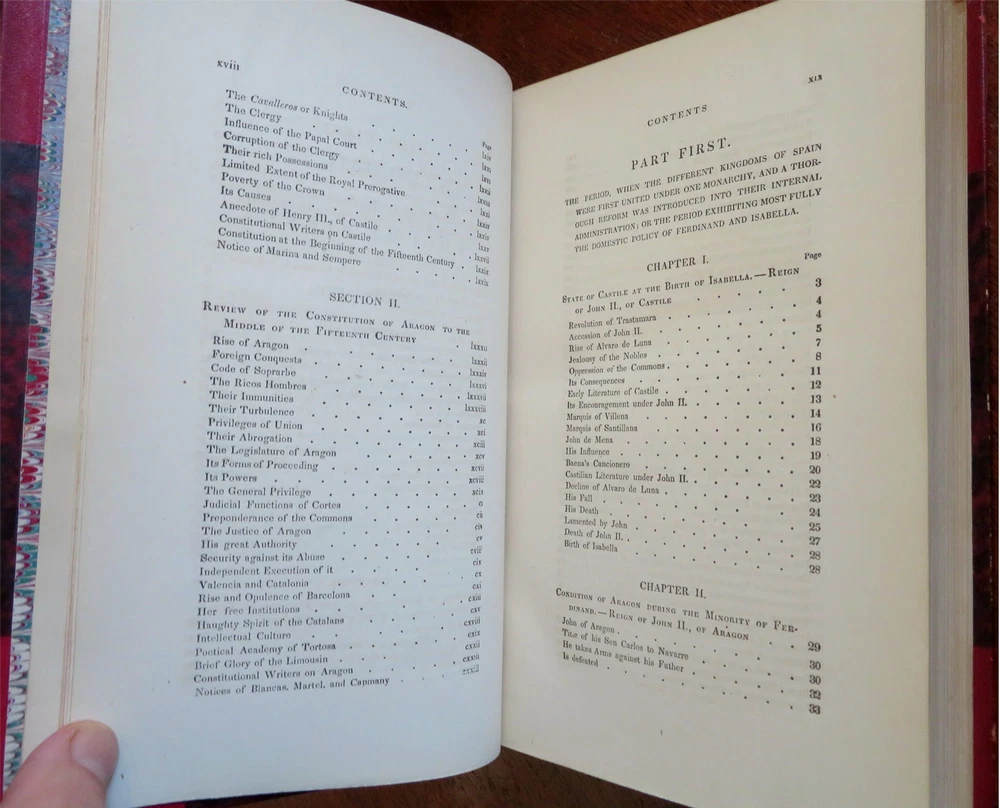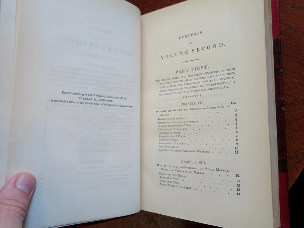 Ferdinand & Isabella Spanish Monarchs 1856 Prescott leather 3 volume set Ferdinand & Isabella Spanish Monarchs 1856 Prescott leather 3 volume set (Old Books, 19th Century Books, Leather Books, European History, Spain, Ferdinand & Isabella, Leather Sets). History of the Reign of Ferdinand and Isabella the Catholic, by William H. Prescott. Published 1856, Boston by Phillips, Sampson and Company. 3 volumes, each c. 400-500 pages. Text in English. Attractive antiquarian 1/2 leather bindings, slightly raised & gilt bands, gilt title lettering, gilt ruled compartment decorations, marbled covers & end papers. Set is physically old and shows some signs of handling and time. Bindings gently age worn but still appealing, leather and joints slightly rubbed but still supple, set remains overall very attractive as an object. Text block paper is gently age toned as typical, internally set remains mostly clean, tight and sound. A set which has been taken care of but may/ does not look like new. Still attractive on the shelf. Set displays a pleasing and unique age patina and is in rather nice antiquarian condition, any age flaws seem easy to overlook or forgive. Please review photos for more detailed attempt to present this set as it survives. We often over-describe any flaws that many sellers would not even bother to mention since most people would overlook them as minor and unworthy of comment. Many people tell us the books they receive from us are nicer in person than they appears on the screen. We want you to be clear about what you are buying, so we take numerous photos and try to describe it openly and honestly. Books Measure c. 9 1/2" H x 6" W. [B8967].
