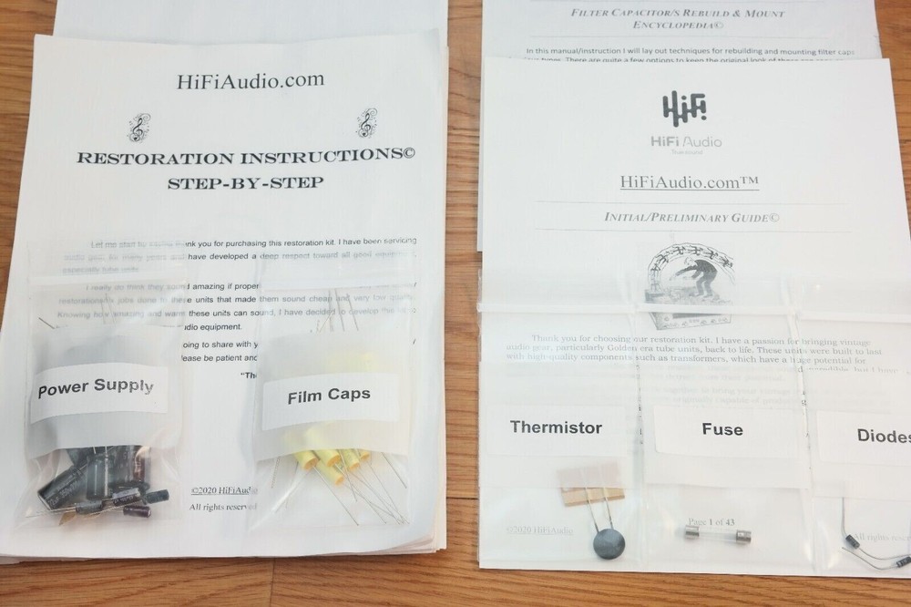 The scarcity of good, honest techs who can do good and reasonably priced restoration/rebuild of audio equipment inspired me to create this restoration kit. In today's day and age, it is difficult to find a knowledgeable technician who can service your audio gear properly. I have seen many poor quality restorations of equipment that cost way too much for their owners. In 99% of the cases, only a few parts were replaced, instead of a full and proper restoration job. A proper restoration must replace all electrolytic, paper, film, oil capacitors. Do not fall for partial kits. This is not a good or proper way to restore your audio equipment. It is the same as with car tires; one should never replace just one tire and keep the other worn-out tires on. A proper rebuild requires a full recap of all oil, paper, lytic capacitors. On the other hand, if one succeeds in finding a good tech, the wait time is usually 6-12 months for the unit to be serviced, and costs are sky-high. I have been servicing audio equipment for many years and have developed deep respect for all good equipment. Knowing how amazing and warm these units can sound, I decided to put together this kit. It includes very good upgrades and improvements that must be done to the unit. This restoration kit will make a huge difference in the sound quality. All the parts are of high-quality Japanese Nichicon / Rubycon / WIMA / IC / United Chemi capacitors. I am extremely particular about the quality of the parts provided in this kit. Knowing how many bogus/fake caps, diodes, resistors, etc. are out there, I source all the parts from reputable wholesalers and buy them in bulk. Vintage audio equipment has the potential to deliver rich and authentic sound when it is properly restored. Not only can it enhance your listening experience, but it can also evoke memories and bring joy to your life. Let's work together to bring your vintage gear back to its full potential, and make sure you have the music you deserve. ♩♬♫♪♫♩♬ “They Shall Have Music”- Avery Fisher Included in this kit: 1. Power/Filter stage capacitors ( Nichicon / Nippon / United Chemi) electrolytic capacitors. 3 x custom made PCB adapter plates to help one replace the multi-section can capacitors. Note, the image with silver multicap cans shown restaffed with new caps is for illustration purpose only. 2. Detailed instruction with colorful images, schematics, manuals (all of these are in electronic form, I consider these much better than printed version due to zoom availability). 3. Schematics (all of these are in electronic form, I consider these much better than printed version due to zoom availability). 4. Complete audio path upgrade with high quality US made (IC) or Nippon audio grade film capacitors. 5. Parts for complete recap of all the electrolytic capacitors. 6. Complete recap of all oil, film, paper, lytic caps. 7. fuse/s 8. Instructions on how to clean the chassis. 9. Instructions on how to clean a faceplate 10. Instructions on how to polish knob covers. 11. Support/help to a reasonable extent in case you need it. (This is what makes us different from other sellers.) The custom-designed PCB boards simplify the restoration process for multi-capacitor can capacitors in vintage audio equipment. Clearly labeled with polarity markings and mounting guides, they ensure precise assembly and seamless integration into your restoration project. These PCBs are also designed with cuts and openings to accommodate the original multi-section capacitor covers, allowing them to be reinstalled and preserving the authentic vintage look. An essential addition for maintaining both authenticity and functionality in vintage audio gear. We also offer a great selection of Restoration Kits , LED conversion kits , Volume Controls , Rotary Switches and other rare/unique parts; Make sure to check our store ---------> LINK (Use the search bar inside the shop to find what you need faster) We may also be interested in purchasing your equipment