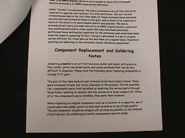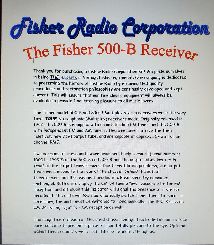 Fisher 500-B Vacuum Tube Receiver Restoration Kit You will receive correct 500-B Paperwork and parts! Fisher receivers are the BEST receivers ever made by any company - don't yours deserve the best ?! Here is the VERY BEST Fisher receiver restoration kit that money can buy! We are and always will be the only source qualified to offer ACCURATE and COMPLETE Resto-Pak Restoration Kits - in fact many of our imitators and/or "competitors" actually have purchased our restoration kits in an attempt to see what secrets we build into our restored units! Is your receiver running hot enough to roast tonight's dinner?? Are your output tube plates glowing RED (check them in total darkness - you might be surprised!) Does your FM stereo sound weakish and out of phase?? Does you receiver simply just don't sound "right"?? DON'T LET YOUR RECEIVER ROAST ITSELF TO DEATH! Your FIFTY YEAR OLD Fisher NEEDS a Fisher RESTO-PAK NOW !!!!! This is the affordable next best thing to a professional hands on Restoration. These kits are custom designed. Our Resto-Pak Restoration kits are WORLD FAMOUS! HUNDREDS of our kits have been installed worldwide for over 15 YEARS and these happy Fishers are still happily singing! DO NOT BE INTIMIDATED! Receiver restoration is NOT the terrible chore one may think it is. This kit provides the BASIC FOUNDATION for good operation and is EXTREMELY beneficial for any receiver that is mostly functional and in need of being refreshed and upgraded. Our kits cover EVERYTHING! BIAS SUPPLY! TUNER FM De-Emphasis Stereo AND Mono! PHONO AND PREAMP STAGES! AMPLIFIER with CIRCUIT PROTECTION! AND MORE! As you may (or may not) be aware, Fisher receivers have substantial problems in the biasing of the output tubes. They were biased WAY to hot even as new, and as the selenium bias rectifier ages, the bias supply voltage gets weaker and weaker. With some luck, the power transformer won't fail. It WILL , however, always be operating at excessively high temperatures due to the strain. The eventual and inevitable result is that your precious set is running hotter and hotter until final failure forces restoration, and the replacement of some costly output tubes! As it is, the 7591 tubes are aging at a VERY accelerated rate due to INCORRECT BIASING causing high idling currents. This can and MUST be corrected before the set is used for any length of time. As an added benefit, the power supply will operate in a more relaxed fashion, and the much cooler operating temperatures will be immediately noticed. Just think of all the stress the power transformer is under, and this power and output tube life is being wasted just to generate HEAT , even when NO music is playing! In addition, ALL of the small electrolytics have developed leakage and other age related problems. The original mylar signal caps are now fragile and leaky after 50 years of heat and torture. The failure of a coupling capacitor or shorted tube can easily spell disaster for an output transformer! Good soldering skills and the ability to follow a schematic are required, although if you know which end of a soldering iron to hold you should not encounter any major problems. Our RESTO-PAKS contain the finest quality modern components available today. This includes ALL small electrolytic capacitors as well as ALL signal and coupling capacitors that normally fail. Many individual components need to be installed/replaced. Yes it will take some time, however, it is a very thorough process. We include an enlarged copy of the Operating Manual, Service Manual for YOUR serial number, and our custom developed Restoration Guide with FULL COLOR photos of the Multiplex Board removed from the set with components marked! Also included are the very important specific resistors and parts required to correct the FM De-emphasis. FM De-emphasis is 75 us (microseconds) which is the North American standard. ALL Fisher stereo tube receivers and tuners employ excessive De-emphasis and therefore are NOT de-emphasizing the FM audio at the proper rate. The result is a loss of natural highs due to the attenuation of the high frequency response in Mono and Stereo. When corrected (a simple change of a few components which are included in EVERY RESTO-PAK ) the result is astounding. In fact, we include 1% precision resistors for this application to ensure extremely accurate De-emphasis is achieved and maintained. We can modify the Resto-Pak for the European Standard of 50us at no extra charge! Also, a new, heavy duty Silicon Bias rectifier is supplied, and output tube BIAS setting instructions and parts are included. New super heavy duty power supply diodes and VERY detailed instructions are included as well. Output transformer protection is achieved, and the installation of our kit will provide the ability to determine the PRECISE degree to which your output tubes are matched using only a digital DC voltmeter! Our package includes a nice enlarged copy of the original owners manual, the CORRECT service manual for your specific unit (determined by the serial number), and our detailed restoration procedure covering everything except alignment (which is covered in the service manual, however, test equipment is needed). The procedure instructs how to correct all weak spots in the unit, such as checking the specialized MPX filters which tend to drift in value thereby affecting audio response, balance, etc. Also, the benefits of cathode resistor installation on each output tube are explained in detail. In addition, several weak spots in the Stereo Multiplex circuit are addressed - components that (as these glorious units continue to age) in recent years have shown signs of significant failure rates that now warrant replacement - and these are ALL included as well in our kit. All capacitors that must be changed in the entire set are noted in the manuals on an individual basis with crystal clear instructions. All parts are identified by specific Fisher part number for clear and easy parts