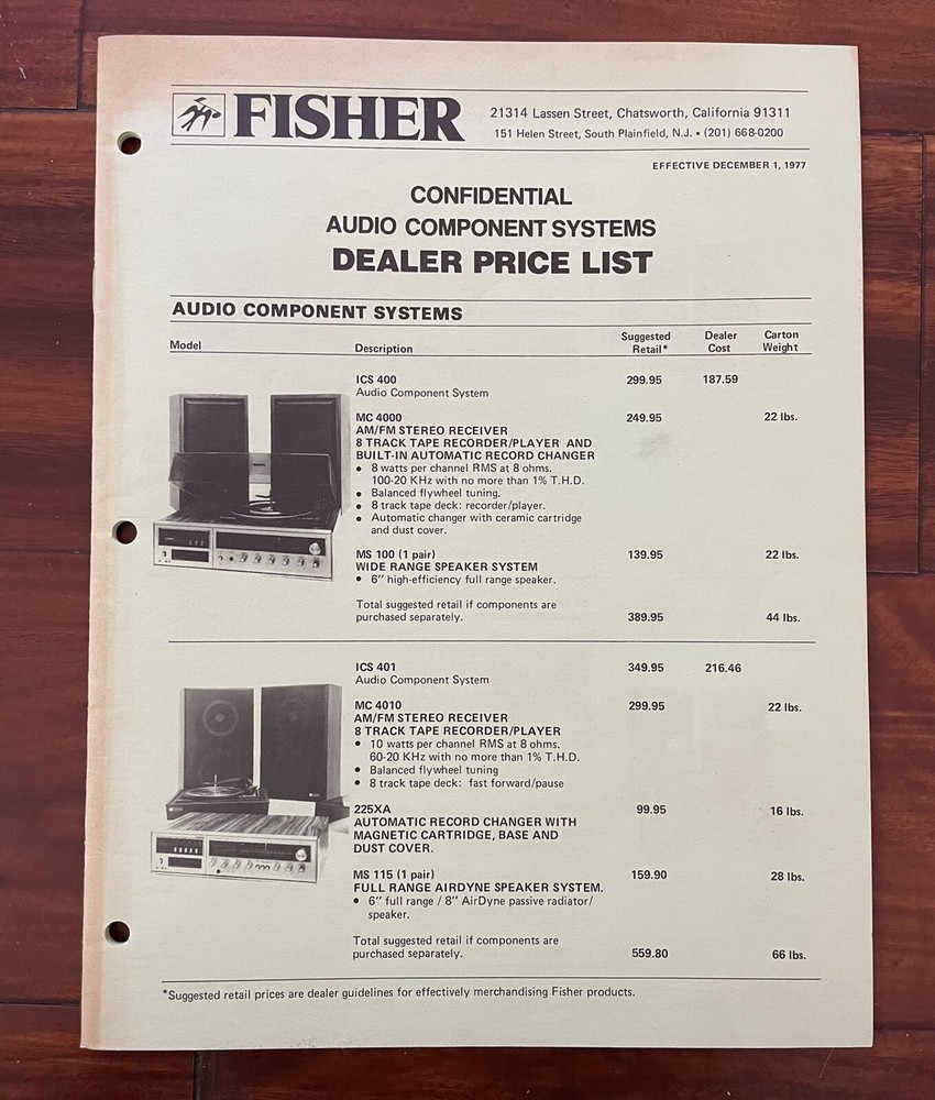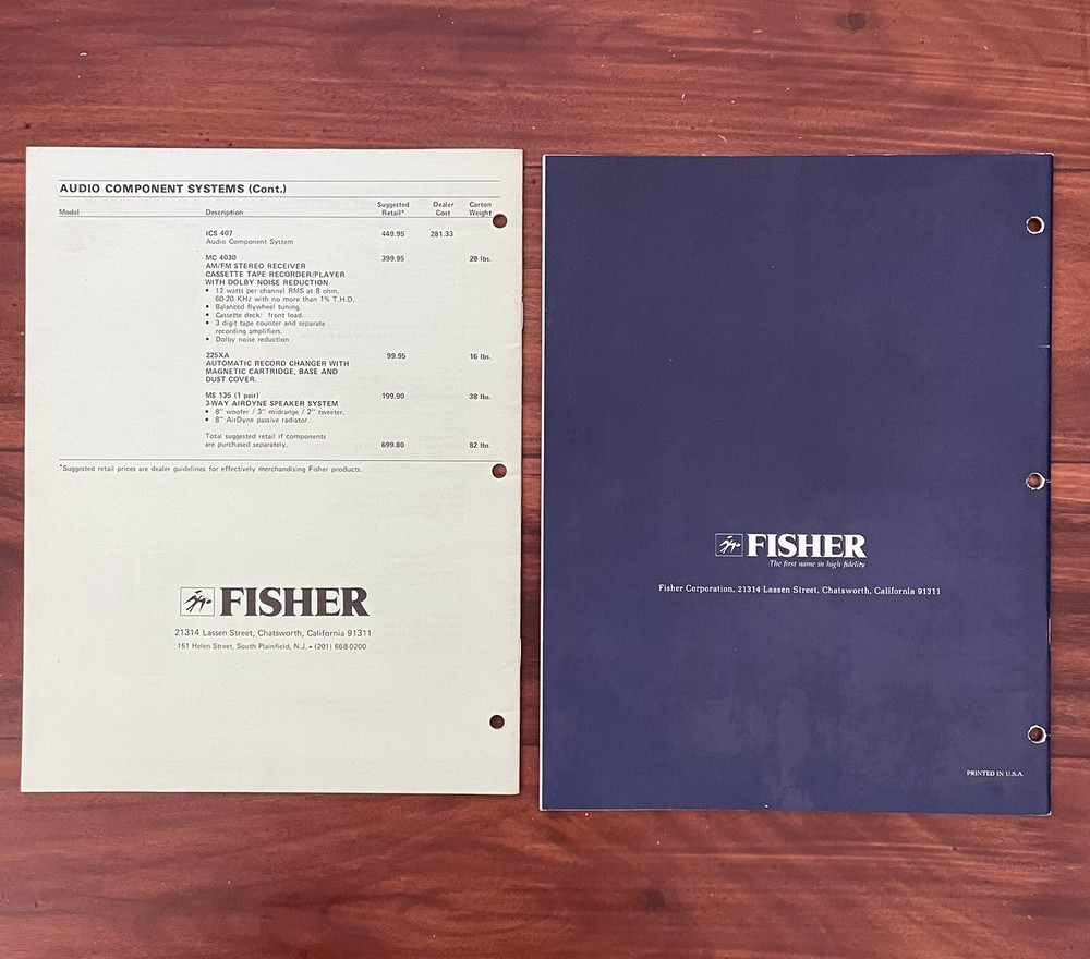 Fisher Audio Component Systems Catalog & 1977 Fisher Dealer Price List Please take advantage of the zoom feature on the photos to judge cosmetics for yourself. _______________________________ What you see in the photos is what exactly you receive. If it's not pictured it's not included. Please see the photos and make your own assessment and don’t hesitate to contact us if you have any questions. Shipping: We ship all items within 1 business days of receiving your cleared payment. (Excluding weekends and holidays) Additional shipping fees will apply for all Alaska, Hawaii and U.S. Territories (Guam, Puerto Rico, Virgin Islands and etc.) shipments. To ship a large item to PO boxes, APO or AFO zip code also will be charged additional shipping fees. Feedback: We aim to earn positive 5 stars feedback for every item. If you happy with your purchase please take a minute to leave positive 5 star feedback. If you have any issues with your purchase please contact us directly using eBay massage service to resolve the issue so that we can earn your positive 5 star feedback. Buy with confidence. We treat all our customers with fairness and professionalism. We do not misrepresent our items and if you need us after your purchase, We are right here and will do everything in our power to help you to enjoy the product. For orders with the Free Shipping we reserve the right to select the best method for the shipment. M