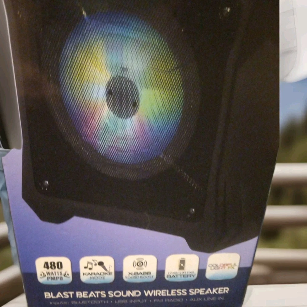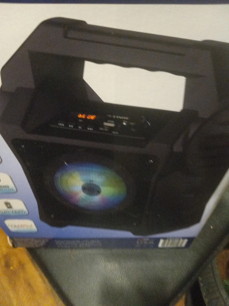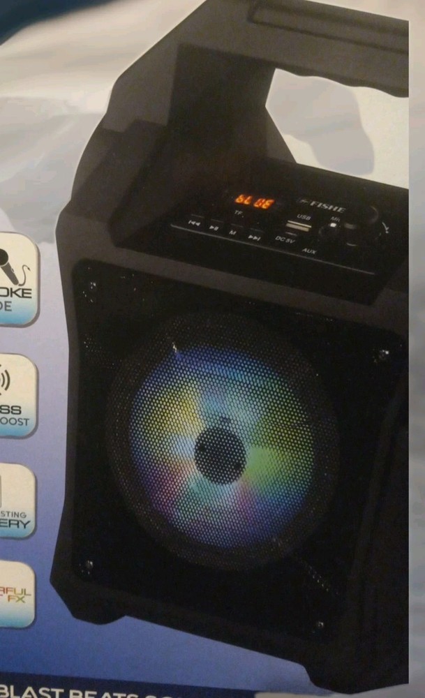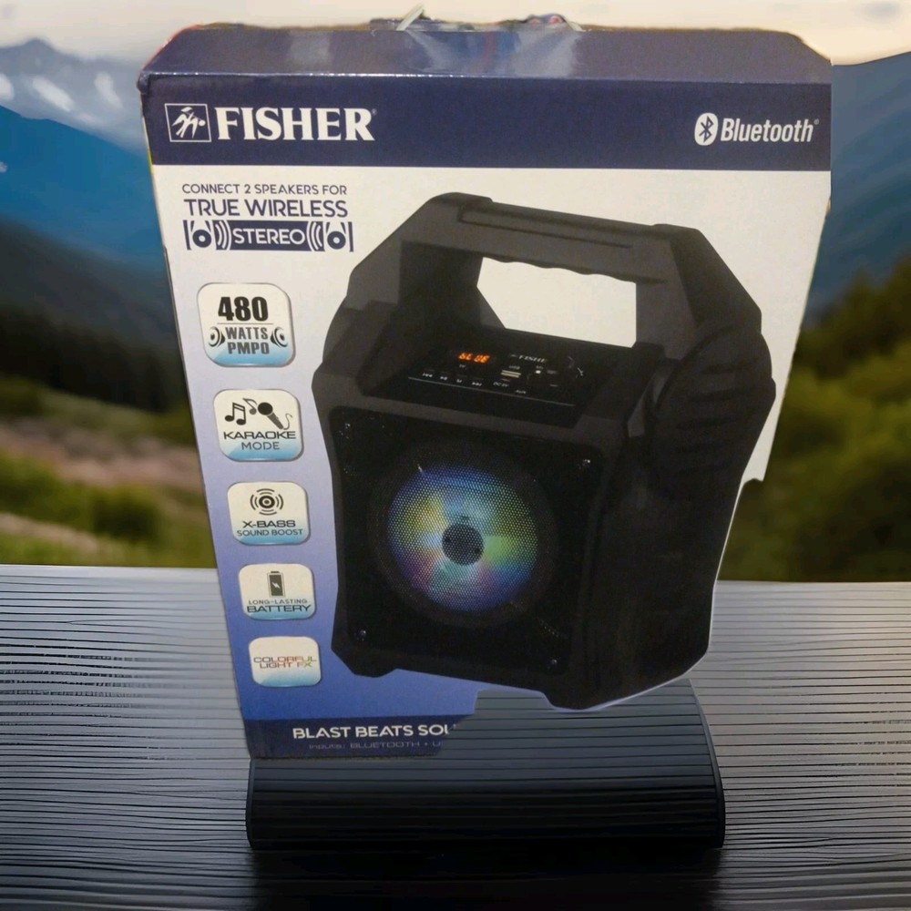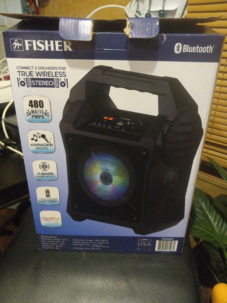 New open box The Fisher Blast Beats Portable Bluetooth Speaker FBX262K is a versatile and powerful portable speaker system in black color. With wireless connectivity options like Bluetooth 5.0 and true wireless stereo technology, this speaker allows for seamless integration with various devices. It features a long-lasting battery, a karaoke mode, X-Bass sound boost, and colorful light effects for an immersive audio experience. The illuminated design and carrying handle make it convenient to take on the go, while the 480 watts PMPO output delivers clear and crisp sound for all your music needs.