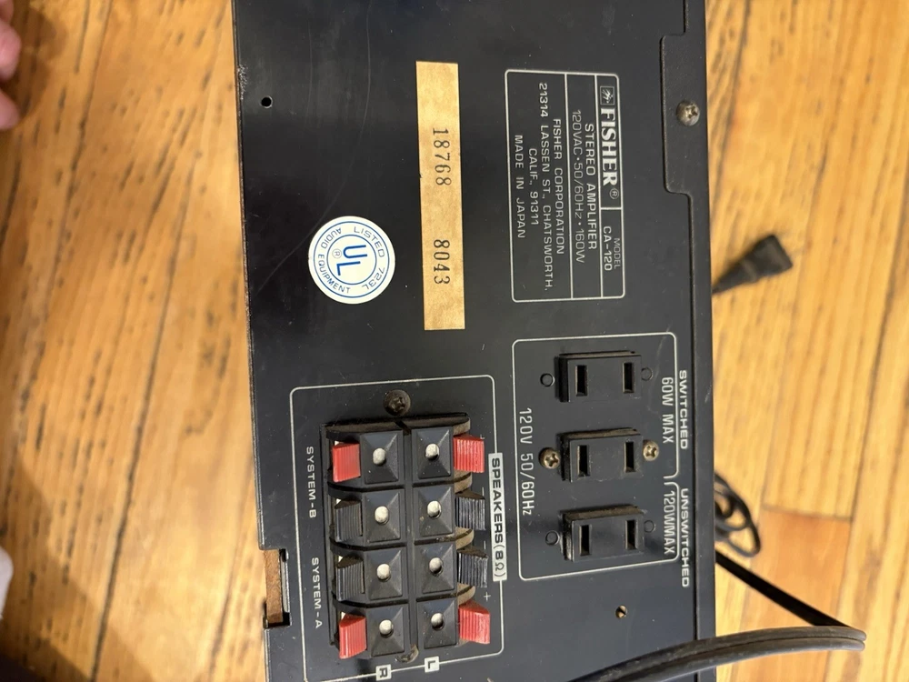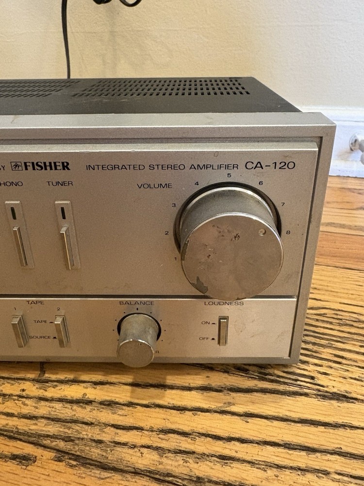Fisher CA-120 Audio Amplifier Fully Functional $ 92.4 Fisher Fisher Integrated Amplifier CA-120 works great.... Flower Bowl quantity Add To Cart Description Specifics Reviews (3) Description Fisher Fisher Integrated Amplifier CA-120 works great. Specifics Brand Fisher Model Fisher CA-120 Reviews Rated 4 out of 5 Srikanth Jasti Fast Shipping! Great packaging! Item arrived in great shape and exactly as described! Great Communication! A+++ Seller!!! Rated 3 out of 5 SaintDaniil6 Shipped it out quickly and was very carefully packaged. Good communication. A+++ seller. Thank you! Rated 3 out of 5 Harshit Sheth Responded to all questions I had and shipped the camera quickly! Camera came as described.