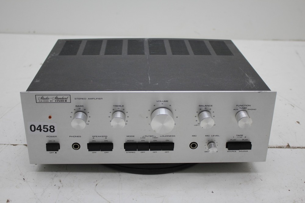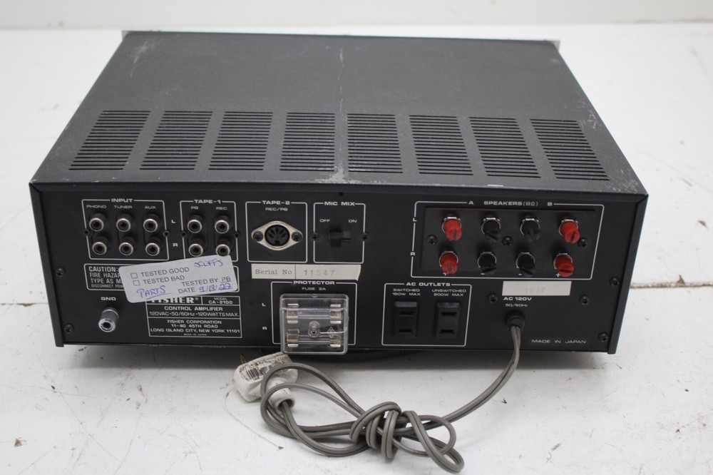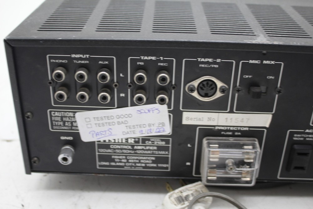 Fisher CA-2100 Amplifier - Parts/Repair Physical Grade: C Functional Grade: F This item is sold AS-IS, with no guarantee of functionality. It has various issues that prevent it from functioning properly. There are some marks and wear on the casing from general use. See pictures for further details. No further testing has been performed. Shipping Disclaimer: We do our best to ensure that our items arrive safely. Sometimes, however, they do sustain shipping damage. In the unlikely event that this happens to your item, please contact us immediately, and we will resolve the situation for you. Accessories Included: Power Cable: Not Included Other Accessories: Not Included Terms of Sale: Please email any questions prior to bidding. Please allow up to one business day for a reply. We do not ensure compatibility with various accessories, software, or other hardware. Please do your own research before purchasing. Our business hours are Monday-Friday 8:00AM-4:00PM CST. Note that sales tax may be applicable depending on buyer location. Be sure to check your shipping address. We are not responsible for items shipped to an old, incorrect, or invalid shipping address. Local pickup is only an option for our freight listings. We are otherwise not open to the public.