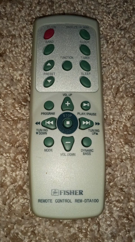 Navigate your Fisher desktop audio system with ease using the REM-DTA100 remote control. Designed specifically for compatibility with Fisher audio equipment. , this sleek gray remote puts the power of control right at your fingertips. With its intuitive layout and responsive buttons, managing your audio settings and preferences has never been more convenient. Crafted for durability and built to the high standards you expect from the Fisher brand, this remote is a genuine accessory that enhances your audio experience. Whether you're adjusting volume, selecting input sources or customizing your sound settings, this essential tool is an integral part of your home entertainment system. I PURCHASED THE DESK TOP STEREO SYSTEM FROM SHARPER IMAGE I BELIEVE. SAT ON MY SOFA TABLE. ONLY USED THE REMOTE A HANDFUL OF TIMES. BATTERY COMPARTMENT IS CLEAN. PLEASE NOTE THAT I AM NOT ALWAYS AVAILABLE FOR QUESTIONS BUT SHOUT OUT ANYWAY IF U WANT. WILL CAREFULLY PACK FOR SHIPPING. THANKS FOR LOOKING!