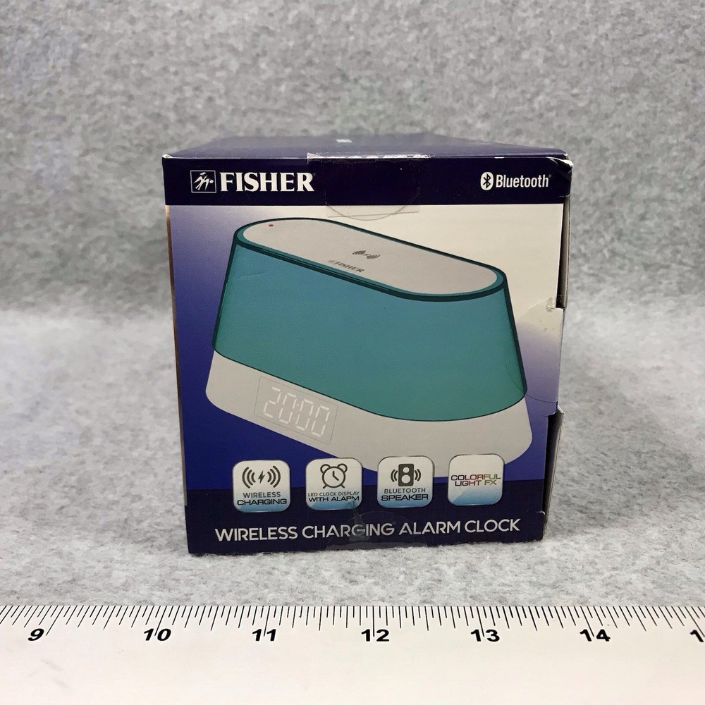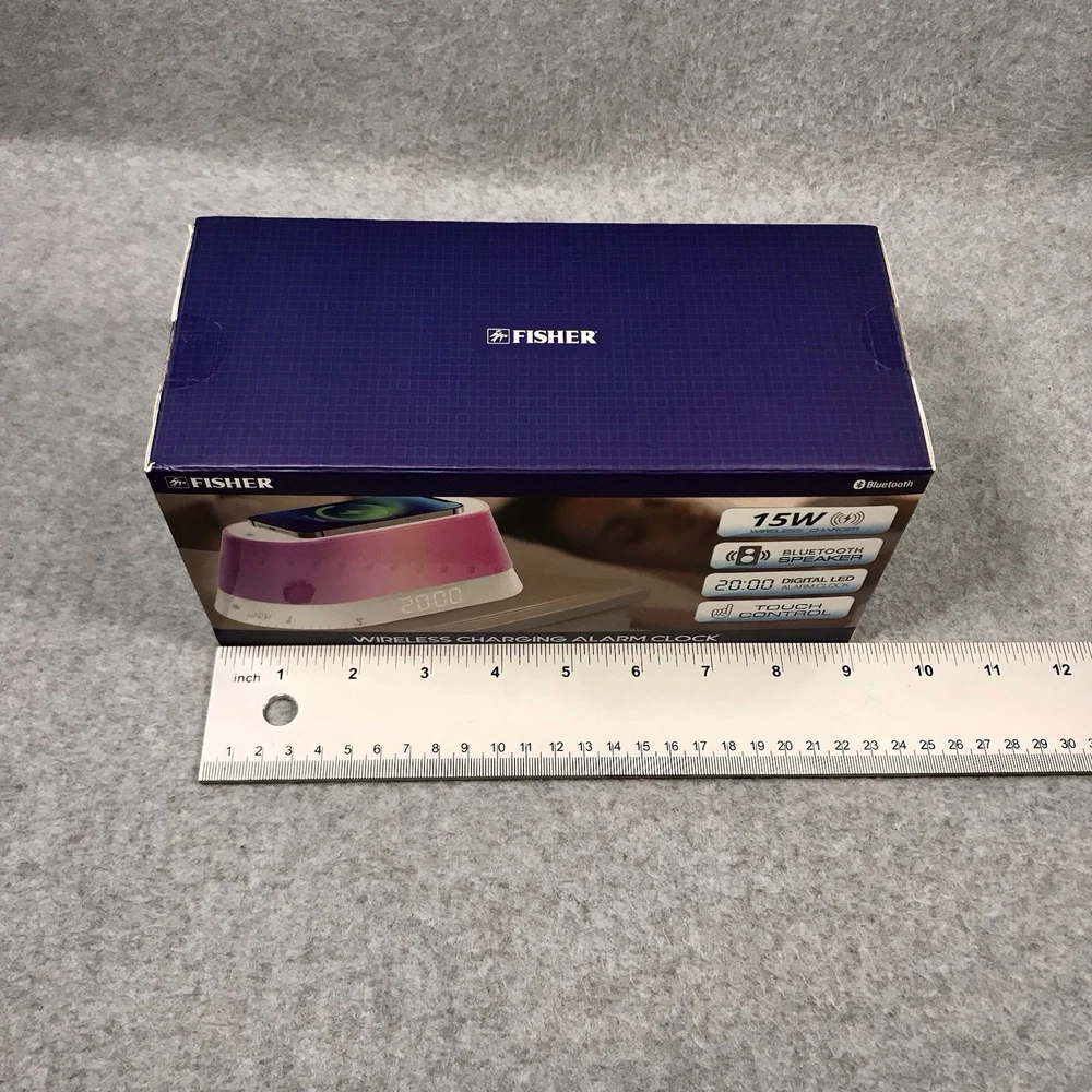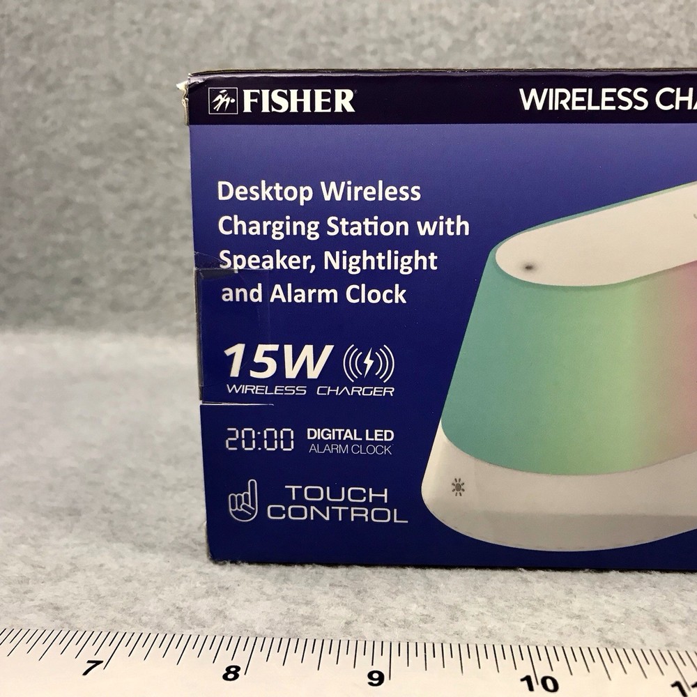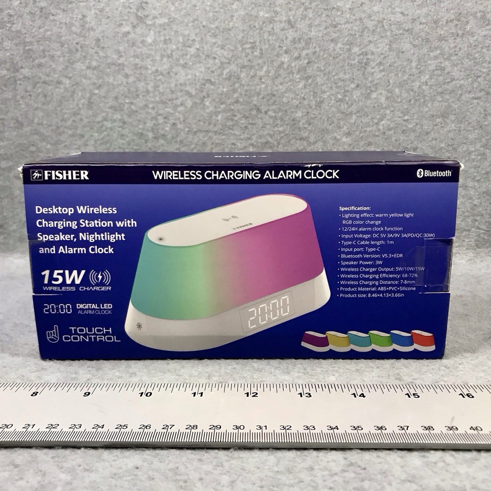 New in box: Fisher brand Wireless Charging Alarm Clock. Desktop Wireless Charging Station with Bluetooth Speaker, Nightlight, and Alarm Clock. 15W Wireless Charger. Digital LED Alarm Clock. Touch Control. Colorful Light FX. Model: FAC210W Specifications: Lighting effect: warm yellow light RGB color change 12/24 Hour alarm clock function Input Voltage: DV 5V 3A/9V 3A/9V 3A(PD/QC:30W) Type-C Cable Length: 1 m Input port: Type-C Bluetooth Version: V5.3+EDR Speaker Power: 3W Wireless Charger Output: 5W/10W/15W Product Size: 8.46 x 4.13 x 3.66 in