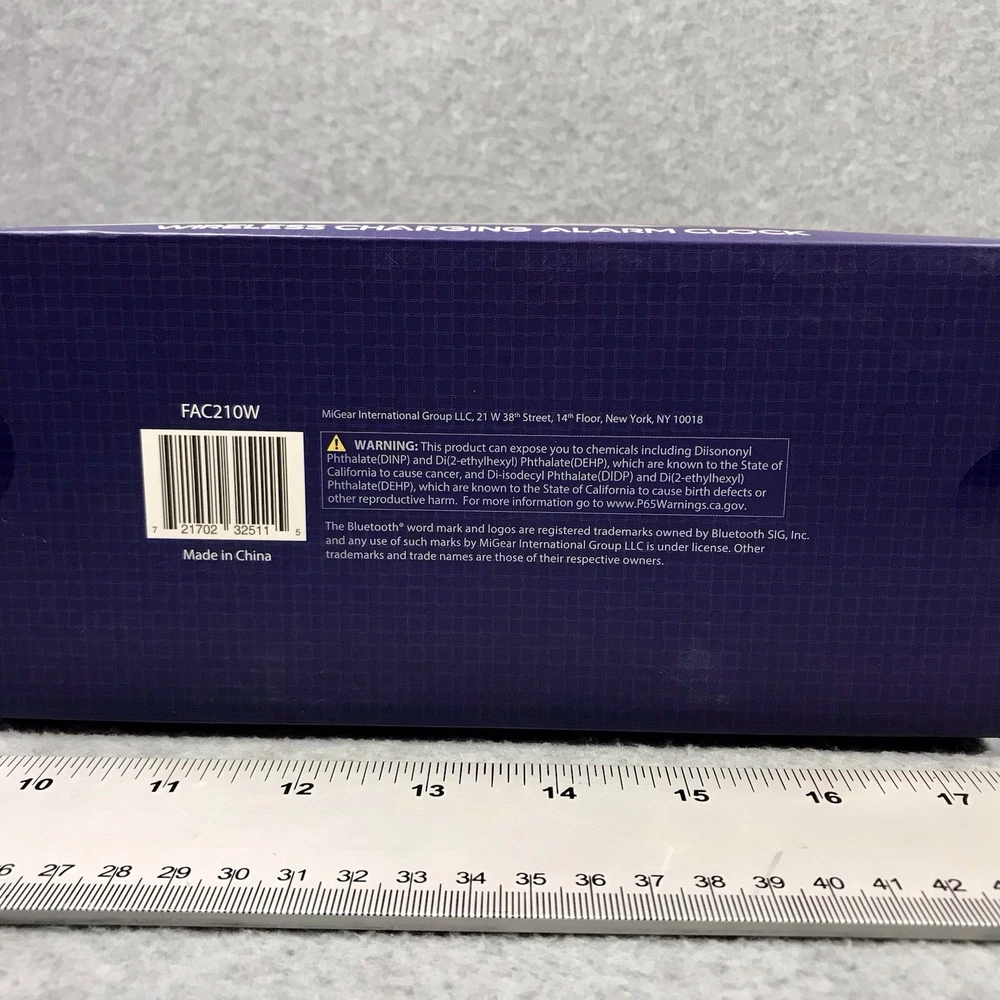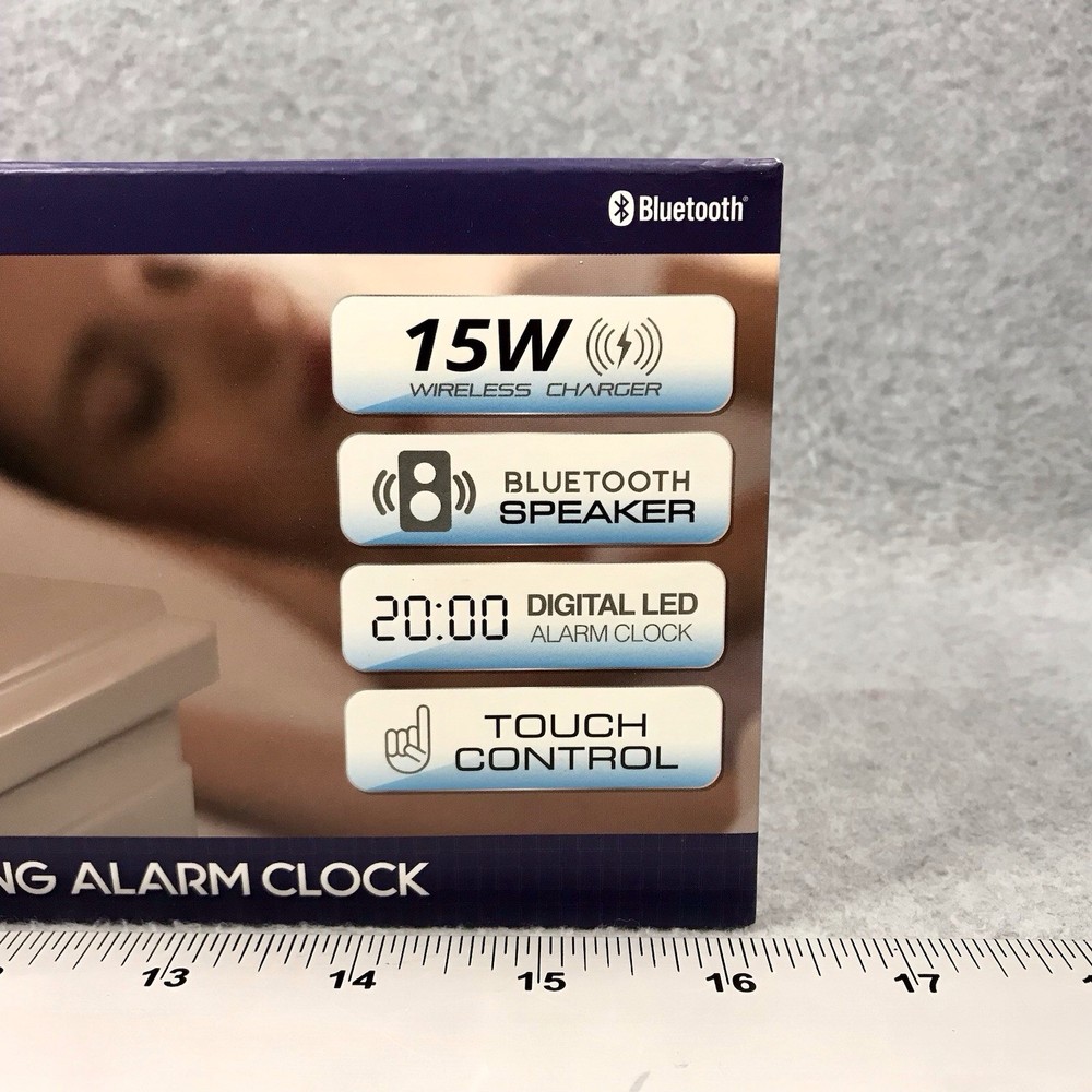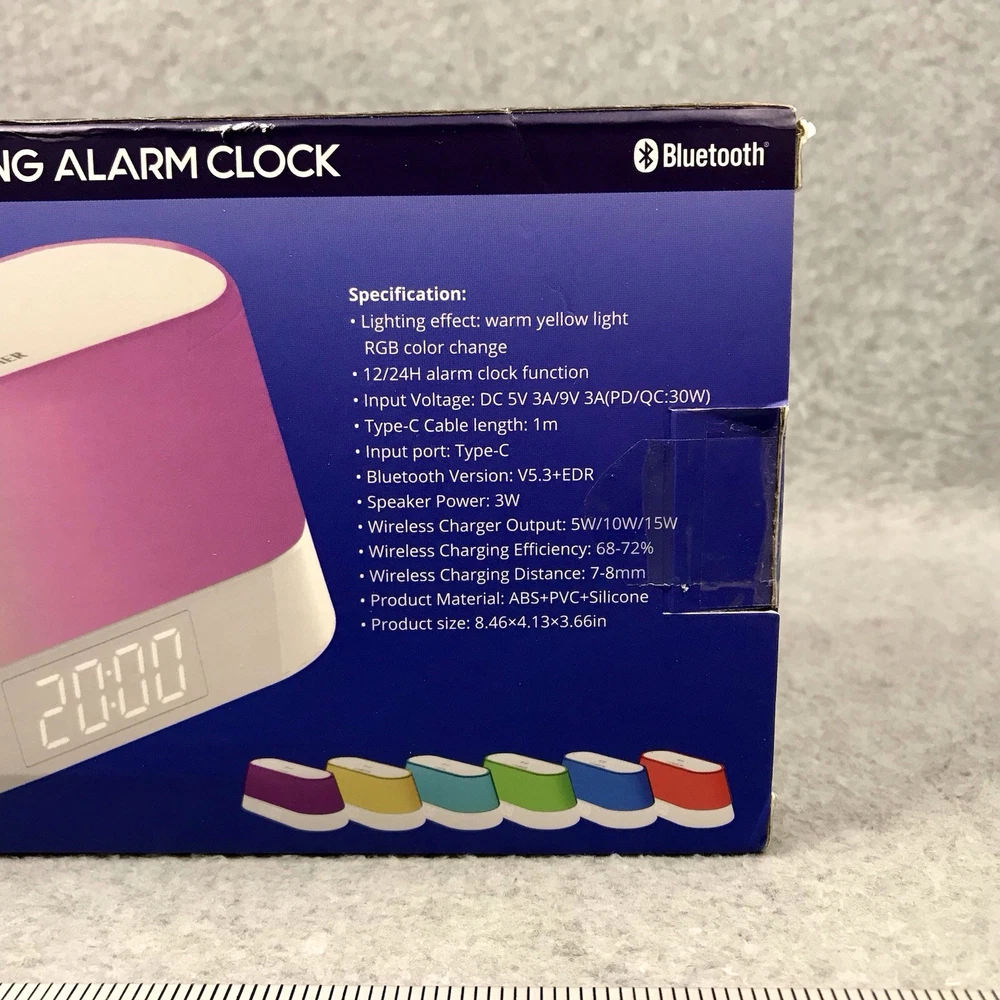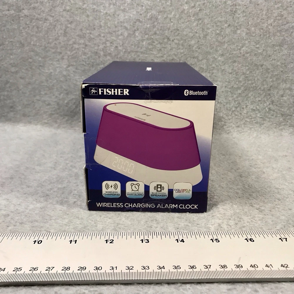 New in box: Fisher brand Wireless Charging Alarm Clock. Desktop Wireless Charging Station with Bluetooth Speaker, Nightlight, and Alarm Clock. 15W Wireless Charger. Digital LED Alarm Clock. Touch Control. Colorful Light FX. Model: FAC210W Specifications: Lighting effect: warm yellow light RGB color change 12/24 Hour alarm clock function Input Voltage: DV 5V 3A/9V 3A/9V 3A(PD/QC:30W) Type-C Cable Length: 1 m Input port: Type-C Bluetooth Version: V5.3+EDR Speaker Power: 3W Wireless Charger Output: 5W/10W/15W Product Size: 8.46 x 4.13 x 3.66 in
