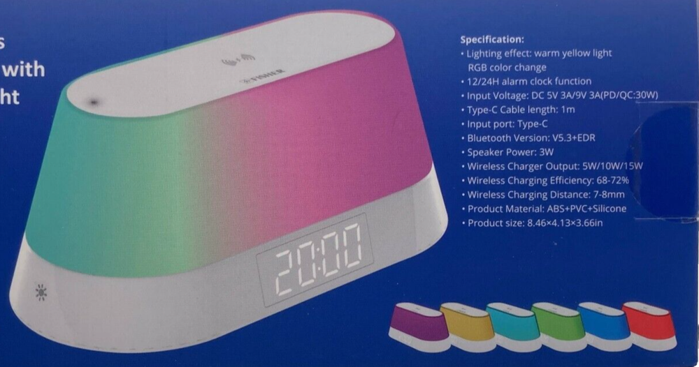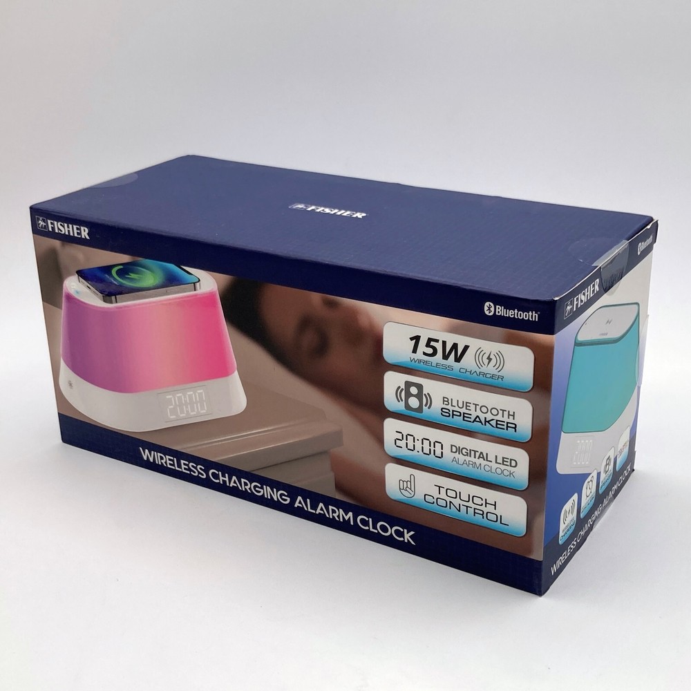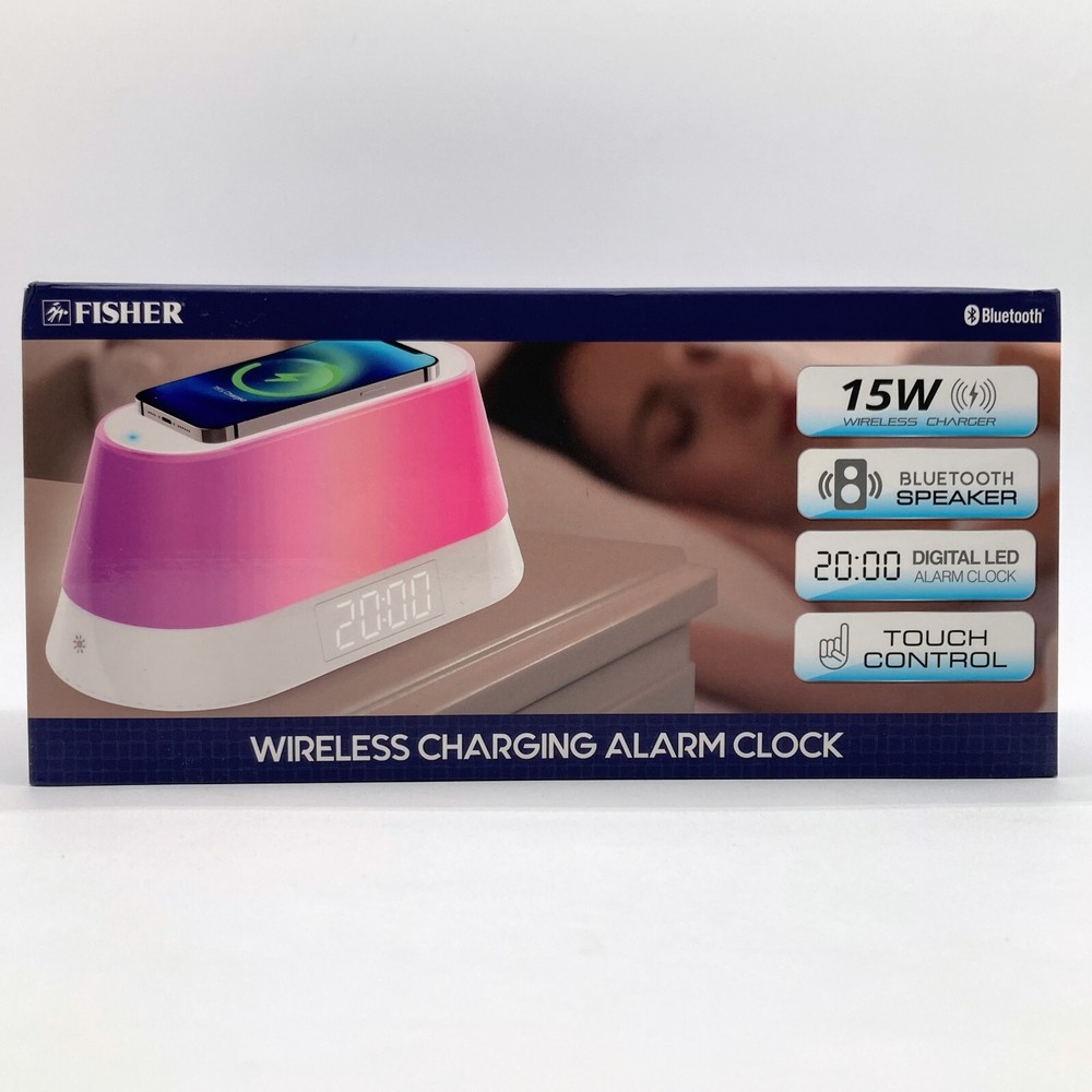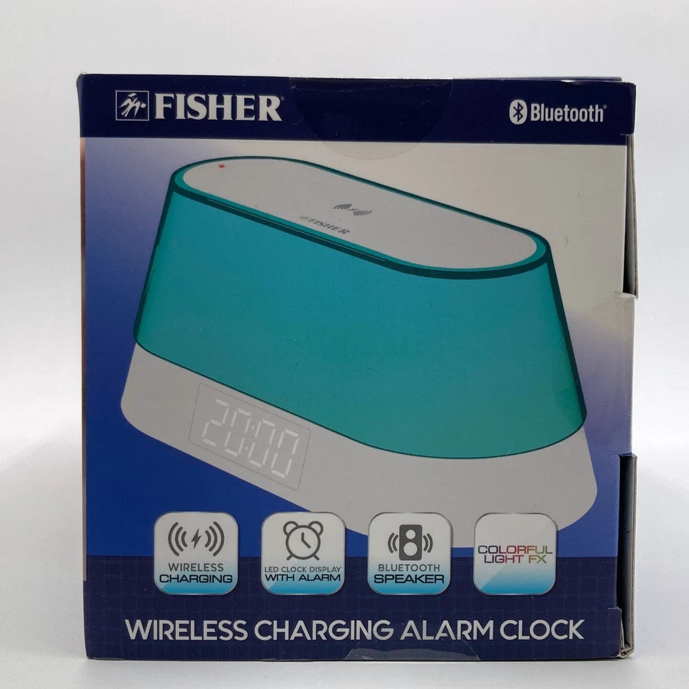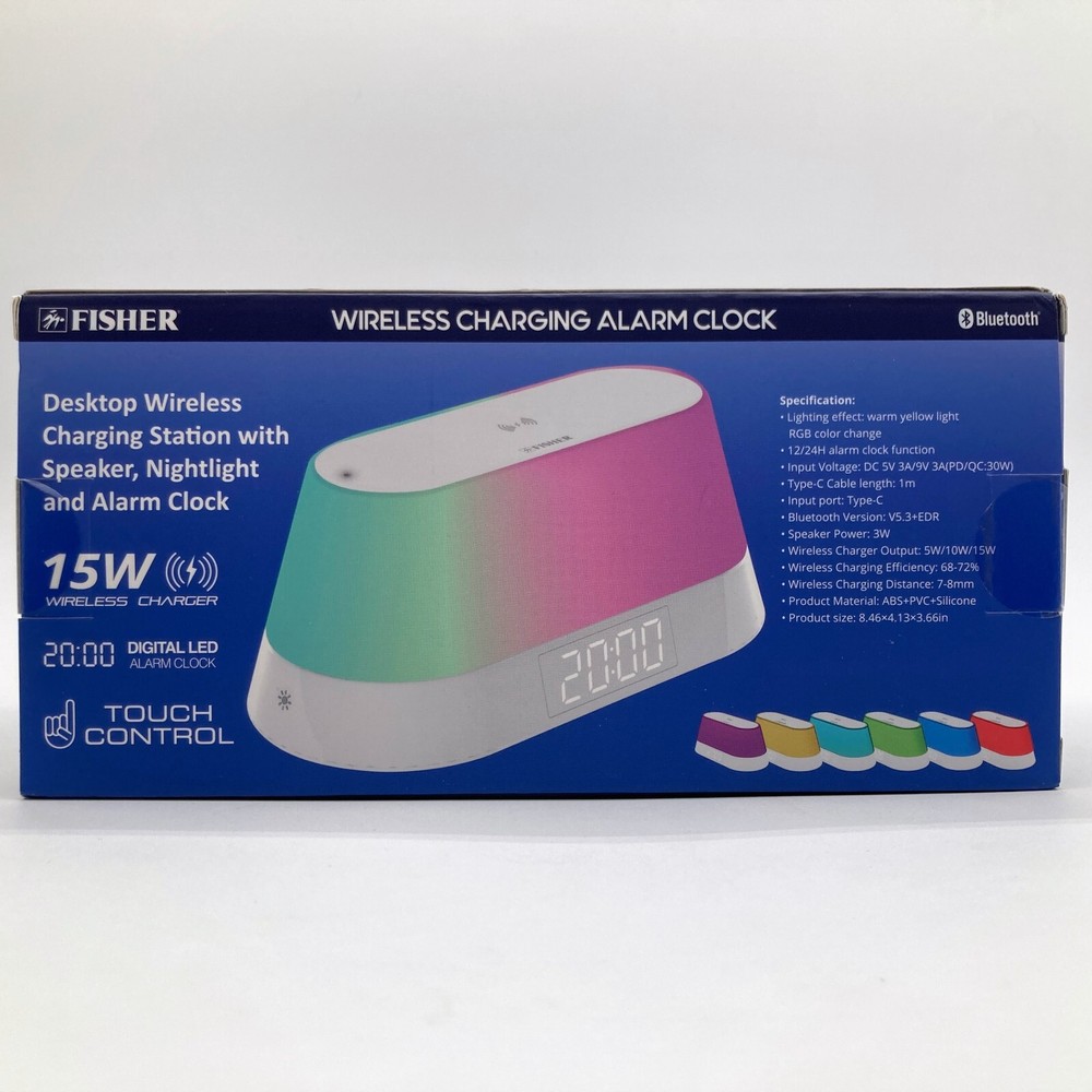 New in box: Fisher brand Wireless Charging Alarm Clock. Desktop Wireless Charging Station with Bluetooth Speaker, Nightlight, and Alarm Clock. 15W Wireless Charger. Digital LED Alarm Clock. Touch Control. Colorful Light FX. Model: FAC210W Specifications: Lighting effect: warm yellow light RGB color change 12/24 Hour alarm clock function Input Voltage: DV 5V 3A/9V 3A/9V 3A(PD/QC:30W) Type-C Cable Length: 1 m Input port: Type-C Bluetooth Version: V5.3+EDR Speaker Power: 3W Wireless Charger Output: 5W/10W/15W Wireless Charging Efficiency: 68-72% Wireless Charging Distance: 7-8mm Product Material: ABS + PVC + Silicone Product Size: 8.46 x 4.13 x 3.66 in Please check out our other items in ebay store Vend N Things and add us to your favorites list!