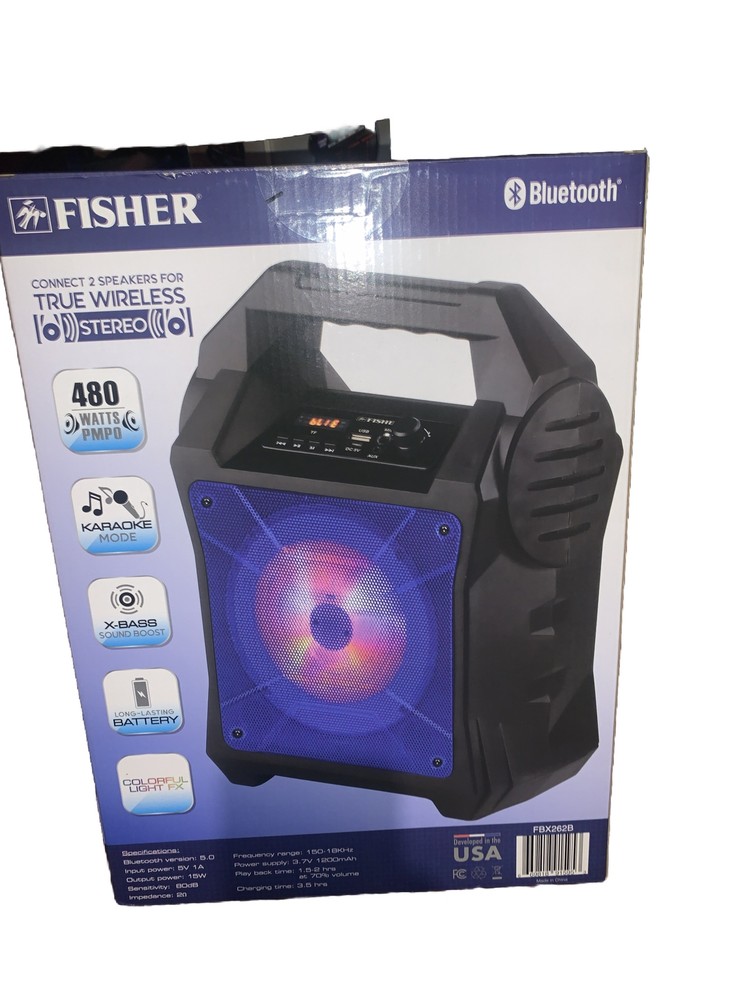 This Fisher FBX262 Portable Wireless Bluetooth Speaker is a must-have for any music lover. It has a sleek design and comes in two vibrant colors, red and blue. The speaker is compatible with any Bluetooth-enabled device, making it easy to connect and use. Additionally, it has several audio inputs, including USB and microphone input, for added convenience. The Blast Beats Sound Wireless Speaker boasts powerful sound quality with a 15W RMS power output. It has a range of features, such as FM radio and AUX input, allowing you to enjoy your favorite music from various sources. This speaker system is perfect for on-the-go use, as it is portable and lightweight.