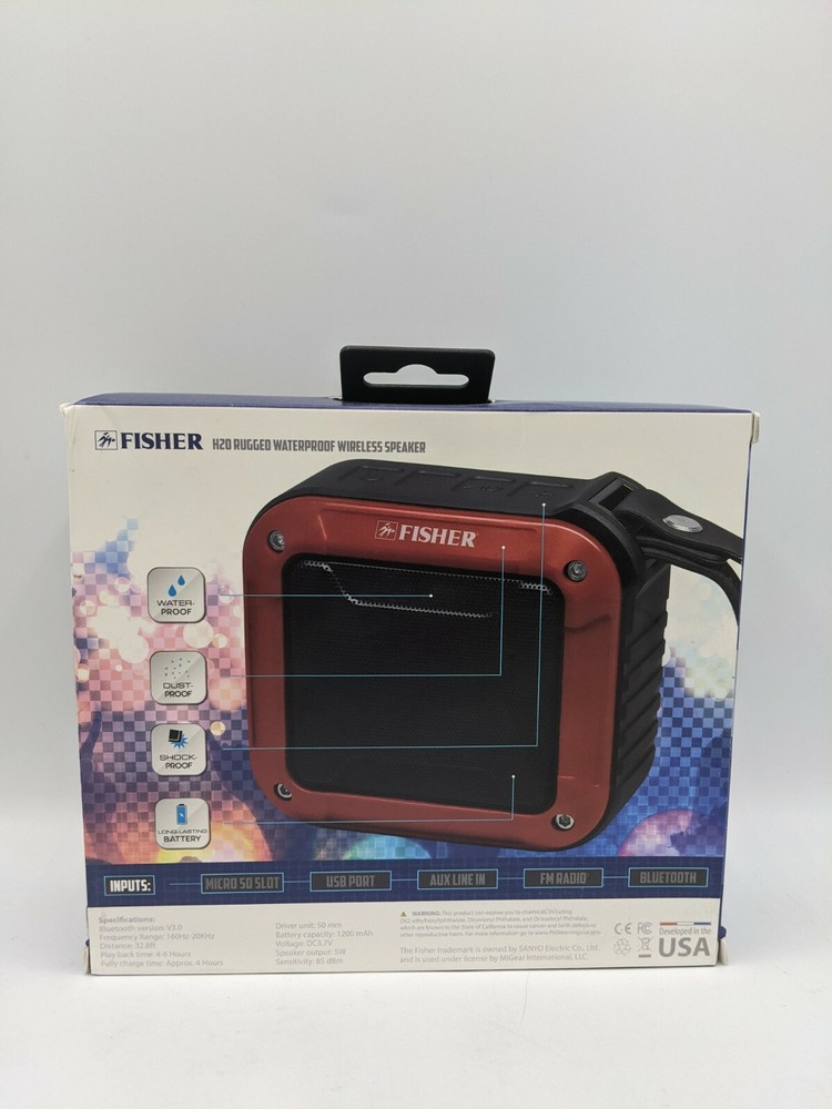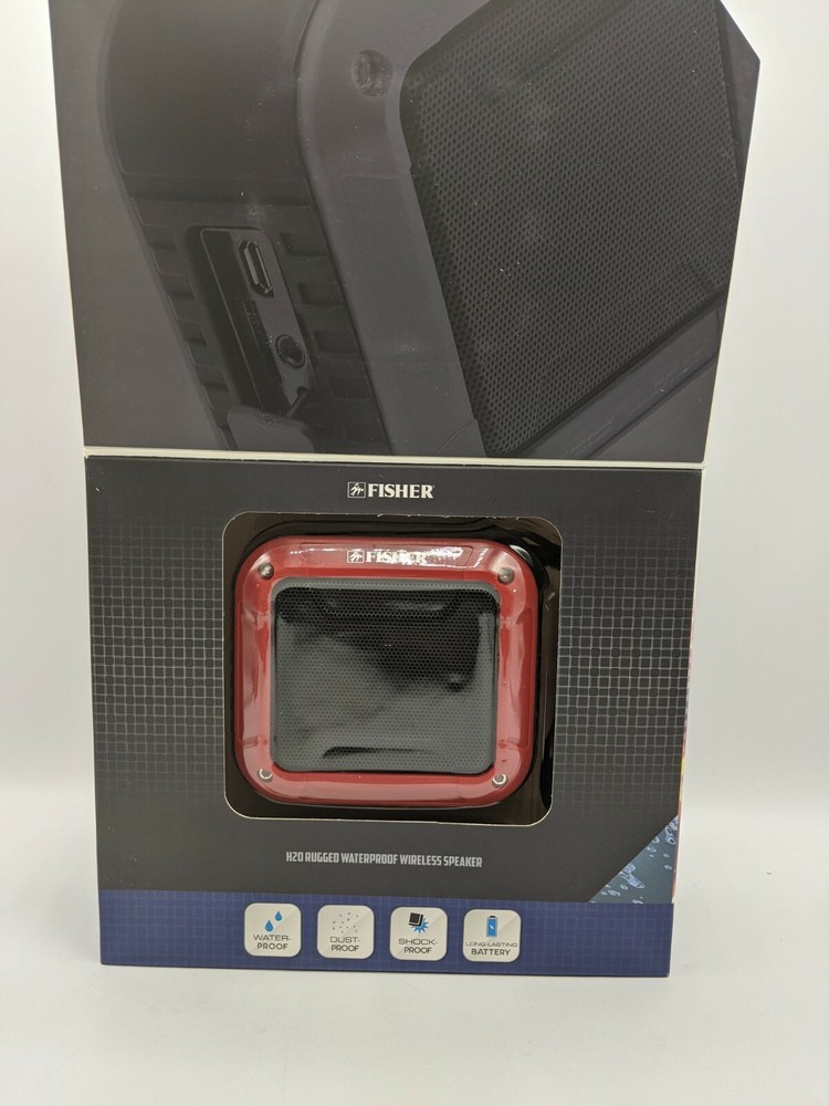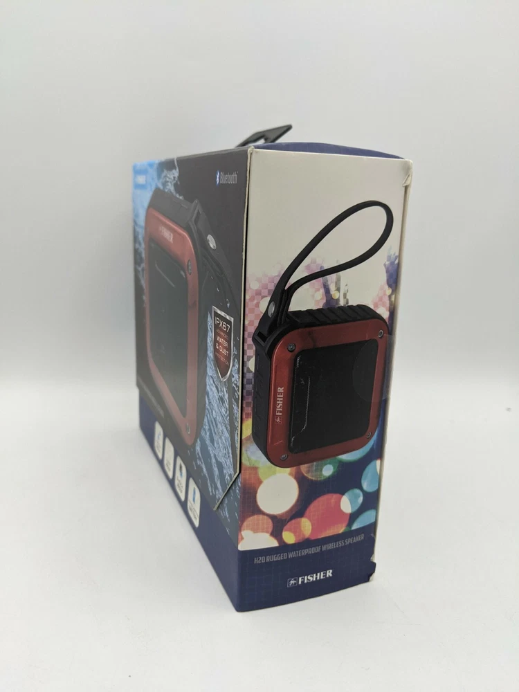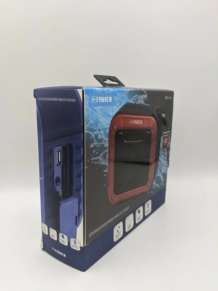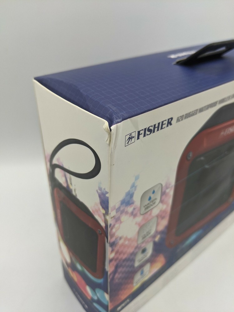 Fisher H2O Rugged Red Waterproof Wireless Bluetooth Speaker FBT180R. The packaging has some issues with the corners from store handling but the speaker is still brand new and unused, please review the photos for the issues.