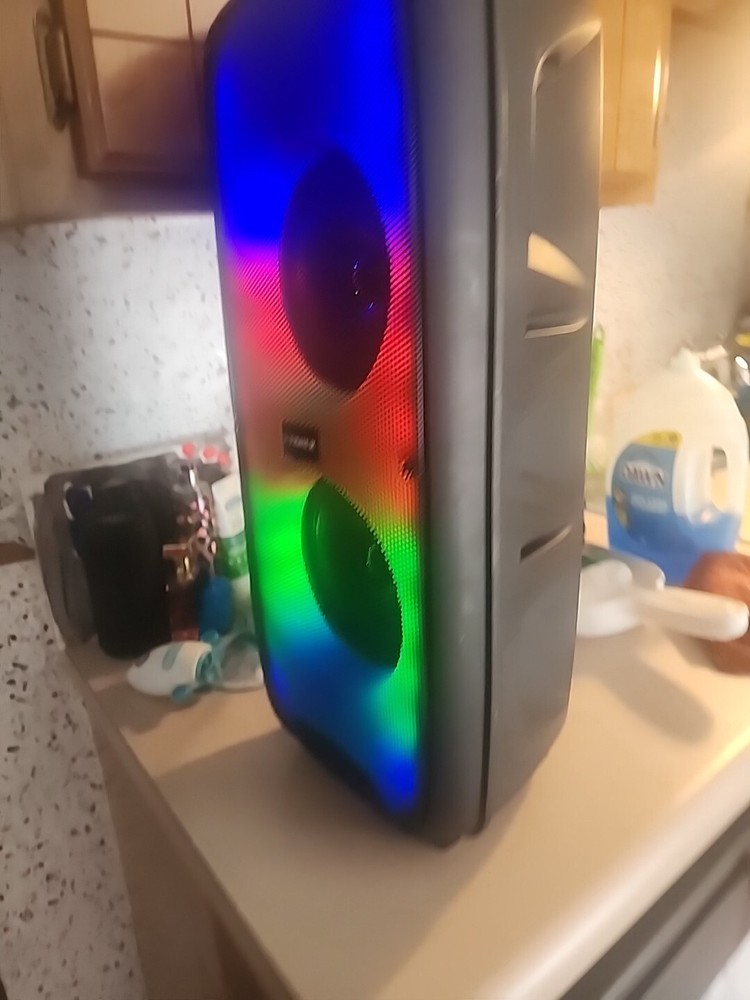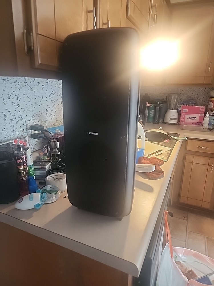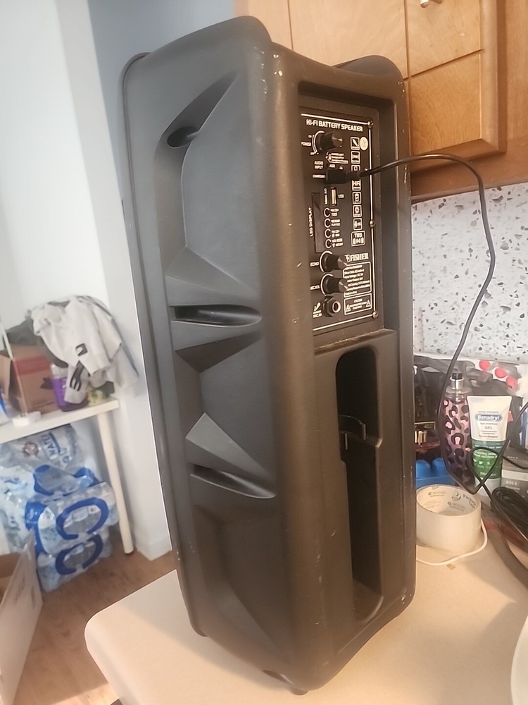 The Fisher Hi-Fi Battery Speaker Model FX662KM is a portable home theater speaker system in black color. It is compatible with universal devices and is designed for high-quality audio output, with surround sound formats supported for an immersive listening experience. The speaker is from the Fisher brand, known for producing audio equipment, making it a reliable choice for those looking for a versatile and powerful speaker system.