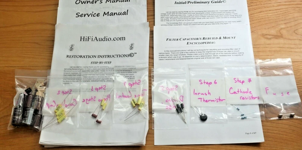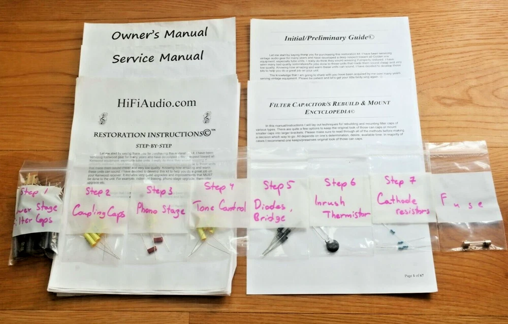 The scarcity of good, honest techs who can do good and reasonably priced restoration/rebuild of audio equipment inspired me to create this restoration kit. In today's day and age, it is difficult to find a knowledgeable technician who can service your audio gear properly. I have seen many poor quality restorations of equipment that cost way too much for their owners. In 99% of the cases, only a few parts were replaced, instead of a full and proper restoration job. A proper restoration must replace all electrolytic, paper, film, oil capacitors. Do not fall for partial kits. This is not a good or proper way to restore your audio equipment. It is the same as with car tires; one should never replace just one tire and keep the other worn-out tires on. A proper rebuild requires a full recap of all oil, paper, lytic capacitors. On the other hand, if one succeeds in finding a good tech, the wait time is usually 6-12 months for the unit to be serviced, and costs are sky-high. I have been servicing audio equipment for many years and have developed deep respect for all good equipment. Knowing how amazing and warm these units can sound, I decided to put together this kit. It includes very good upgrades and improvements that must be done to the unit. This restoration kit will make a huge difference in the sound quality. All the parts are of high-quality Japanese Nichicon / Rubycon / IC / United Chemi capacitors. I am extremely particular about the quality of the parts provided in this kit. Knowing how many bogus/fake caps, diodes, resistors, etc. are out there, I source all the parts from reputable wholesalers and buy them in bulk. Vintage audio equipment has the potential to deliver rich and authentic sound when it is properly restored. Not only can it enhance your listening experience, but it can also evoke memories and bring joy to your life. Let's work together to bring your vintage gear back to its full potential, and make sure you have the music you deserve. ♩♬♫♪♫♩♬ “They Shall Have Music”- Avery Fisher Included in this kit: 1. Power/Filter stage capacitors ( Nichicon / Nippon / United Chemi) electrolytic capacitors. 3 x custom made PCB adapter plates to help one replace the three multi-section can capacitors. Note, the image with silver multicap cans shown restaffed with new caps is for illustration purpose only. 2. Detailed instruction with colorful images, schematics, manuals (all of these are in electronic form, I consider these much better than printed version due to zoom availability). 3. Schematics (all of these are in electronic form, I consider these much better than printed version due to zoom availability). 4. Complete audio path upgrade with high quality US made (IC) or Nippon audio grade film capacitors. 5. Parts for complete recap of all the electrolytic capacitors. 6. Complete recap of all oil, film, paper, lytic caps. 7. fuse/s 8. Instructions on how to clean the chassis. 9. Instructions on how to clean a faceplate 10. Instructions on how to polish knob covers. 11. Support/help to a reasonable extent in case you need it. (This is what makes us different from other sellers.) The custom-designed PCB boards simplify the restoration process for multi-capacitor can capacitors in vintage audio equipment. Clearly labeled with polarity markings and mounting guides, they ensure precise assembly and seamless integration into your restoration project. These PCBs are also designed with cuts and openings to accommodate the original multi-section capacitor covers, allowing them to be reinstalled and preserving the authentic vintage look. An essential addition for maintaining both authenticity and functionality in vintage audio gear. We also offer a great selection of Restoration Kits , LED conversion kits , Volume Controls , Rotary Switches and other rare/unique parts; Make sure to check our store ---------> LINK (Use the search bar inside the shop to find what you need faster) We may also be interested in purchasing your equipment