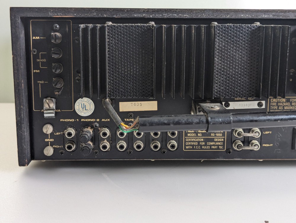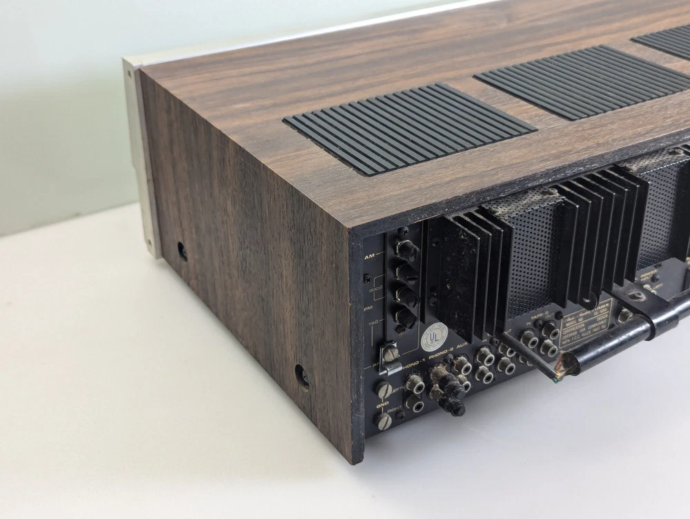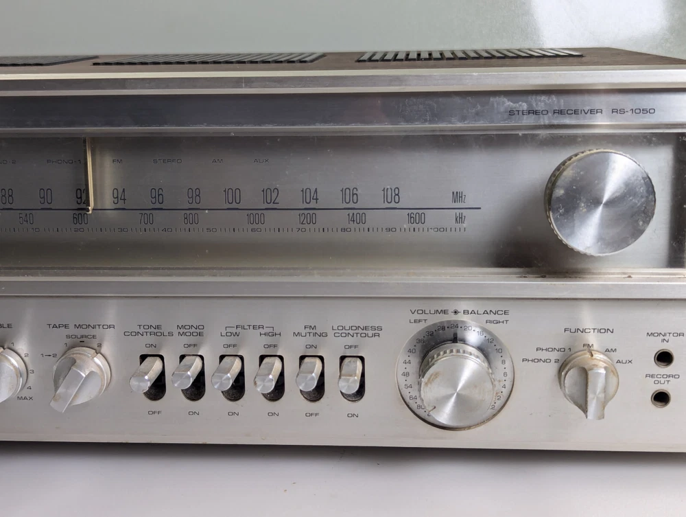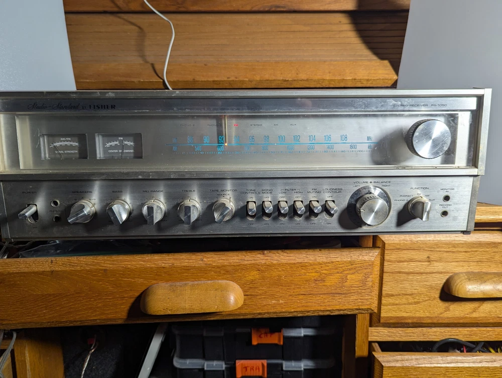 Fisher RS-1050 Stereo Receiver Tested Working Silver 1978 Japan Vintage 60 WPC Excellent cosmetic condition. All functions and inputs are working. Tuner strength meters work but the backlight bulbs are out as shown in the Video. The tuner dial and tuner face light up All knobs and toggles are present. A few scuffs and dings here and there (see pics). Minimal wear to brushed aluminum face. The vinyl-wrapped woody cover is in good condition (One hole where the screw goes, the wood es not strong ). I tested all of the inputs they are working properly, all of the output speakers work Knobs are smooth and functional but they need a good cleaning, Volume works but it may need a TCL spry for cleaning Sometimes the black dial is crackly, but the main Volume is working properly I did not test any of the front 1/4 outputs/inputs(I didn't think it was necessary ) Overall a very nice Vintage unit that you don't find every day It is a Beautiful baby for you but needs a good cleaning I only clean the inside which is why I open it up the outside I am scared to damage something(I did it before) so I leave it to the next owner There are some scuffs and scratches scattered about. It will come exactly as shown, so please see the photos! There could be times when my description is not that accurate, I do my research, and it is best to describe items so please look at the pictures they describe the item better than words.!