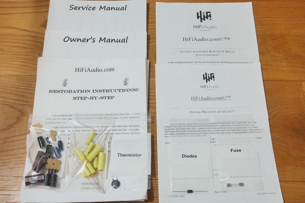 We may also be interested in purchasing your equipment. .. This listing is for 1 x FULL kit to be selected form the below list. Up for sale is Fisher SA300 restoration kit. This kit includes FULL restoration kit. ---------- The scarcity of good, honest techs who can do a good and reasonably priced restoration/rebuild of audio equipment (especially tube gear) made me start offering this restoration kit. In today's day and age it is very hard to come by a knowledgeable tech who can service your audio gear well. I have seen many poor quality restoration of equipment that cost way too much to its owners. In 99% of the cases there were only few parts replaced, instead of a full and proper restoration job. On the other hand, if one succeeded in finding a good tech, a wait time is usually 6-12 months for the unit to be serviced. In this kit I offer parts and instructions for a full/complete restoration of your audio equipment. I have been servicing audio equipment for many years and have developed deep respect toward all good equipment, especially tube gear. I really do think they sound amazing if properly restored. I have seen many bad quality restorations/fix jobs done to these units that made them sound cheap and very low quality. Knowing how amazing and warm these units can sound, I have decided to develop this kit to help you do a great job on your equipment. It includes very good upgrades and improvements that MUST be done to the unit. Please do your audio equipment a favor and replace the most important components that are most likely 90% dead. Power / Filter stage caps are those large silver cans mounted on top of the chassis and sometimes underneath. This restoration pack will make a huge difference in the sound quality. All the parts are of high quality Japanese Nichicon / Nippon / WIMA / IC / United Chemi capacitors. I provide several instructions on how to mount those new electrolytic caps. The best one is to rebuild those original cans. You will receive a step-by-step instructions and all the proper caps needed for that. This technique will keep the original look of the unit. I am extremely particular about the quality of the parts provided with this kit. Knowing how many bogus/fake caps, diodes, resistors etc. out there, I source all the parts from reputable whole-sellers and buy them in bulk. The knowledge that I am going to share with you have been acquired by me over many years serving audio equipment. Please be patient and let’s get your little birdy sing again. “They Shall Have Music” Avery Fisher Included in this kit: 1. Power/Filter stage upgrade with authentic Nichicon / Nippon / WIMA / IC / United Chemi electrolytic capacitors. 2. Detailed instruction with colorful images, schematics, manuals (all of these are in electronic form, I consider these much better than printed version due to zoom availability). 3. Schematics 4. Complete audio path upgrade with high quality WIMA or IC (Illinois capacitor) film capacitors. 5. Parts for compete recap of all the electrolytic capacitors. 6. Complete recap of all lytic, paper, film, oil caps. 7. Diodes. 8. Inrush thermistor (to limit the initial current inflow). 9. Bridge rectifier. 10. Transistors (PNP, NPN). 11. LED dial and indicator bulbs 12. 1 x main fuse 13. Instructions on how to clean the chassis. 14. Instructions on how to clean a faceplate 15. Instructions on how to polish knob covers. 16. Support/help to a reasonable extend in case you need it. (This is what makes us different from other sellers.) -------- Also available NEW production volume control -----------> LINK We may also be interested in purchasing your equipment. .. Feedback From Buyer Date/time Nice, Thank you. h********0 ( 1577 ) 2019-02-28 05:01:14 Please note a proper restoration must replace all electrolytic caps on all boards. DO not fall for partial kits that restore just one board ( power supply, power amp etc). Not only they supply inferior quality caps, but also trying to sell you a very bad idea of doing a partial recap. This is not a good/proper way to restore your audio equipment. A proper rebuild requires a full recap of all the PCBs. requires a full recap of all the PCBs.
