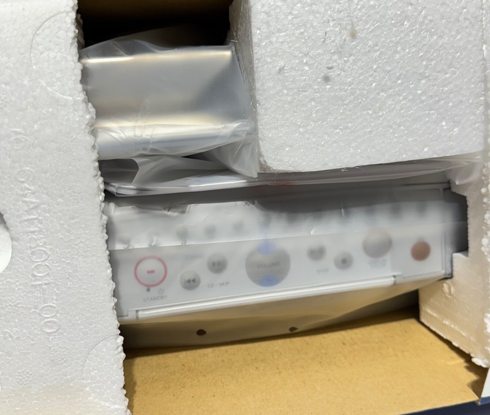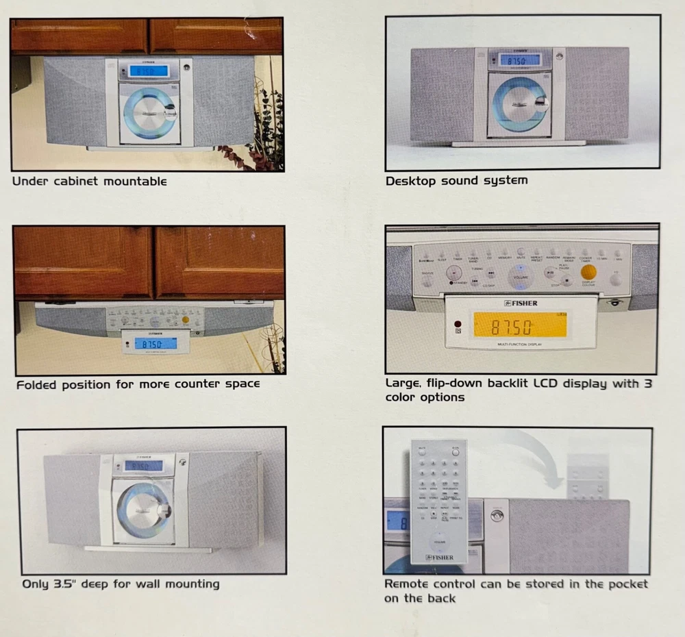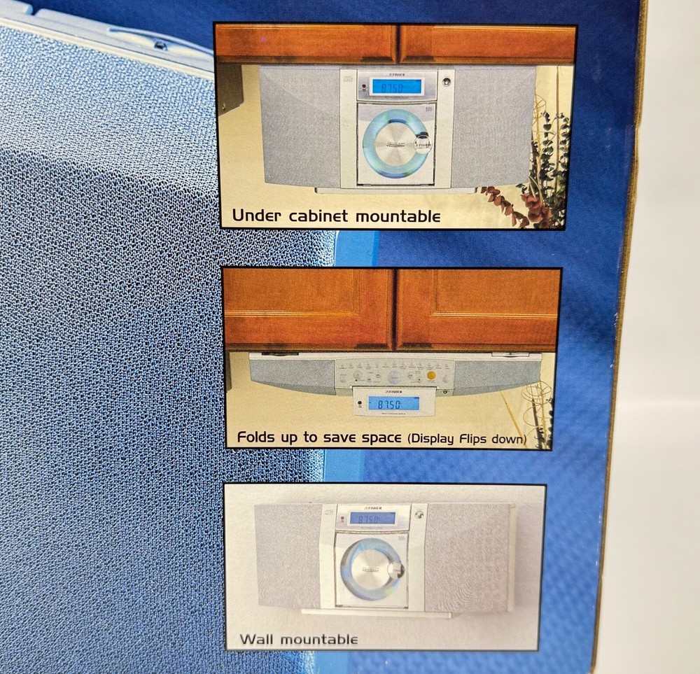 * New in box. All pieces and manual have never been removed from their factory sealed plastic wrap. Year of manufacture unknown. * Stereo can mounted under-cabinet, on a wall or simply sit on a desktop. * Box has wear and some light water stains with no effect on contents. See all photos. * Ships USPS Ground Advantage for free within one business day. * Thank you for looking and if you have any questions, please message me.
