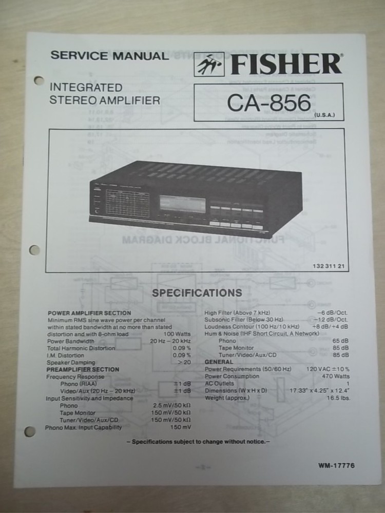 Fisher Service/Repair Manual~CA-856 Amplifier/Amp Up for sale is a factory issued Service Manual for the Fisher CA-856 Integrated Stereo Amplifier . Contains at a minimum: Specifications, Adjustments, Block Diagrams, Schematic Diagram and Parts List. Very good condition. Don't settle for hard to read copies or PDF's. T his is an original document. Tired of your improperly packed purchases getting damaged in shipping? I pack with care. I use a full sheet of rigid protective material, a plastic sleeve, a 'Please Do Not Bend' sticker, and free Delivery Confirmation. All of my items are originals, I do not deal in reproductions. I am happy to ship internationally. Payment is expected within 7 days from end of auction. ~I will combine shipping when possible. ~I am very good about shipping within 3 business days after payment is received. ~Once item is received please leave positive feedback and I will do the same. Track Page Views With Auctiva's FREE Counter
