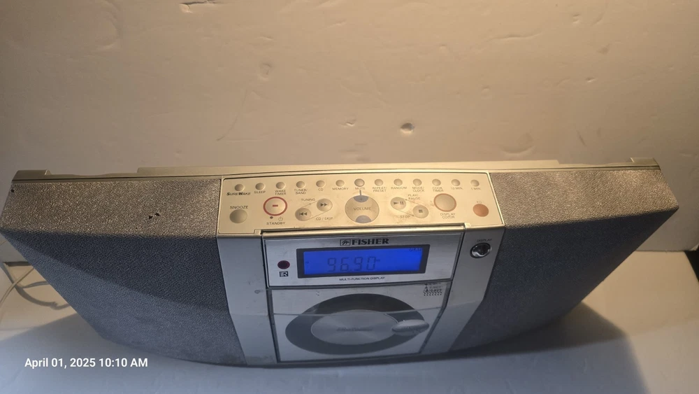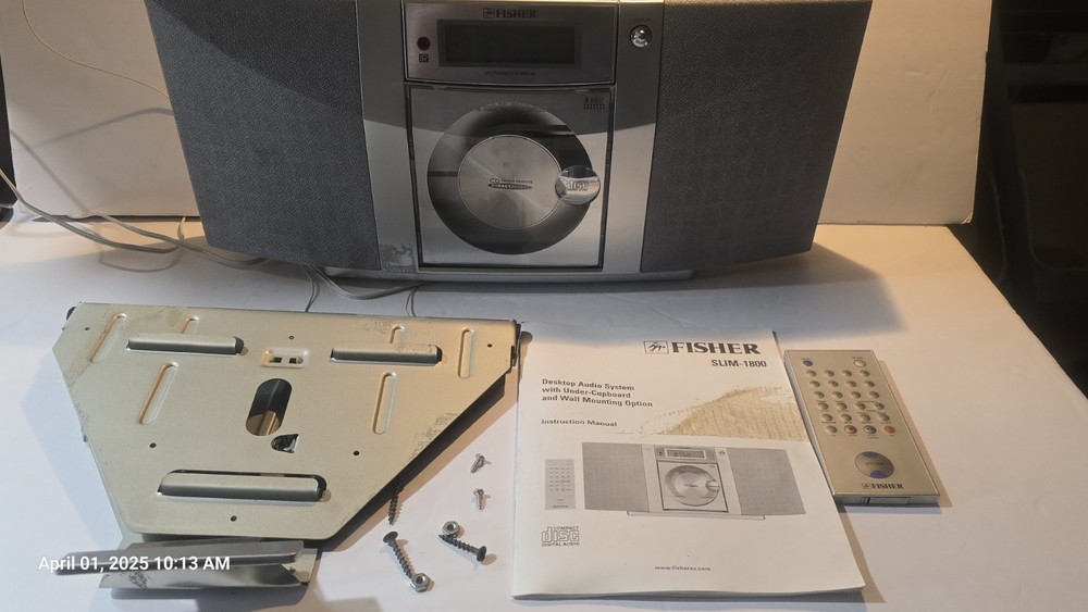 THIS HAS BEEN FULLY TESTED FOR FULL FUNCTION. The Fisher Slim-1800 Desktop Audio System is a sleek and versatile audio device designed for small spaces like kitchens or offices. It combines functionality with practicality, offering: AM/FM Stereo Tuner: Allows you to enjoy a range of radio stations. CD Player: Perfect for playing your favorite audio CDs. Cooking Timer: A thoughtful addition for convenience during meal preparation. Built-in Speakers: Provides clear and compact audio output. Placement Options: Slim design suitable for desktop use, under-cupboard installation, or wall mounting. Crafted with durable materials and manufactured in Japan during the early 2000s, it reflects a blend of utility and stylish design