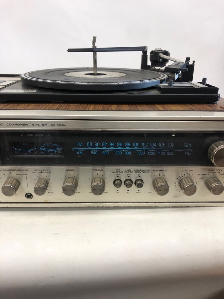 Vintage 1970s Fisher Stereo MC-4050 Audio Component System For Repair Designed to Play and Record 8-Tracks, Cassettes, and Stereo AM/FM NON Functional The Record Player and 8-Track Are Non Functional Powers On Measures 21" x 14 1/2" x 10" Includes Shell Shell But Needs New Latch Replacement For Parts or Restoration