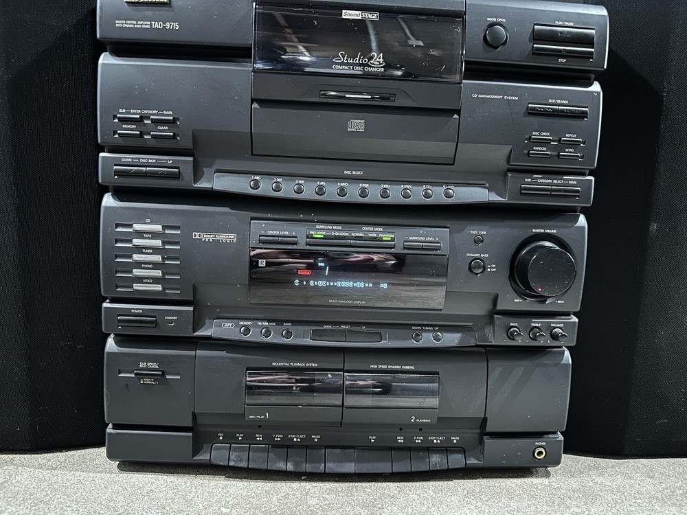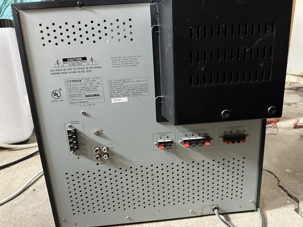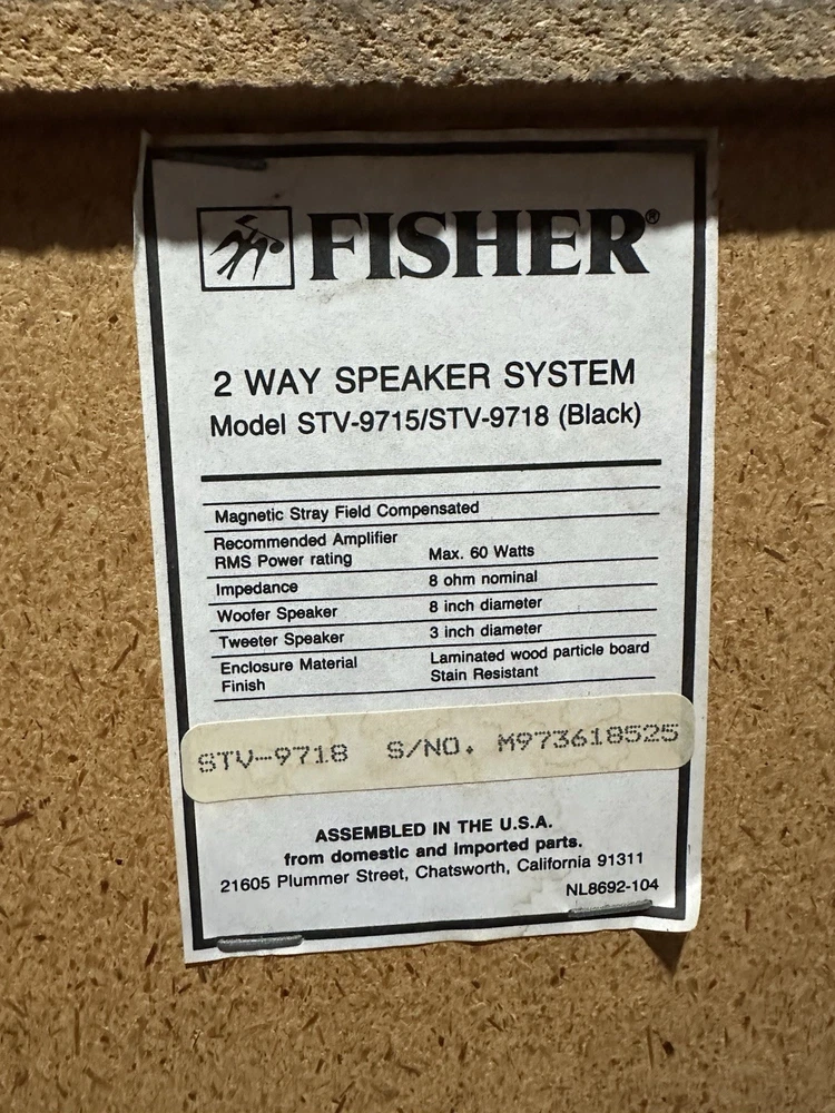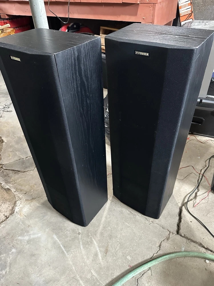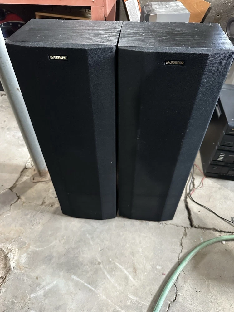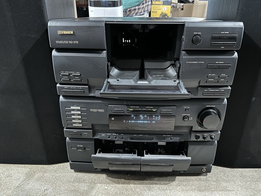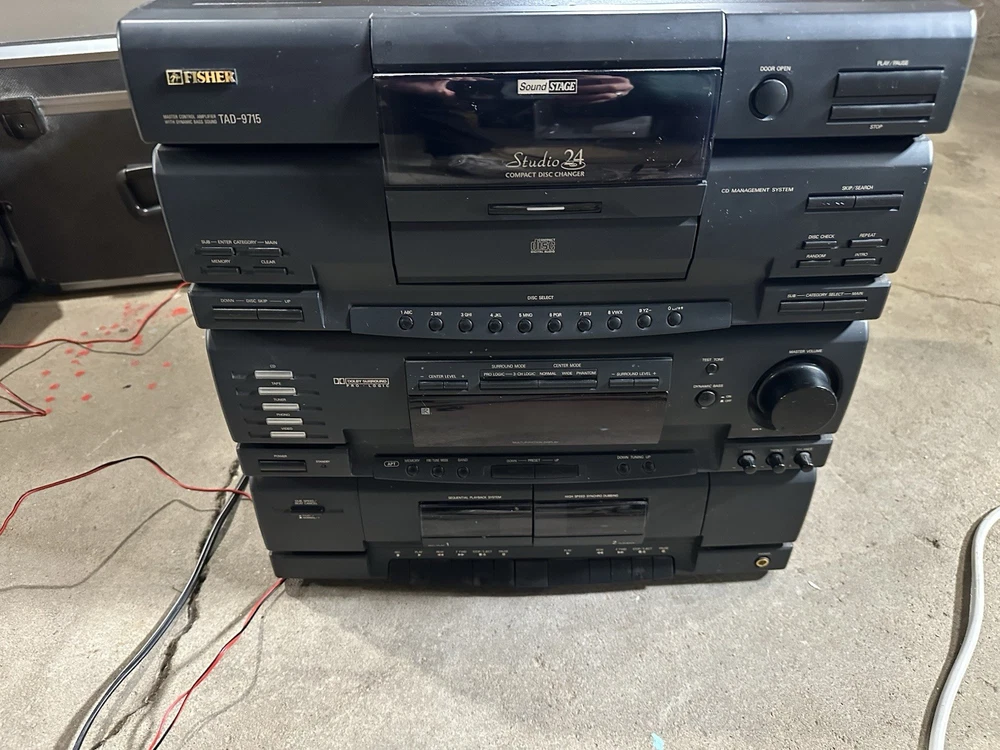 The Fisher Stereo System and Speakers, model TAD-9715, is a versatile all-in-one home audio system. Wired standing speakers are compatible with universal brands and models. Made of durable plastic material, these speakers offer 8 ohms impedance for clear sound quality. The speakers and stereo system both work perfectly fine. The audio is good from the speakers and includes a Studio 24 compact disc changer, a receiver/amplifier, and a dual cassette deck.