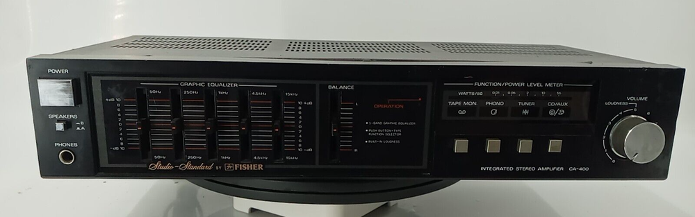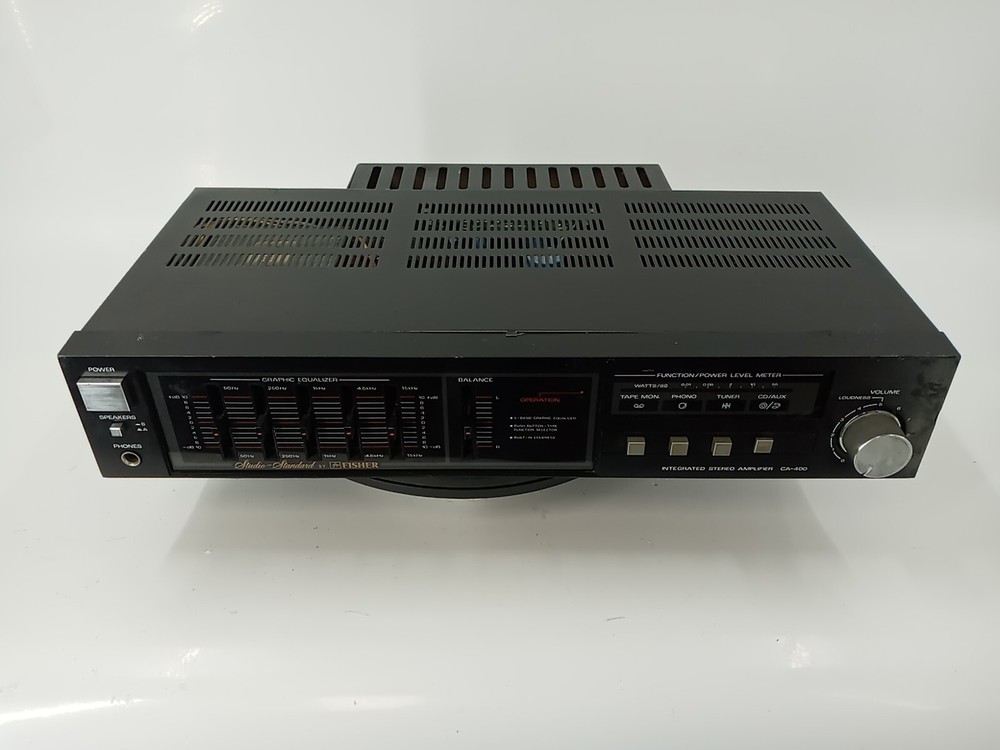 Fisher Studio Standard CA-400 Stereo Integrated Amplifier - TESTED - WORKS - Does not include the manual or any original packaging. Unit shows some wear and scratches, but overall is in good condition. The face is clean with a couple scuff marks, all buttons and knobs are clean and work as intended and all of the illumination works. Tested and in perfect working order. Unit is in good condition, with only minor cosmetic wear. Model #: CA-400 Serial #: 10211 8417 Electronics Disclaimer: All electronics are marked with tamper proof security seals and serial numbers are recorded to prevent fraud. We strive to take excellent pictures and describe items as thoroughly and accurately as possible, but please don't hesitate to ask any questions that you may have. Thanks for looking! SKU#: EB-15403