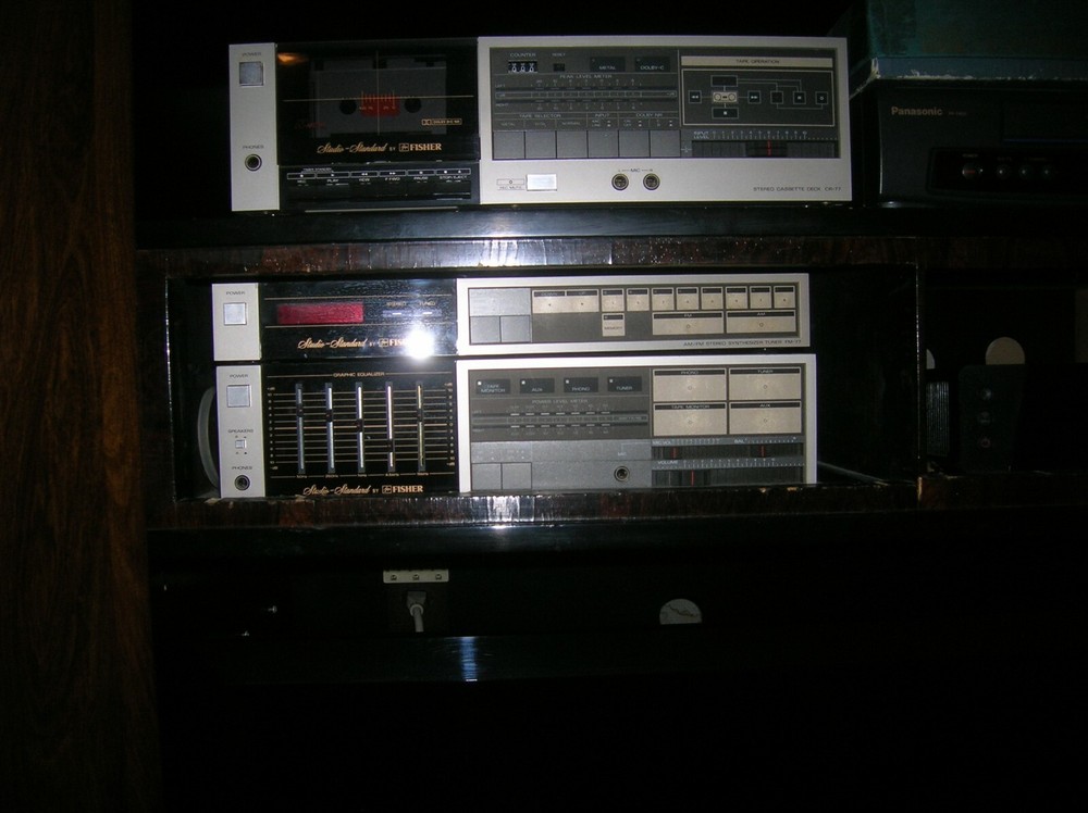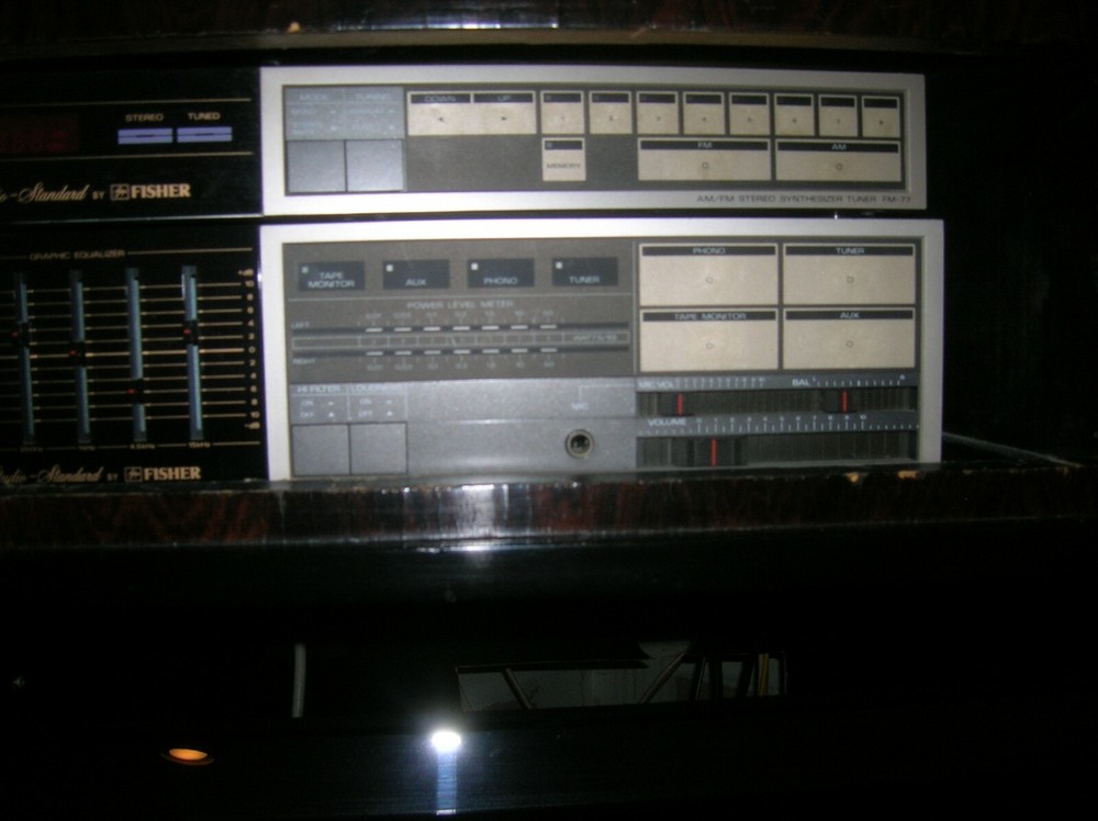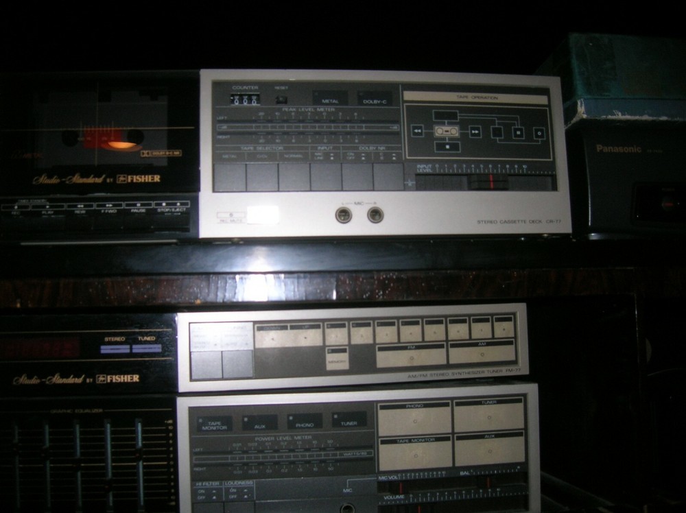 Fisher Studio Standard Stereo Synjthesizer Tuner, Amplifier, Cassette deck. Condition is "Used". Three items: 1) AM/FM Stereo synthesizer Tuner FM-77 2) Integrated Stereo Amplifier CA-77 3) stereo cassette deck CR-77 All in working condition To power onthe tuner plug it into the back of the stereo amplifier after the amplifier hasbeen plugged in to an outlet. These are vintage preowned items, and they have some scuffs/signs of use. They work! They do not comewith a remote. The tuner comes with attached audio cables, one antenna, and anattached power cord. The amplifier comes with an attached power cord as well.They do not come with any other cords/cables.