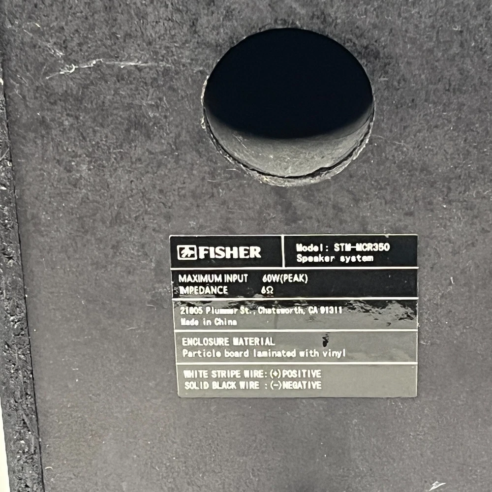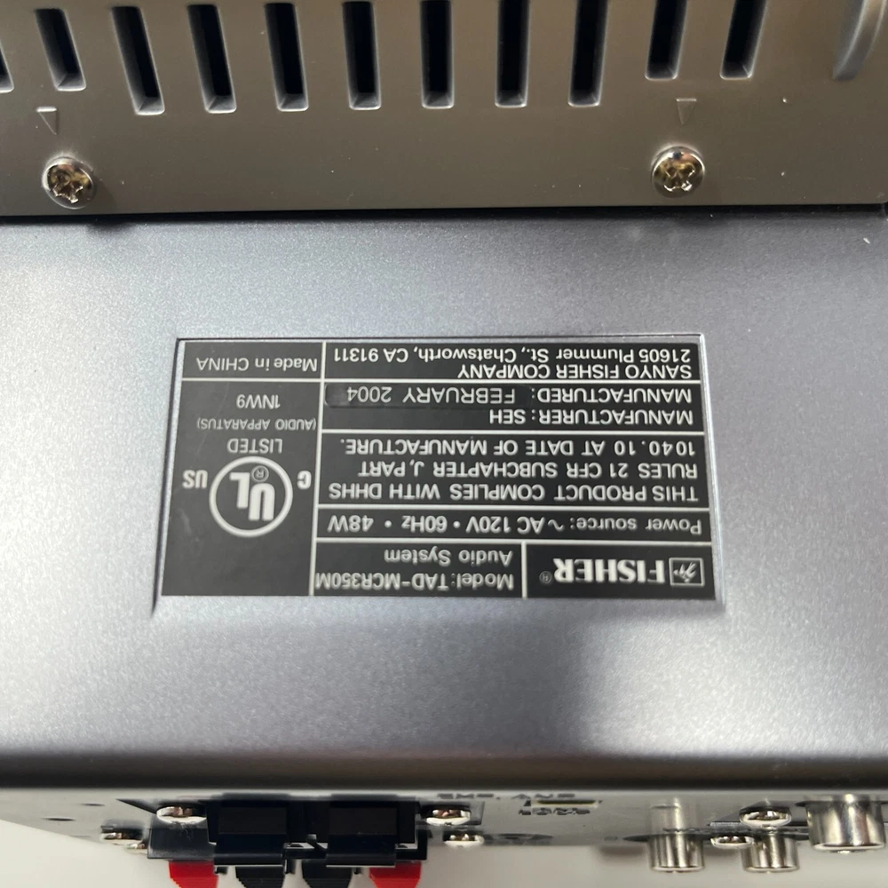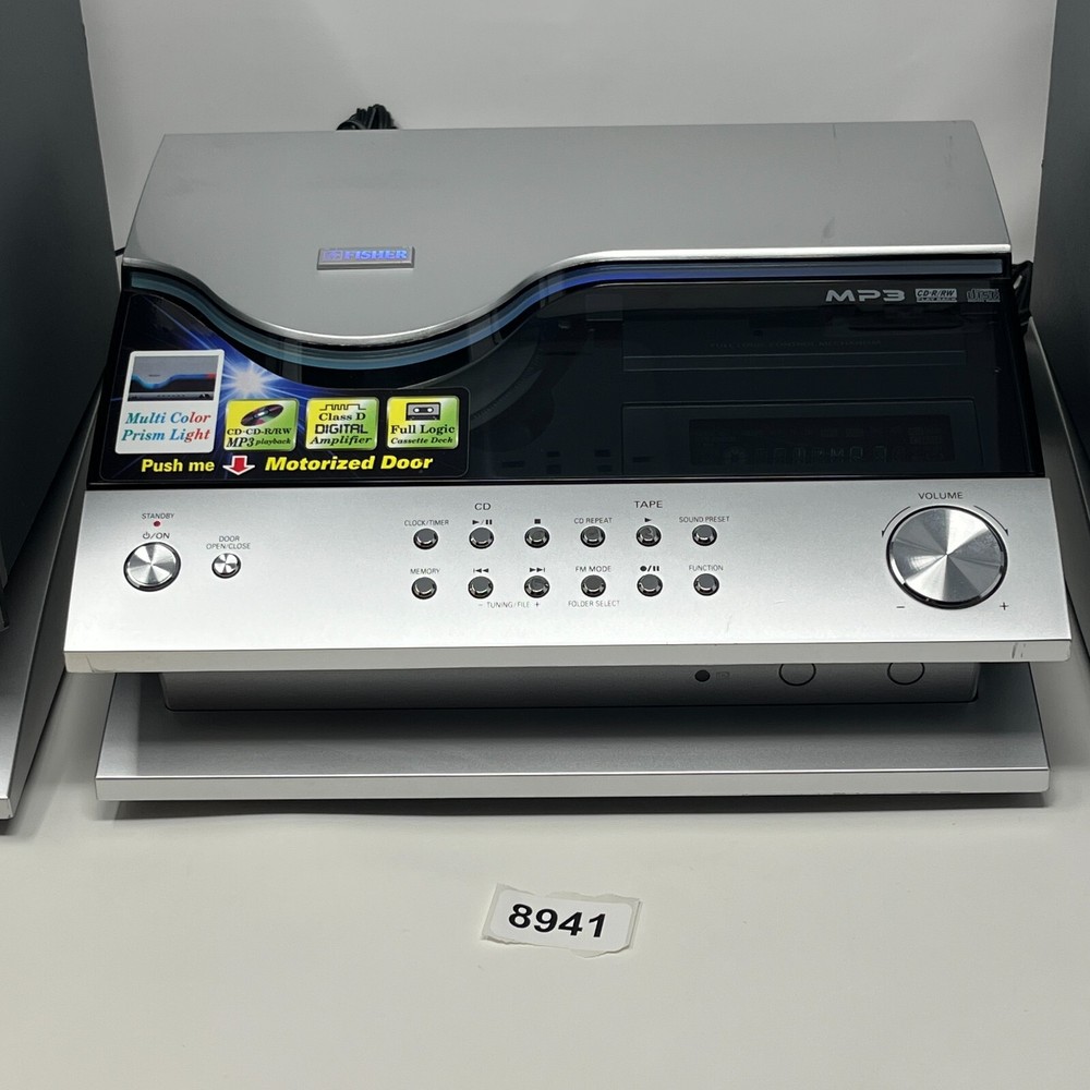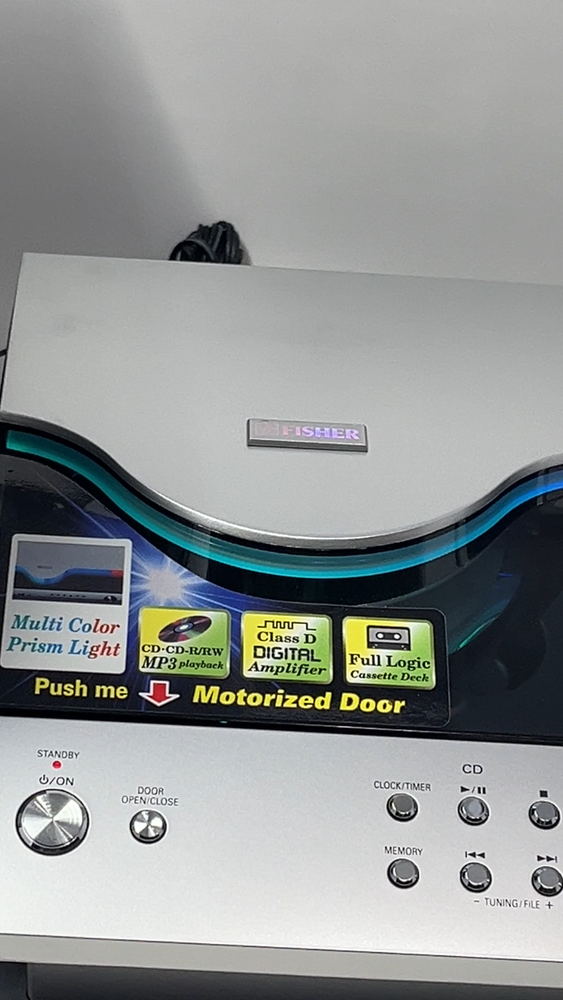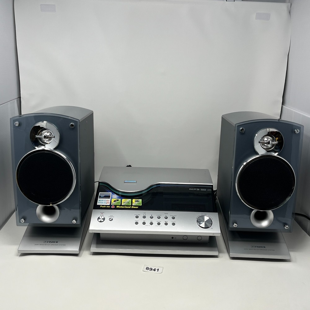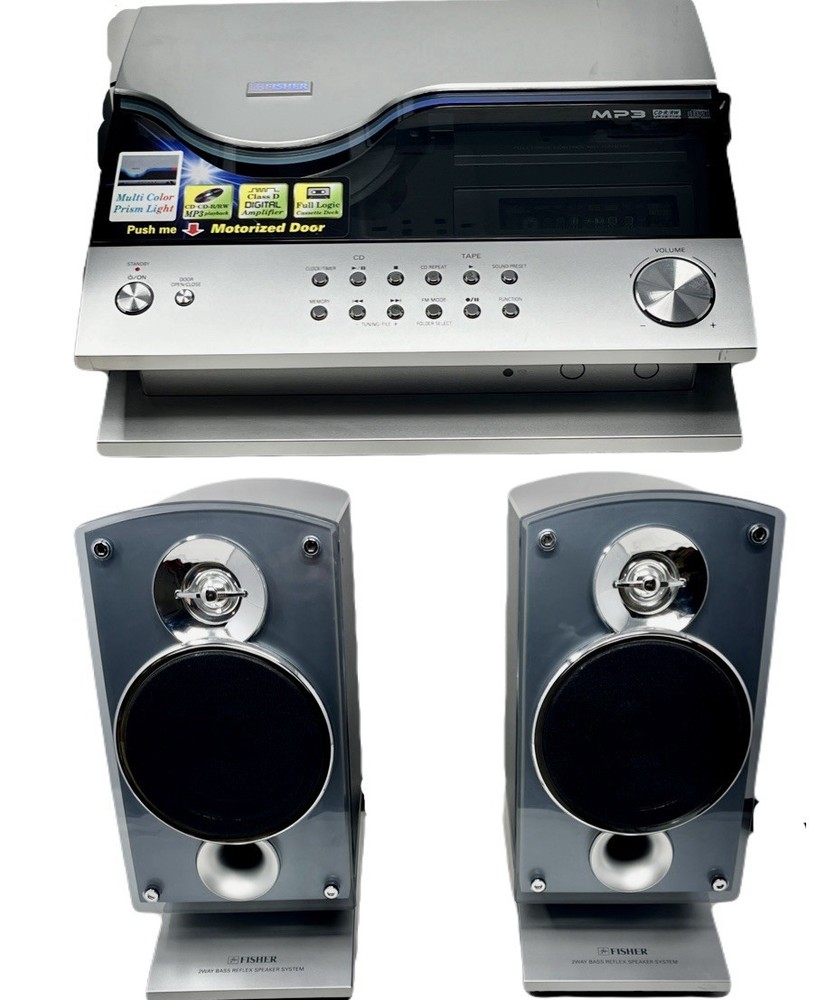 Fisher Audio System Model TAD-MCR350M TESTED working - 2 speakers and speaker wires - main unit with attached power cord - CD player - TAPE player - RGB LED lighting effects - motorized open/close SEE VIDEO Sounds great, has a few minor scrapes but overall is in great condition. Played both CD and TAPE and all functions worked. The is a RARE, COLLECTIBLE & MODERN micro system The COOL FACTOR on this unit is very high. WHen power off the LED lights go into a subtle slow color mode. The unit does not open while playing and during initial bootup sequence. During testing we found best operation to be: 1) press mode of operation: CD or TAPE 2) then press OPEN/CLOSE button There is also AM/FM radio as well. The LED display is readable but is somewhat dim, and at the angle of the unit, which can help or hinder visiblity. But is readable looking directly from above. Just setting expectations. I don't think the dimness is anything but OEM, but view before buying. There may be a setting to raise/lower brightness -- this was next checked or tested due to time limitations. No instructions. No original box. No Remote Control.