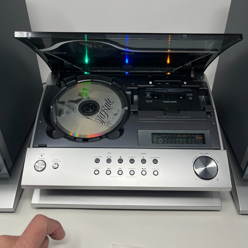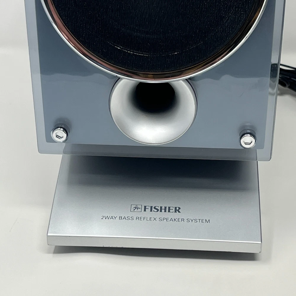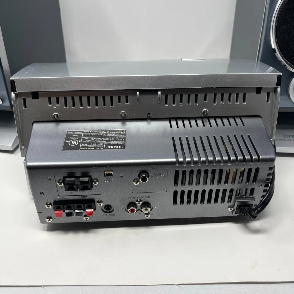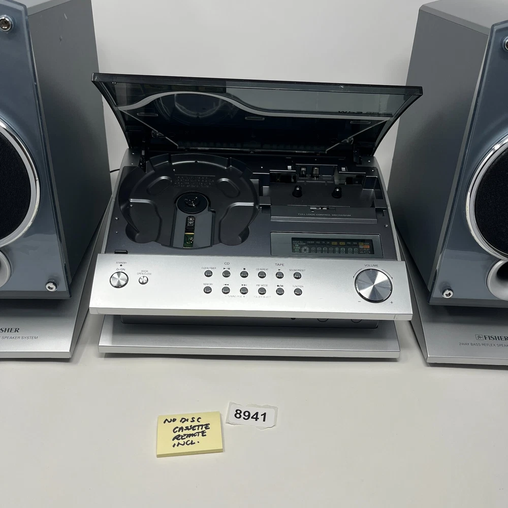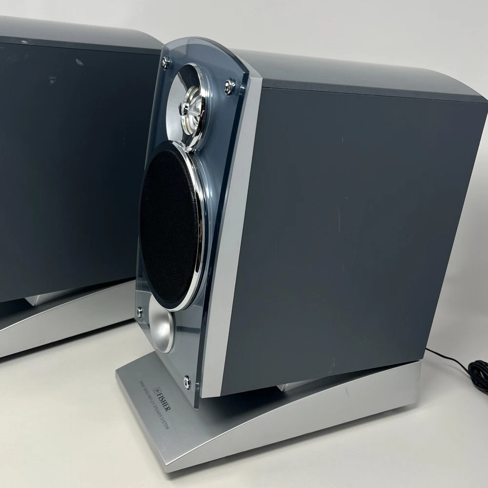 Fisher Audio System Model TAD-MCR350M TESTED working - 2 speakers and speaker wires - main unit with attached power cord - CD player - TAPE player - RGB LED lighting effects - motorized open/close SEE VIDEO Sounds great, has a few minor scrapes but overall is in great condition. Played both CD and TAPE and all functions worked. The is a RARE, COLLECTIBLE & MODERN micro system The COOL FACTOR on this unit is very high. WHen power off the LED lights go into a subtle slow color mode. The unit does not open while playing and during initial bootup sequence. During testing we found best operation to be: 1) press mode of operation: CD or TAPE 2) then press OPEN/CLOSE button There is also AM/FM radio as well. The LED display is readable but is somewhat dim, and at the angle of the unit, which can help or hinder visiblity. But is readable looking directly from above. Just setting expectations. I don't think the dimness is anything but OEM, but view before buying. There may be a setting to raise/lower brightness -- this was next checked or tested due to time limitations. No instructions. No original box. No Remote Control.