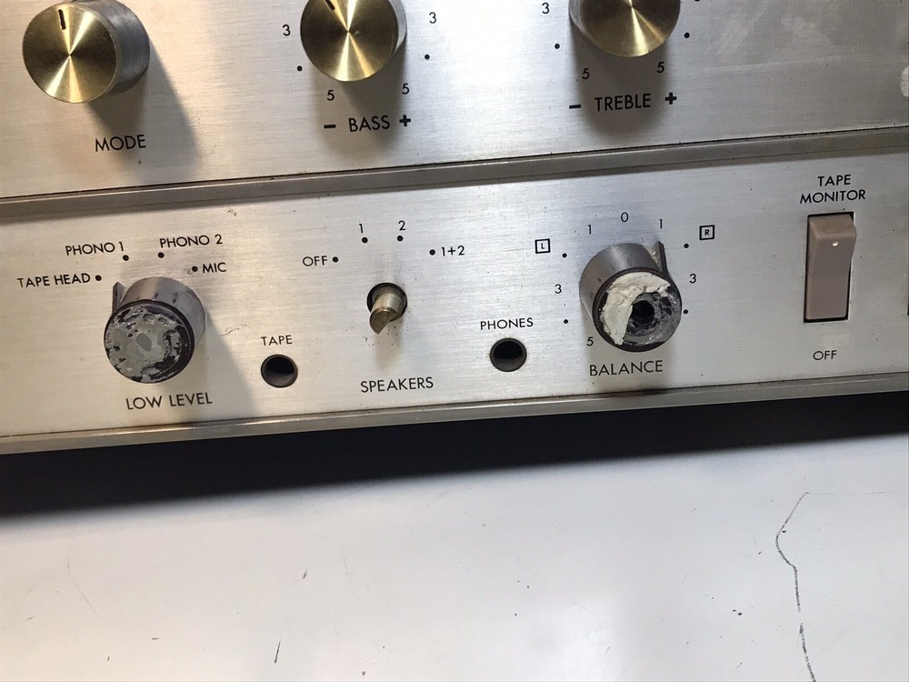 One knob has a dent nearby and is harder to turn, missing a knob as well as a stability peg on the bottom.