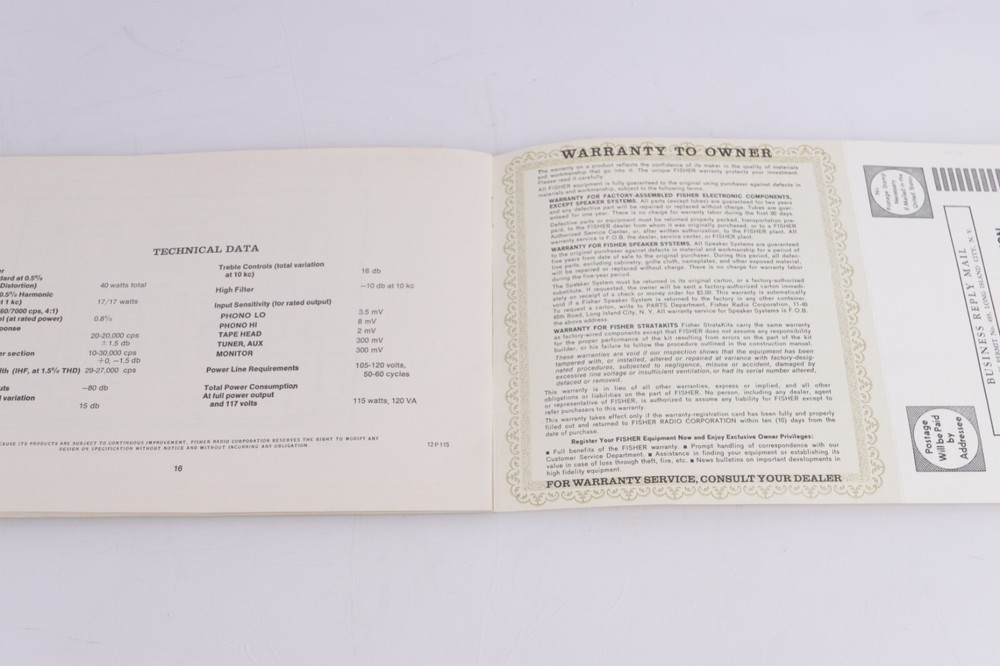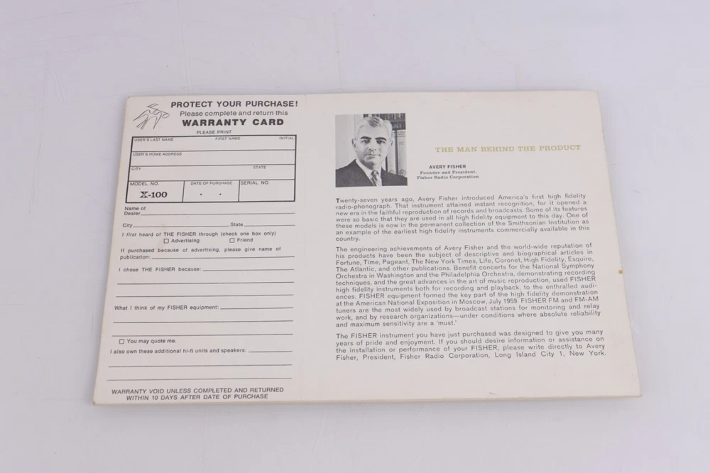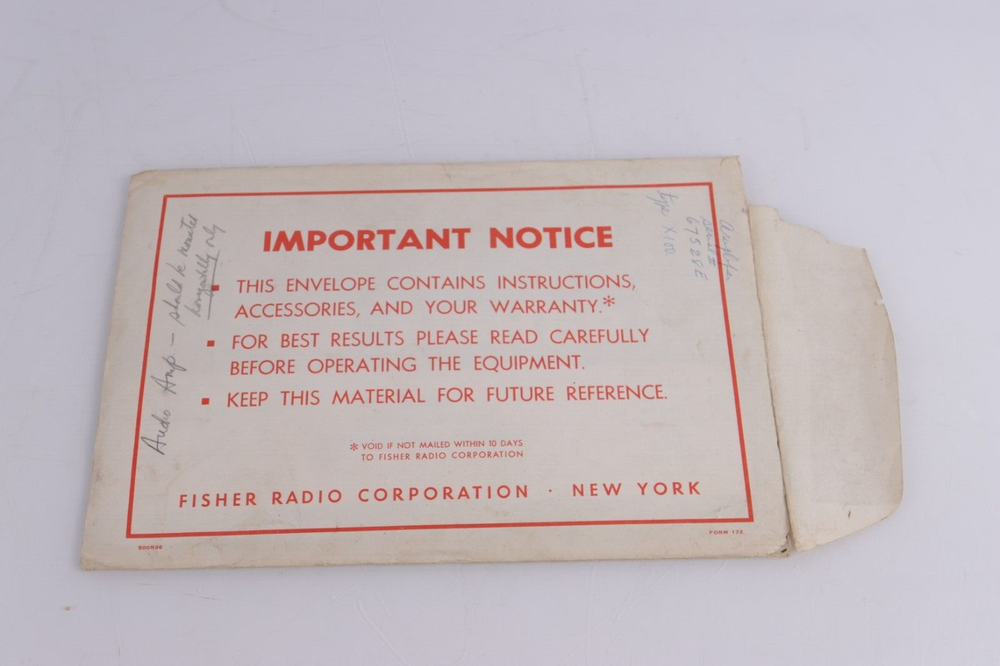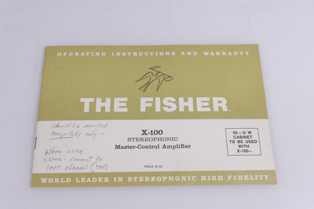 Fisher X-100 Master-Control Amplifier Operating Instructions and Warranty. Nice to have to go with your amplifier. Original, not reproduction. Shows only light general wear. Buyer pays $5 shipping in CONUS.