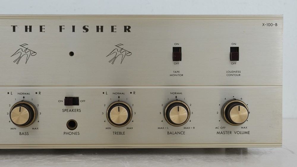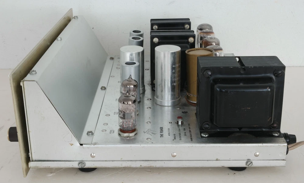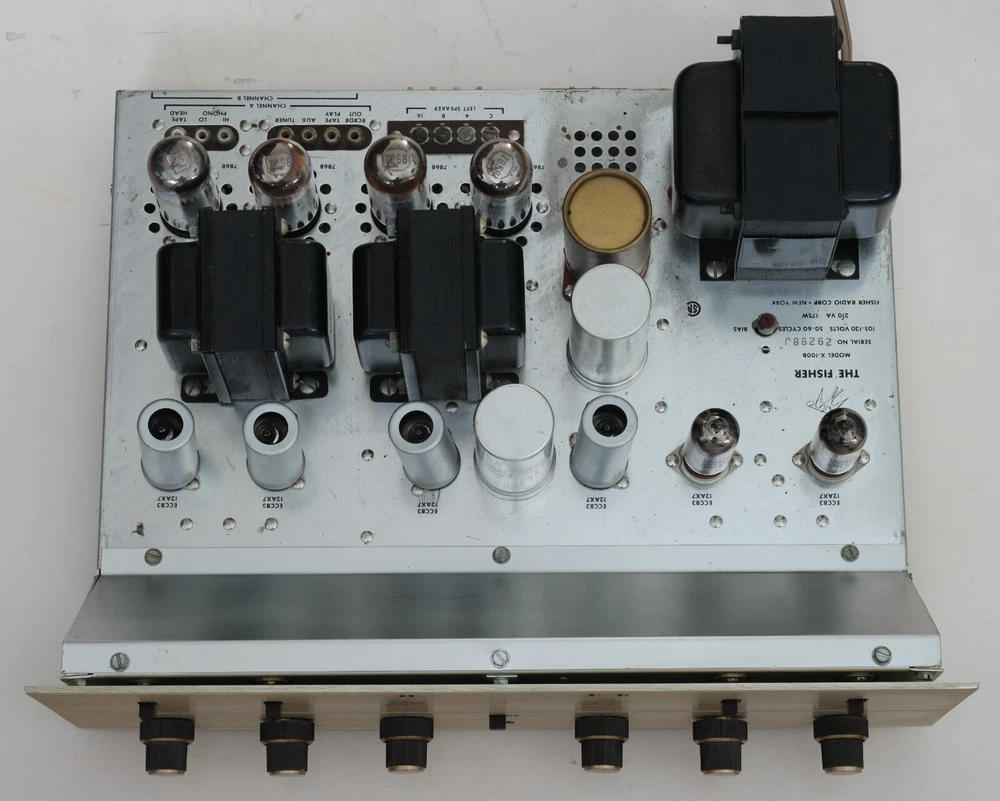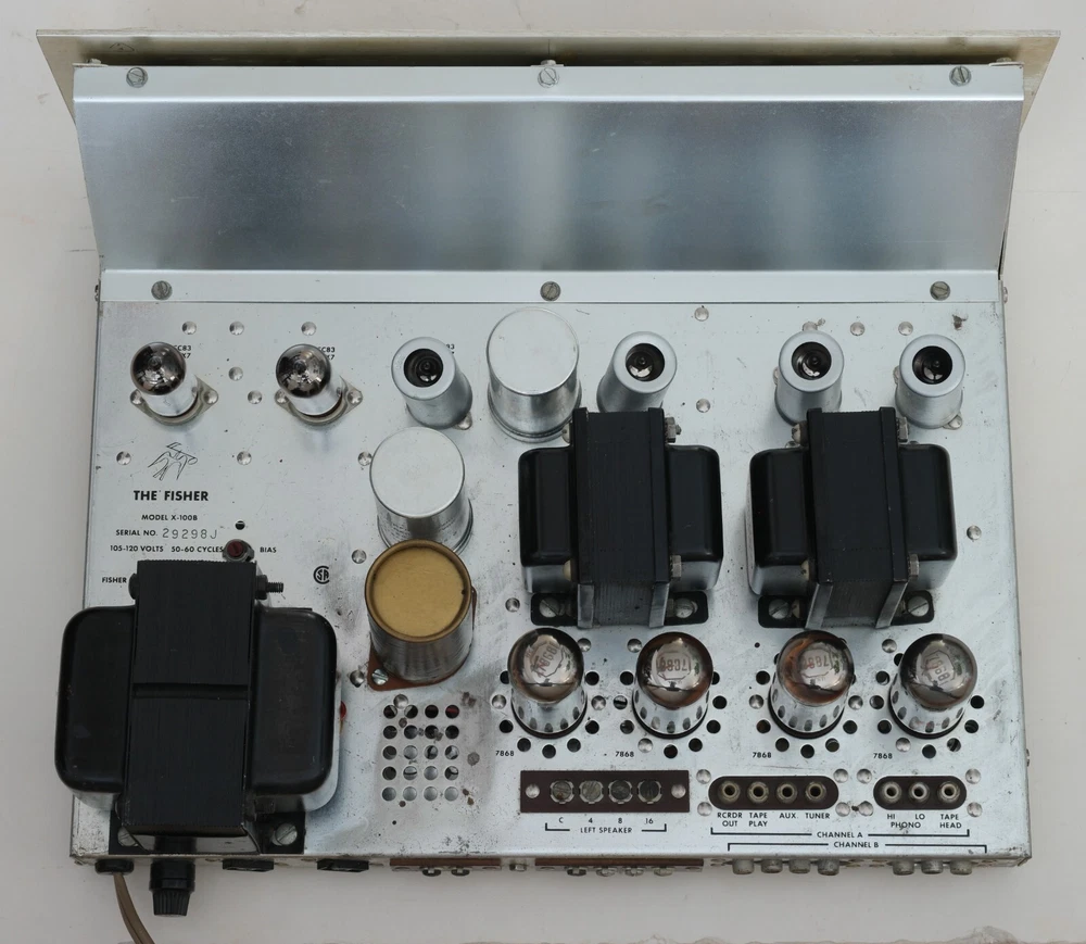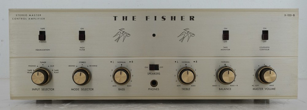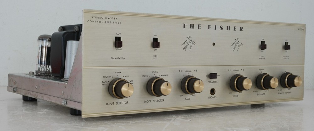 Fisher X-100-B Stereo Master Control Amplifier Good Working Condition!!! Up for sale is a good working order Fisher X-100-B Stereo Master Control Amplifier . As the photos show, this is in good condition for its age. It has scratches and nicks. Jewel for lamp is missing. Perhaps the previous owner replaced one of the can capacitors and some of the signal line capacitors and silicon diodes. I tested tubes on my TV7B/U tube tester. 1. ECC83/12AX7A : New Sovtek 12AX7WXT+ ( Triple Mica, Minimum is 32/32. ) - Results : 62/62, 62/63, 61/63, 63/62, 62/59, 66/66 2 . 7868 : RCA ( Minimum is 42. ), Matched Quad - Results : 71/72/74/74 Please look at all the pictures for an over all condition, before bidding. All items are offered for sale locally therefore listings may end without notice ( CraigsList-Princeton ). What you see is exactly what you get. Please see the photos for condition details and judge for yourself. All items are sold in the condition shown in photos and "as is" condition, with no warranties. If you have any questions please email me. No returns please! Shipping to Continental United States Only (48 States). Thank You for looking, and good luck with your bids!!!