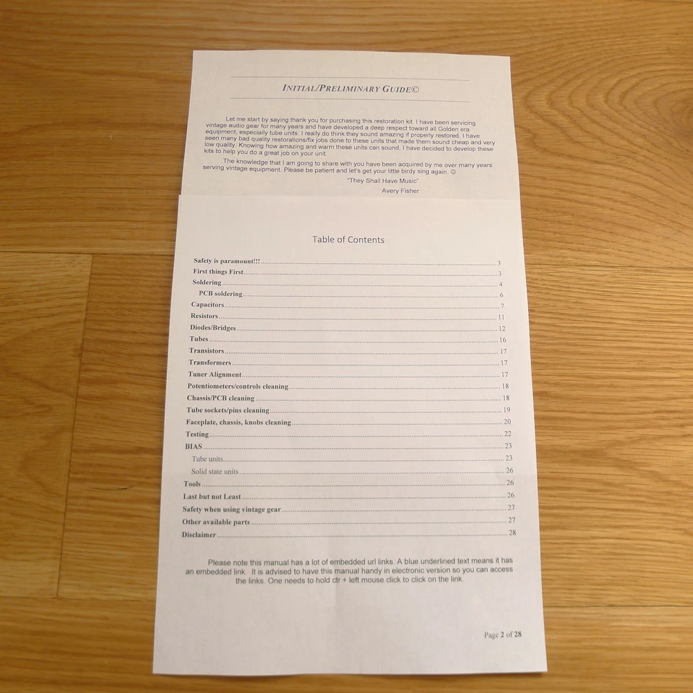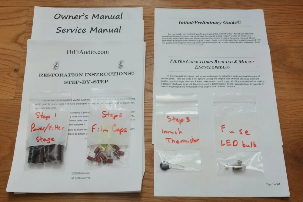 This listing is for 1 x FULL kit for X-101, X-101-ST amp. ---------- The scarcity of good, honest techs who can do a good and reasonably priced restoration/rebuild of audio equipment (especially tube gear) made me start offering this restoration kit. In today's day and age it is very hard to come by a knowledgeable tech who can service your audio gear well. I have seen many poor quality restoration of equipment that cost way too much to its owners. In 99% of the cases there were only few parts replaced, instead of a full and proper restoration job. On the other hand, if one succeeded in finding a good tech, a wait time is usually 6-12 months for the unit to be serviced. In this kit I offer parts and instructions for a full/complete restoration of your audio equipment. I have been servicing audio equipment for many years and have developed deep respect toward all good equipment, especially tube gear. I really do think they sound amazing if properly restored. I have seen many bad quality restorations/fix jobs done to these units that made them sound cheap and very low quality. Knowing how amazing and warm these units can sound, I have decided to develop this kit to help you do a great job on your equipment. It includes very good upgrades and improvements that MUST be done to the unit. Please do your audio equipment a favor and replace the most important components that are most likely 90% dead. Power / Filter stage caps are those large silver cans mounted on top of the chassis and sometimes underneath. This restoration pack will make a huge difference in the sound quality. All the parts are of high quality Japanese Nichicon / Nippon / IC / United Chemi capacitors. I provide several instructions on how to mount those new electrolytic caps. The best one is to rebuild those original cans. You will receive a step-by-step instructions and all the proper caps needed for that. This technique will keep the original look of the unit. I am extremely particular about the quality of the parts provided with this kit. Knowing how many bogus/fake caps, diodes, resistors etc. out there, I source all the parts from reputable whole-sellers and buy them in bulk. The knowledge that I am going to share with you have been acquired by me over many years serving audio equipment. Please be patient and let’s get your little birdy sing again. “They Shall Have Music” Avery Fisher Included in this kit: 1. Power/Filter stage upgrade with authentic Nichicon / Nippon / IC / United Chemi electrolytic capacitors. 2. Detailed instruction with colorful images, schematics, manuals (all of these are in electronic form, I consider these much better than printed version due to zoom availability). 3. Schematics 4. Complete audio path upgrade with high quality US made (IC) or Nippon audio grade film capacitors. 5. Parts for compete recap of all the electrolytic capacitors. 6. Complete recap of all oil, film, lytic, paper caps. 7. Diodes (if your unit has selenium diodes) 8. Inrush thermistor (to limit the initial current inflow). 9. Bridge rectifier (if the original is selenium). 10. Transistors (PNP, NPN). 11. LED dial and indicator bulbs 12. 1 x main fuse 13. Instructions on how to clean the chassis and the glass. 14. Instructions on how to clean a faceplate 15. Instructions on how to polish knob covers. 16. Support/help to a reasonable extend in case you need it. (This is what makes us different from other sellers.) -------- Also available NEW production volume control -----------> LINK We may also be interested in purchasing your equipment. Feedback From Buyer Date/time Fast shipping. As described. A+++ 5***s ( 683 ) 2019-08-13 18:12:21 Thank you h*****c ( 299 ) 2019-08-13 07:27:17 Item worked great s*********n ( 175 ) 2019-08-12 23:05:41 great seller and fast shipping. thank you. s***********a ( 709 ) 2019-08-12 16:36:50 Item as Desribed. n*********0 ( 28 ) 2019-08-12 12:56:34 FANTASTIC SELLER 5 STARS ***** THANKS. a************y ( 140 ) 2019-08-12 01:58:25 Installation was easy. b*********s ( 75 ) 2019-08-11 15:37:36 excellent quality parts! Great seller. a******2 ( 264 ) 2019-08-11 11:07:40 Great seller, fantastic instructions! b*****s ( 361 ) 2019-08-10 20:47:46 PCBs. requires a full recap of all the PCBs.