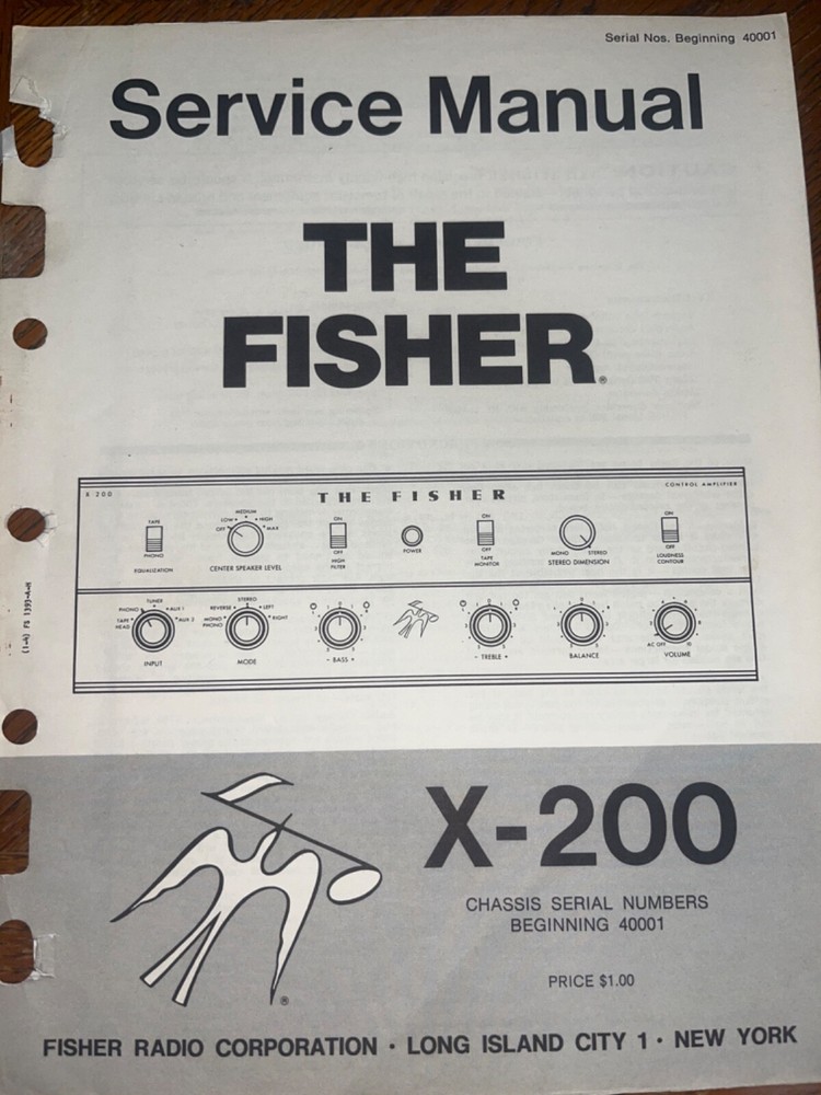 I am selling an Original Fisher X-200 Amplifier Service Manual.. Item was used at a repair center .. Item will be shipped USPS Media Mail..