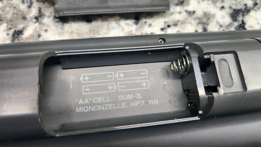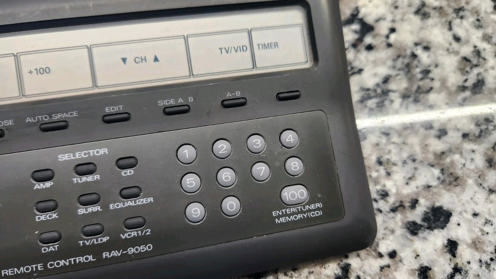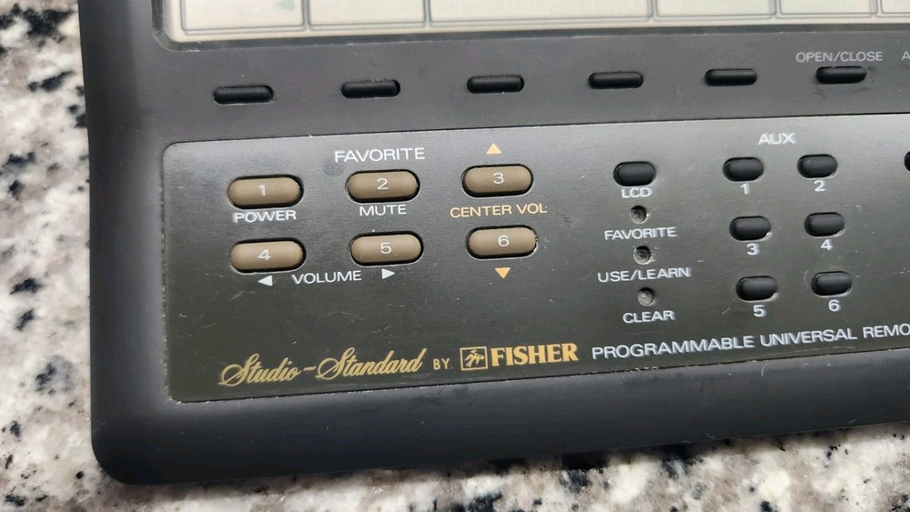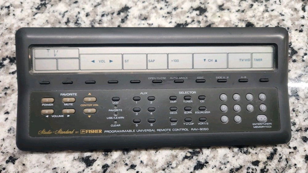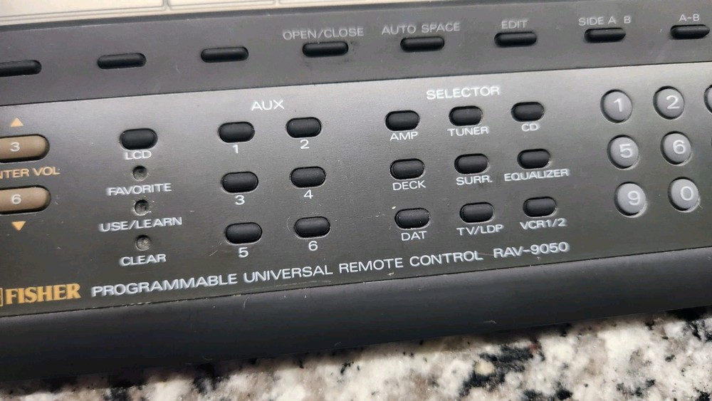 Battery cover is loose, will need tape to close. This is a Fisher brand remote control model RAV-9050. It is a basic remote control designed for use with Fisher audio systems. It has buttons for controlling volume, bass, treble, and power. The design is simple and easy to use.