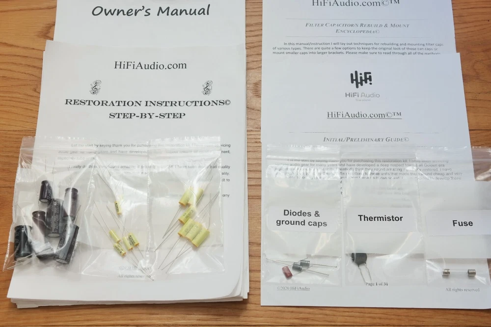 The scarcity of good, honest techs who can do good and reasonably priced restoration/rebuild of audio equipment inspired me to create this restoration kit. In today's day and age, it is difficult to find a knowledgeable technician who can service your audio gear properly. I have seen many poor quality restorations of equipment that cost way too much for their owners. In 99% of the cases, only a few parts were replaced, instead of a full and proper restoration job. A proper restoration must replace all electrolytic, paper, film, oil capacitors. Do not fall for partial kits. This is not a good or proper way to restore your audio equipment. It is the same as with car tires; one should never replace just one tire and keep the other worn-out tires on. A proper rebuild requires a full recap of all oil, paper, lytic capacitors. On the other hand, if one succeeds in finding a good tech, the wait time is usually 6-12 months for the unit to be serviced, and costs are sky-high. I have been servicing audio equipment for many years and have developed deep respect for all good equipment. Knowing how amazing and warm these units can sound, I decided to put together this kit. It includes very good upgrades and improvements that must be done to the unit. This restoration kit will make a huge difference in the sound quality. All the parts are of high-quality Japanese Nichicon / Rubycon / IC / United Chemi capacitors. I am extremely particular about the quality of the parts provided in this kit. Knowing how many bogus/fake caps, diodes, resistors, etc. are out there, I source all the parts from reputable wholesalers and buy them in bulk. Vintage audio equipment has the potential to deliver rich and authentic sound when it is properly restored. Not only can it enhance your listening experience, but it can also evoke memories and bring joy to your life. Let's work together to bring your vintage gear back to its full potential, and make sure you have the music you deserve. ♩♬♫♪♫♩♬ “They Shall Have Music”- Avery Fisher Included in this kit: 1. Power/Filter stage capacitors ( Nichicon / Nippon / United Chemi) electrolytic capacitors. Note, the image with silver multicap cans shown restaffed with new caps is for illustration purpose only. 2. Detailed instruction with colorful images, schematics, manuals (all of these are in electronic form, I consider these much better than printed version due to zoom availability). 3. Schematics (all of these are in electronic form, I consider these much better than printed version due to zoom availability). 4. Complete audio path upgrade with high quality US made (IC) or Nippon audio grade film capacitors. 5. Parts for compete recap of all the electrolytic capacitors. 6. Complete recap of all oil, film, paper, lytic caps. 7. fuse/s 8. Instructions on how to clean the chassis. 9. Instructions on how to clean a faceplate 10. Instructions on how to polish knob covers. 11. Support/help to a reasonable extend in case you need it. (This is what makes us different from other sellers.) We also offer a great selection of Restoration Kits , LED conversion kits , Volume Controls , Rotary Switches and other rare/unique parts; Make sure to check our store ---------> LINK (Use the search bar inside the shop to find what you need faster) We may also be interested in purchasing your equipment