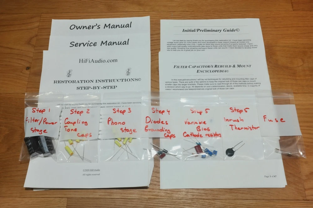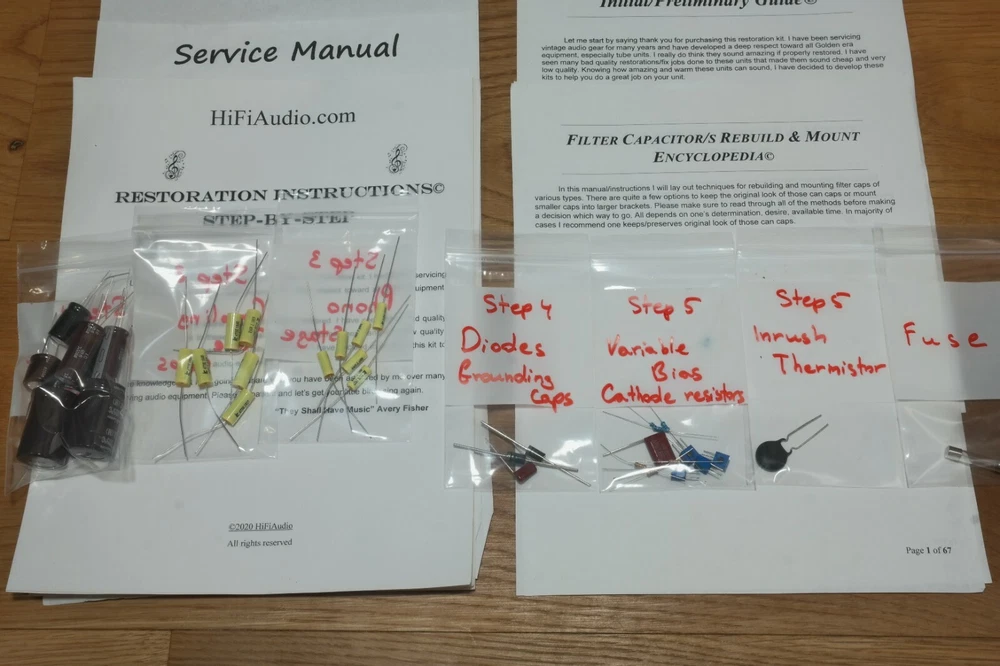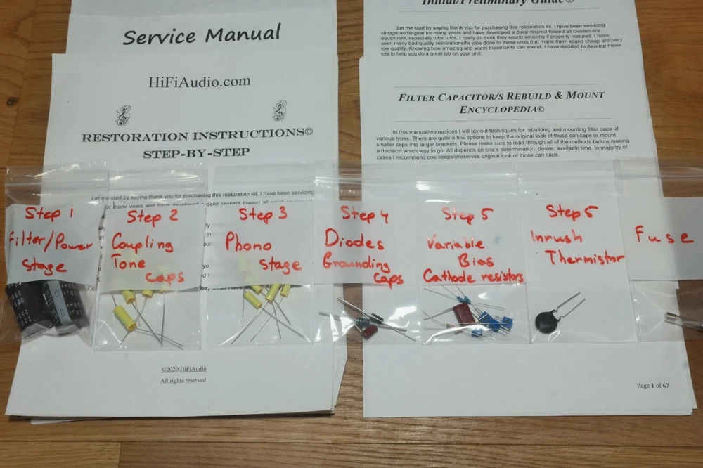 This listing is for 1 x FULL kit for x100c amp. ---------- The scarcity of good, honest techs who can do a good and reasonably priced restoration/rebuild of audio equipment (especially tube gear) made me start offering this restoration kit. In today's day and age it is very hard to come by a knowledgeable tech who can service your audio gear well. I have seen many poor quality restoration of equipment that cost way too much to its owners. In 99% of the cases there were only few parts replaced, instead of a full and proper restoration job. On the other hand, if one succeeded in finding a good tech, a wait time is usually 6-12 months for the unit to be serviced. In this kit I offer parts and instructions for a full/complete restoration of your audio equipment. I have been servicing audio equipment for many years and have developed deep respect toward all good equipment, especially tube gear. I really do think they sound amazing if properly restored. I have seen many bad quality restorations/fix jobs done to these units that made them sound cheap and very low quality. Knowing how amazing and warm these units can sound, I have decided to develop this kit to help you do a great job on your equipment. It includes very good upgrades and improvements that MUST be done to the unit. Please do your audio equipment a favor and replace the most important components that are most likely 90% dead. Power / Filter stage caps are those large silver cans mounted on top of the chassis and sometimes underneath. This restoration pack will make a huge difference in the sound quality. All the parts are of high quality Japanese Nichicon / Nippon / IC / United Chemi capacitors. I provide several instructions on how to mount those new electrolytic caps. The best one is to rebuild those original cans. You will receive a step-by-step instructions and all the proper caps needed for that. This technique will keep the original look of the unit. I am extremely particular about the quality of the parts provided with this kit. Knowing how many bogus/fake caps, diodes, resistors etc. out there, I source all the parts from reputable whole-sellers and buy them in bulk. The knowledge that I am going to share with you have been acquired by me over many years serving audio equipment. Please be patient and let’s get your little birdy sing again. “They Shall Have Music” Avery Fisher Included in this kit: 1. Power/Filter stage upgrade with authentic Nichicon / Nippon / IC / United Chemi electrolytic capacitors. 2. Detailed instruction with colorful images, schematics, manuals (all of these are in electronic form, I consider these much better than printed version due to zoom availability). 3. Schematics 4. Complete audio path upgrade with high quality US made (IC) or Nippon audio grade film capacitors. 5. Parts for compete recap of all the electrolytic capacitors. 6. Complete recap of all oil, paper, film, lytic capacitors. 7. Diodes. 8. Inrush thermistor (to limit the initial current inflow). 9. Bridge rectifier. 10. Transistors (PNP, NPN). 11. LED dial and indicator bulbs 12. 1 x main fuse 13. Instructions on how to clean the chassis. 14. Instructions on how to clean a faceplate 15. Instructions on how to polish knob covers. 16. Support/help to a reasonable extend in case you need it. (This is what makes us different from other sellers.) -------- Also available NEW production volume control -----------> LINK We may also be interested in purchasing your equipment. Feedback From Buyer Date/time SUPER SELLER!!! GREAT SERVICE!!! RECOMMEND TO EVERYONE!!! m********4 ( 317 ) 2018-10-11 18:35:11 PCBs. requires a full recap of all the PCBs.