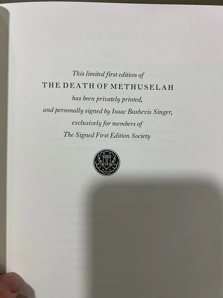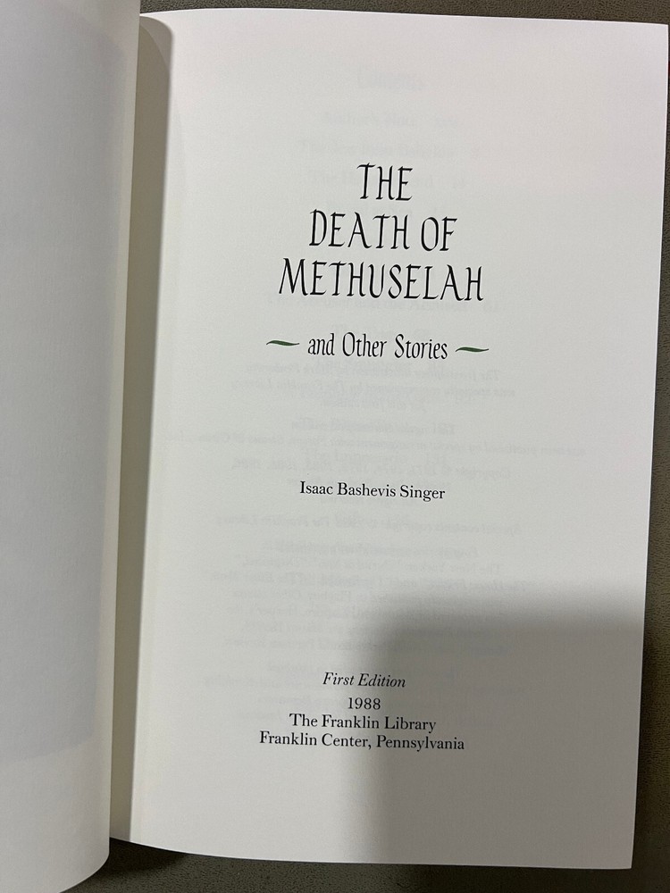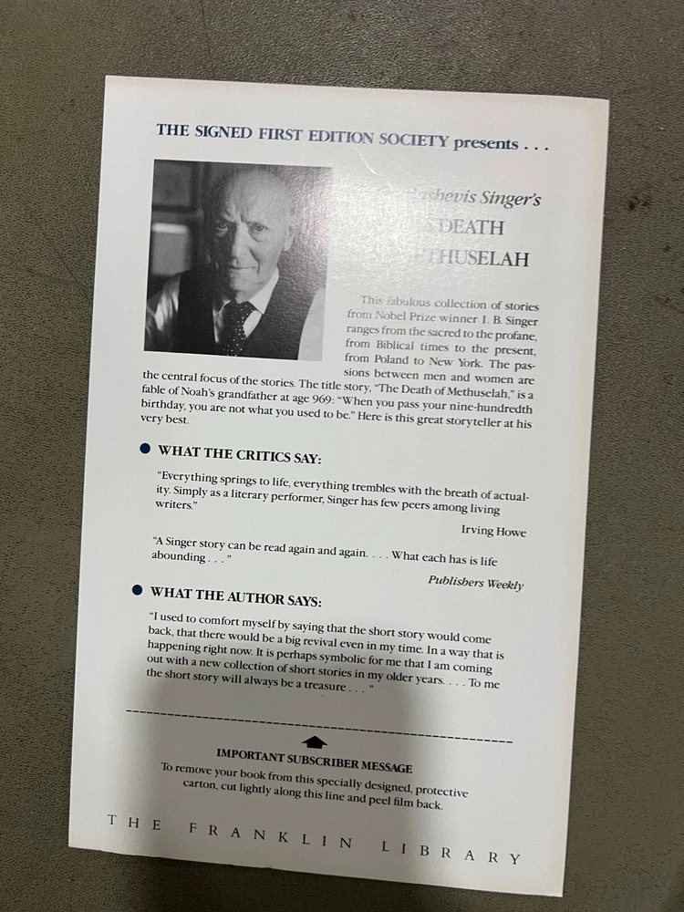 Death of Methuselah - Isaac B. Singer SIGNED Franklin Library 1st Edition Excellent Condition ! New Books get listed daily !!! 100s of Easton Press and Franklin Library books available!! All books get cleaned with a leather cleaner to remove any dust, odor and restore the beauty of leather!! Combined Shipping Discount: USA buyers - every book $1 off International combined shipping: 1 or 2 books - $45 3 or 4 books - $75 5 + books $17 per book 10+ books $13 per book WE SHIP DAILY!! RETURNS: Hassle-Free 30-days return policy and we pay for a return !! Check our Inventory (Link to eBay Store): http://stores.ebay.com/EastonFranklinBooks