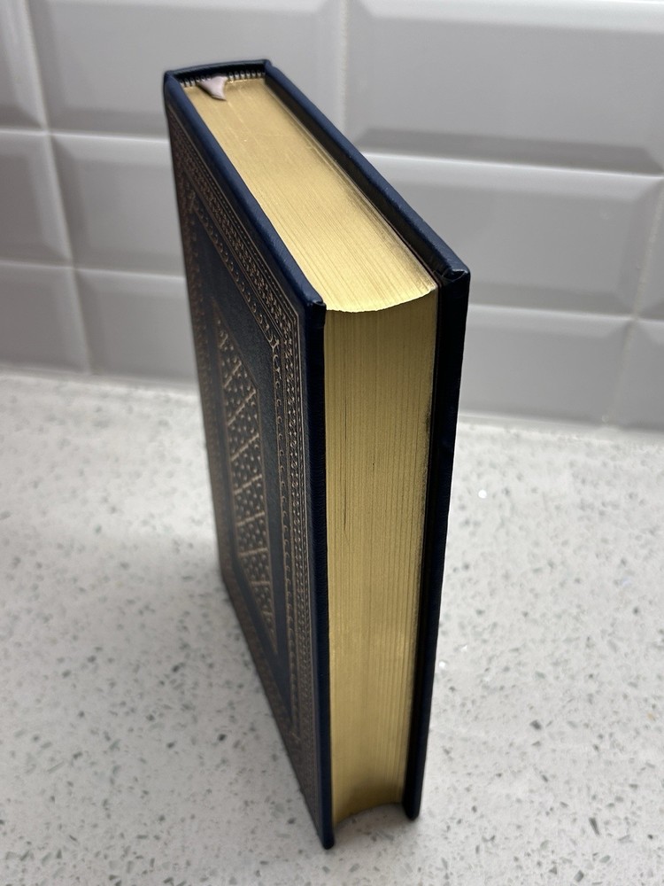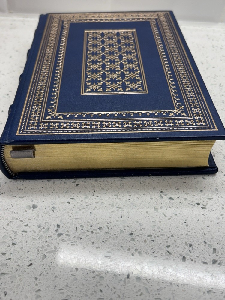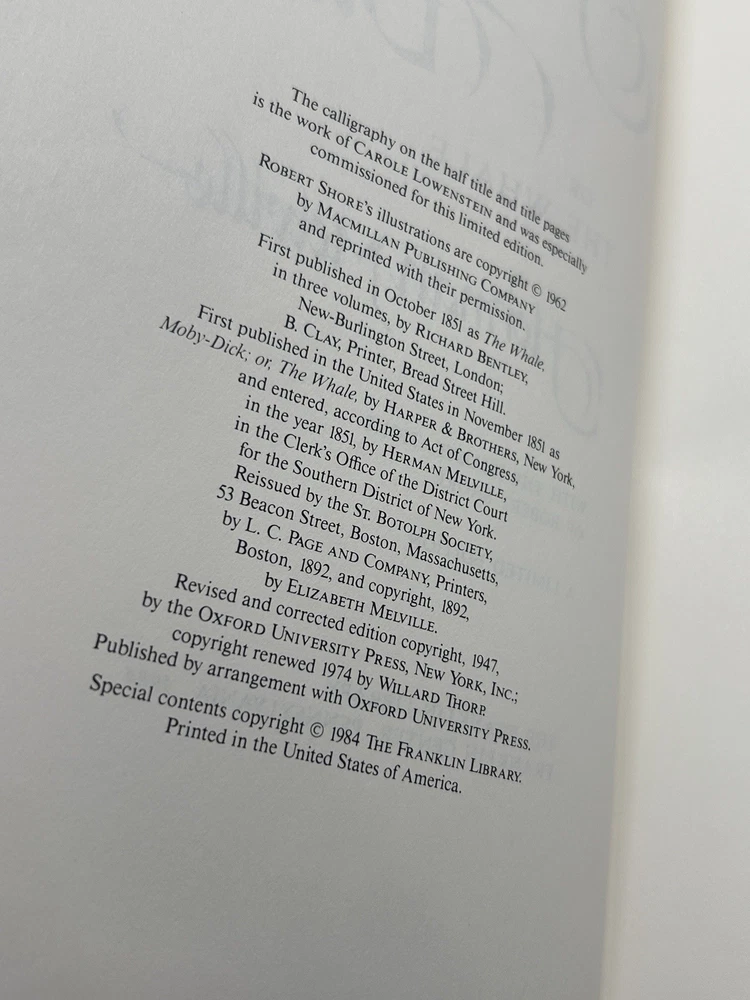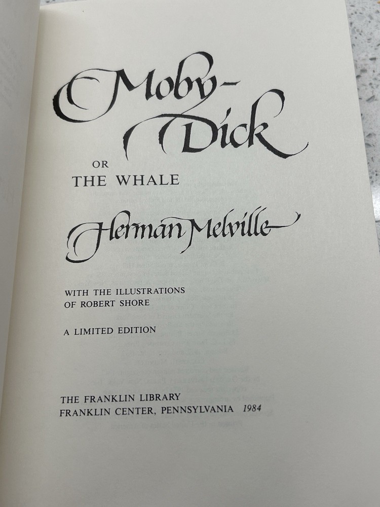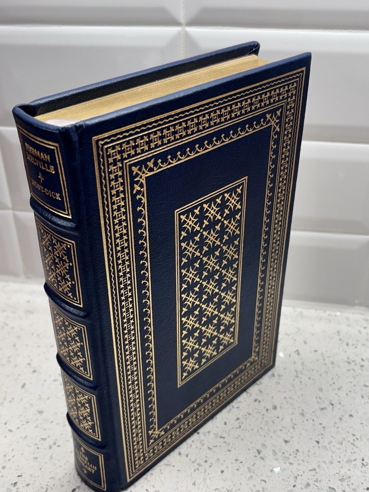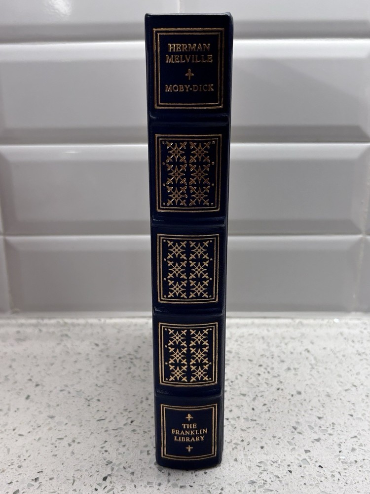 The product is a rare and fine leather-bound edition of "Moby-Dick" by Herman Melville, published by Franklin Library in 1979. This luxury edition includes a portfolio of nineteenth-century whaling prints, features acid-free paper, embossed covers, gold gilt, and a satin ribbon bookmark. The book is a collector's edition with limited availability, making it a valuable addition to any literature and fiction collection featuring works by authors such as Don Quixote, Robinson Crusoe, Huckleberry Finn, and Treasure Island. Made in the USA, this leather-bound edition showcases the classic American novel in a beautifully crafted format.